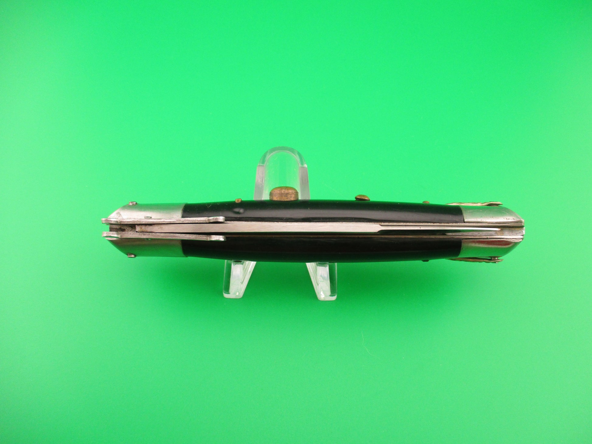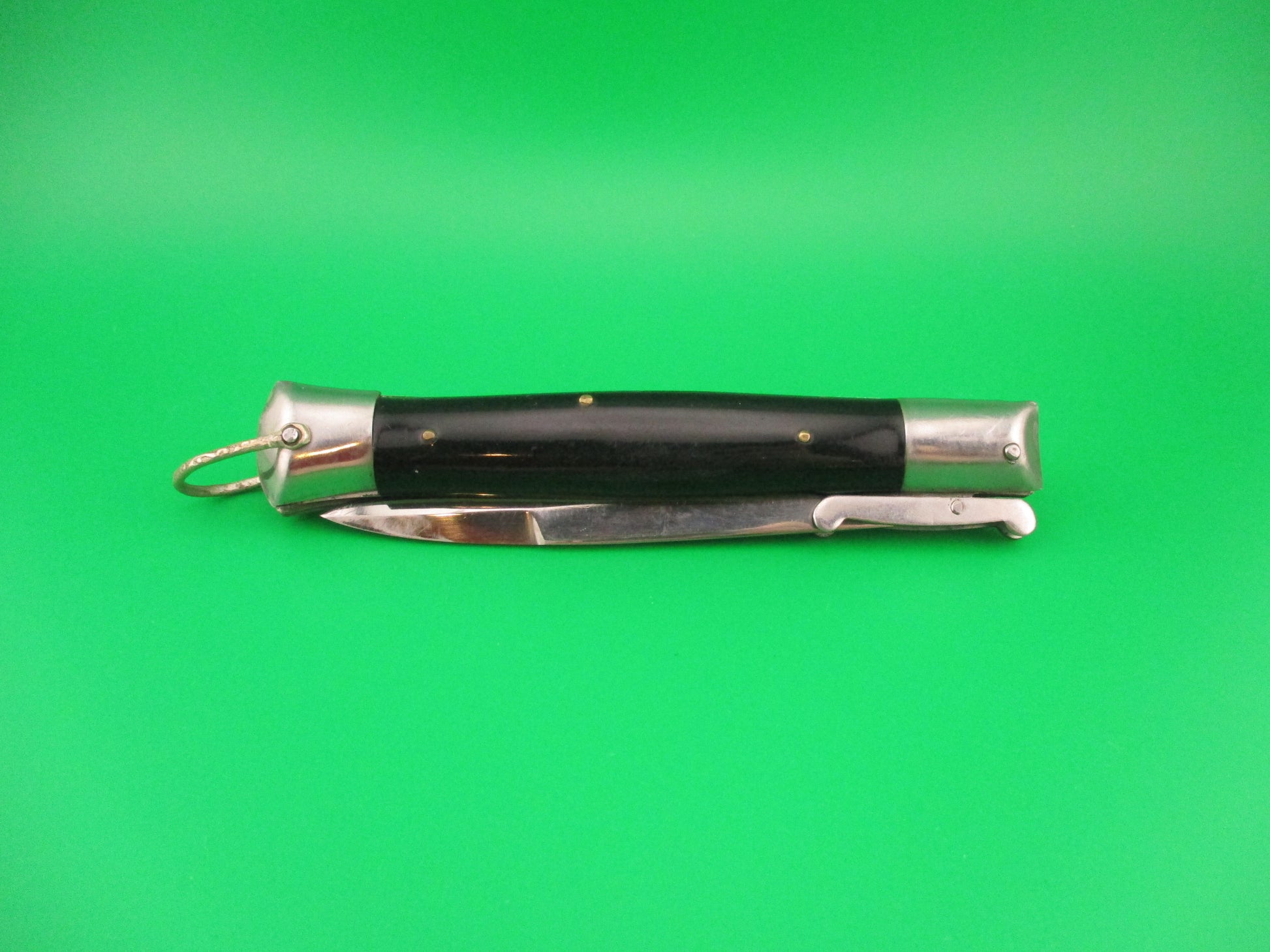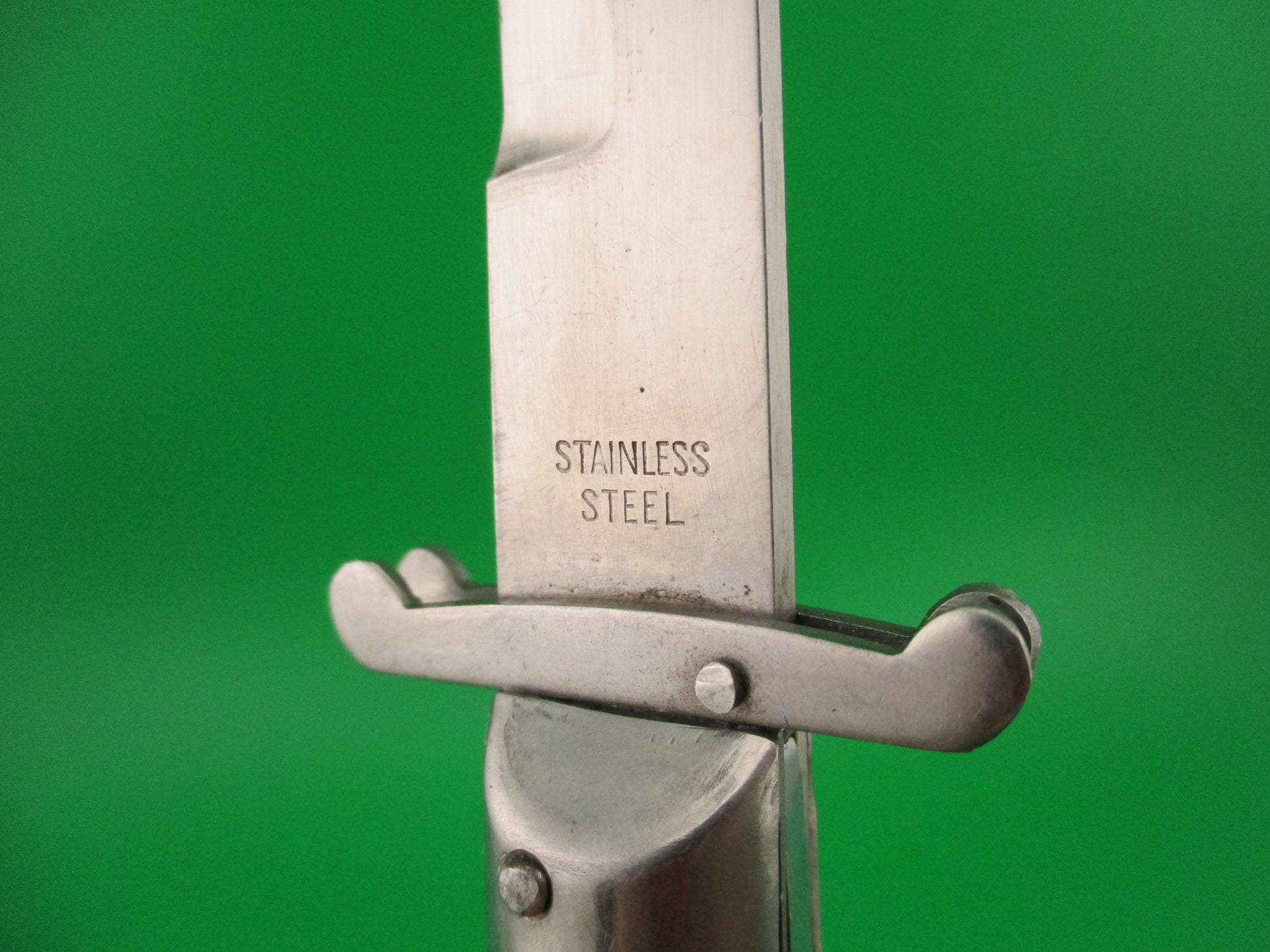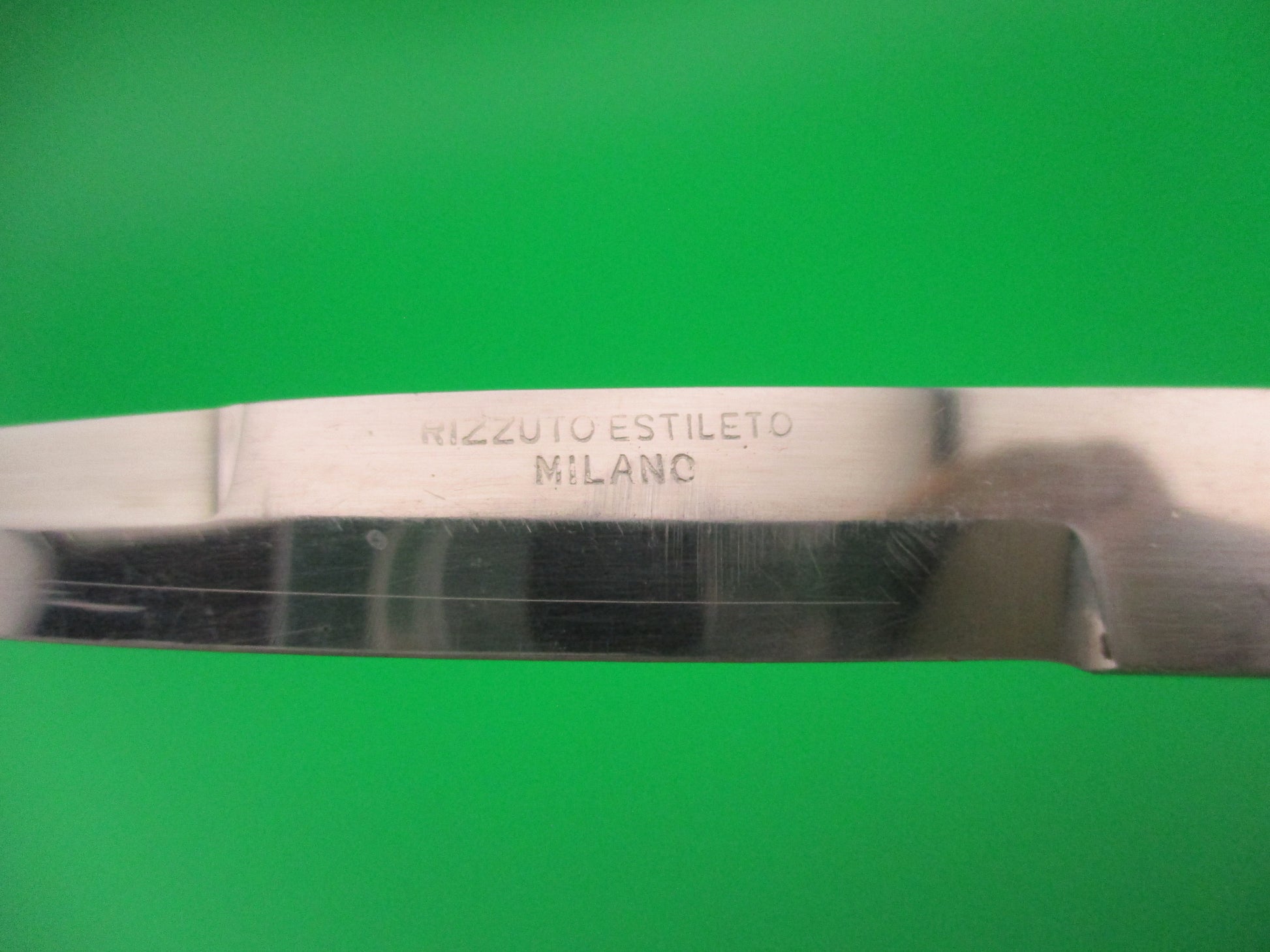 The knife measures 22.1cm (8 11/16 inches) open and 4.75 inches closed with steel liners & bolsters and brass button, safety & pins with nickel silver decorated lanyard ring. The bayonet blade is 98% full, or better with original finish with some light scratches and the ricasso is stamped STAINLESS STEEL with RIZZUTO ESTILETO MILANO stamped on the face below the spine. The black synthetic scales are in great condition with some handling marks/scuffs. The knife works well with the blade tip 1/16 inch above the liners closed, strong snap and tight lockup. No rattle if shaken with blade open (except guards). The safety does work, but a little loose. Nice example of a vintage "Italian style" movie prop switchblade. VG+ condition.