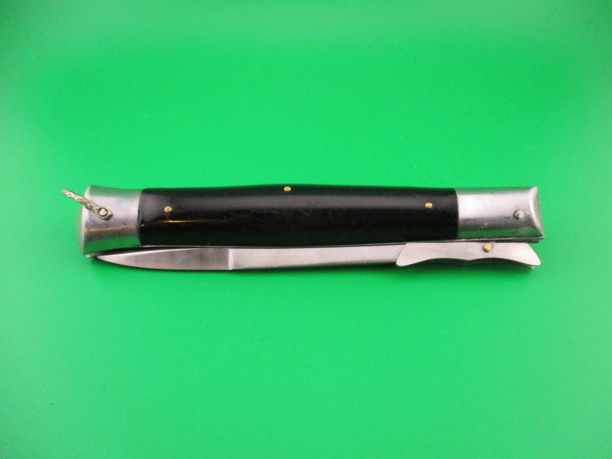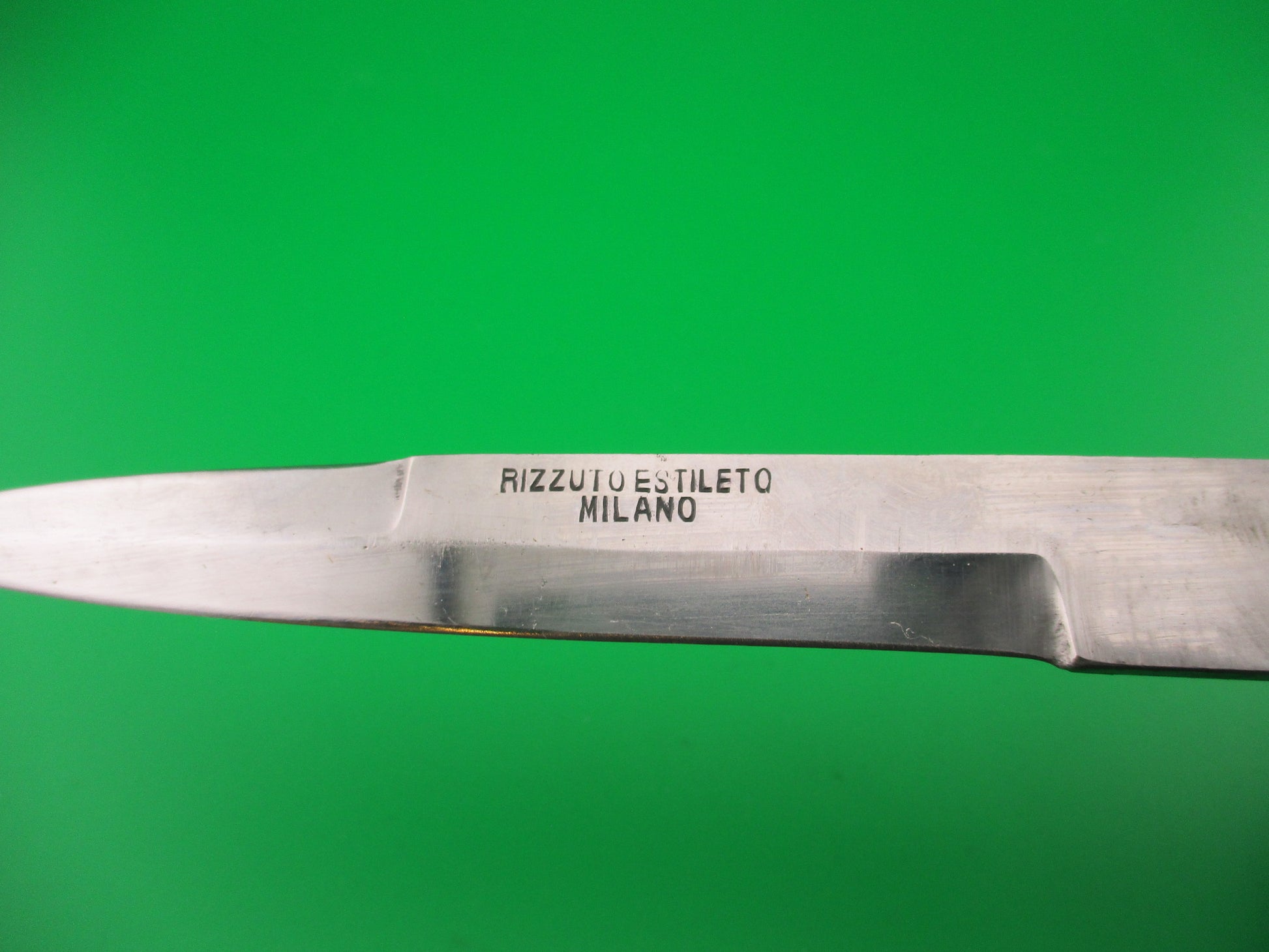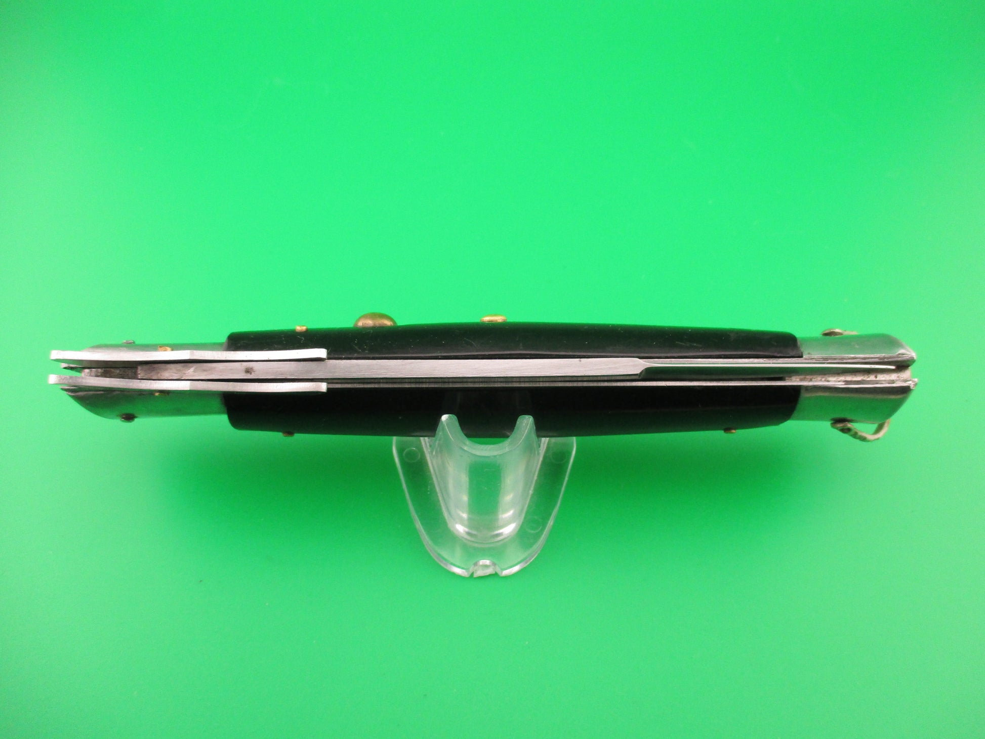 Vintage Rizzuto Estileto Milano 28cm Japanese Batwing Swing guard Black vintage automatic knife made in Japan in the 1960s or 70s and has been a popular knife to use in movies. It measures 27.6cm (10 7/8 inches) open and 5 15/16 inches closed with steel liners & bolsters, nickel silver guards & decorated lanyard ring and brass button & safety cap. The bayonet style blade is 99% full with most of the original factory finish and lots of light scratches and the ricasso is stamped STAINLESS STEEL and it's also stamped RIZZUTO ESTILETO MILANO on the face below the blade spine. The folding guards appear to have been professionally replaced. The black synthetic scales are in excellent condition with light handling marks/scuffs and are held on with 4 brass pins. This is the longer version of the knife being about 1/4" longer closed than most large batwings. The knife works well with blade tip even with the liners closed, good snap and average lockup with about 3/16" down at the tip, that springs back when you let go. Does rattle if shaken with blade open, as most of these do. Safety works. EX- condition.
