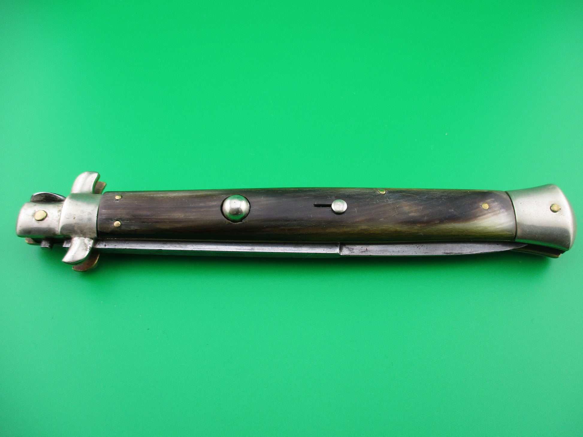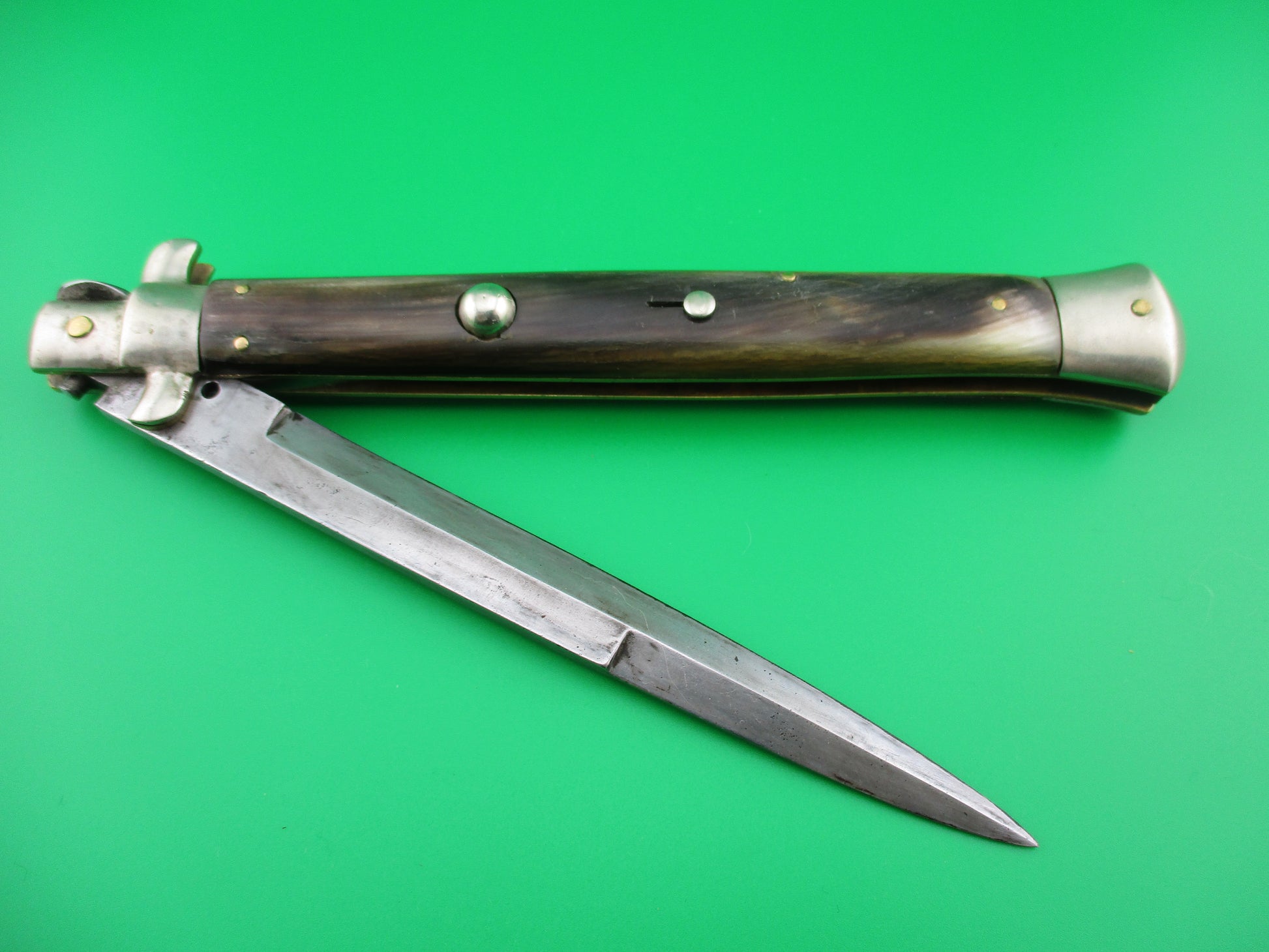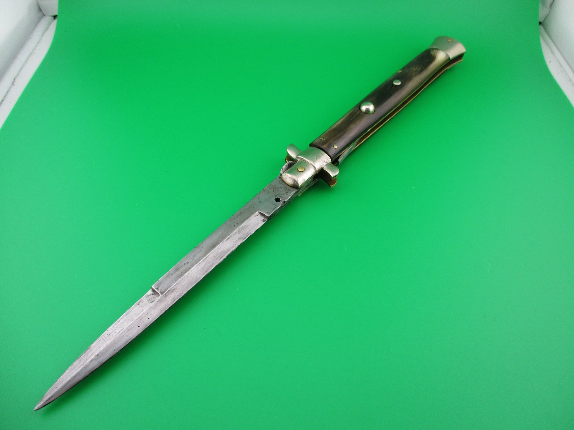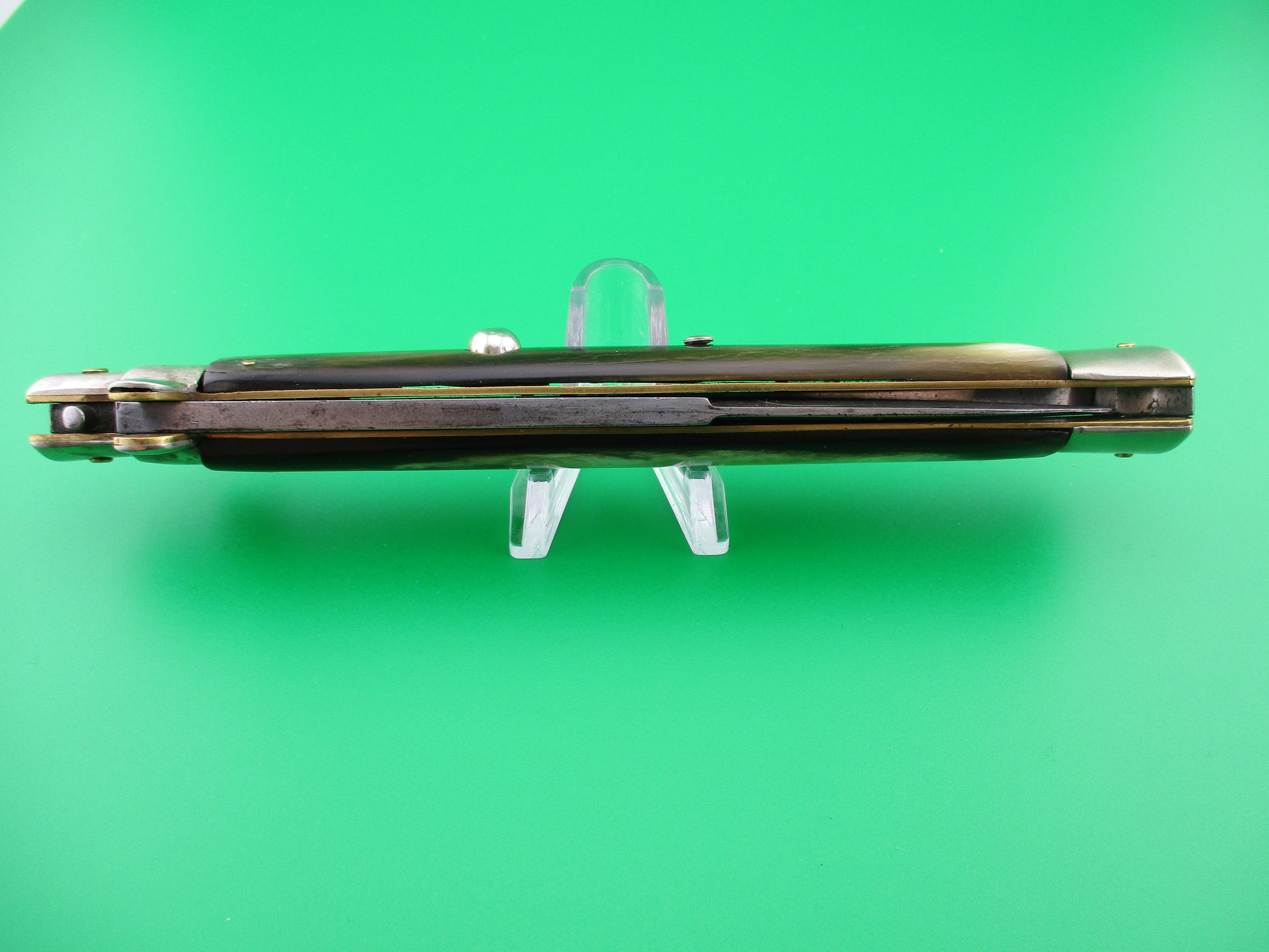 This is a 1950s Italian picklock with hoen scales and bayonet style blade that is marked ROMO with an arrow through it over ITALY. This is a Gorgeous old picklock! The blade is 97% full with patina, some light peppering & some light scratches The knife measures 7 1/8 inches closed and a hair under 13 inches open (33cm) with brass liners and nice horn scales (handles) that range from dark brown to tan with streaks of cream and green. Thick backspring and blade base measuring just under 5mm. The knife functions perfectly with blade tip below the liners when closed, good snap and good lockup. Safety works. This is a Handful of vintage Italian steel and horn! It's a real beauty.