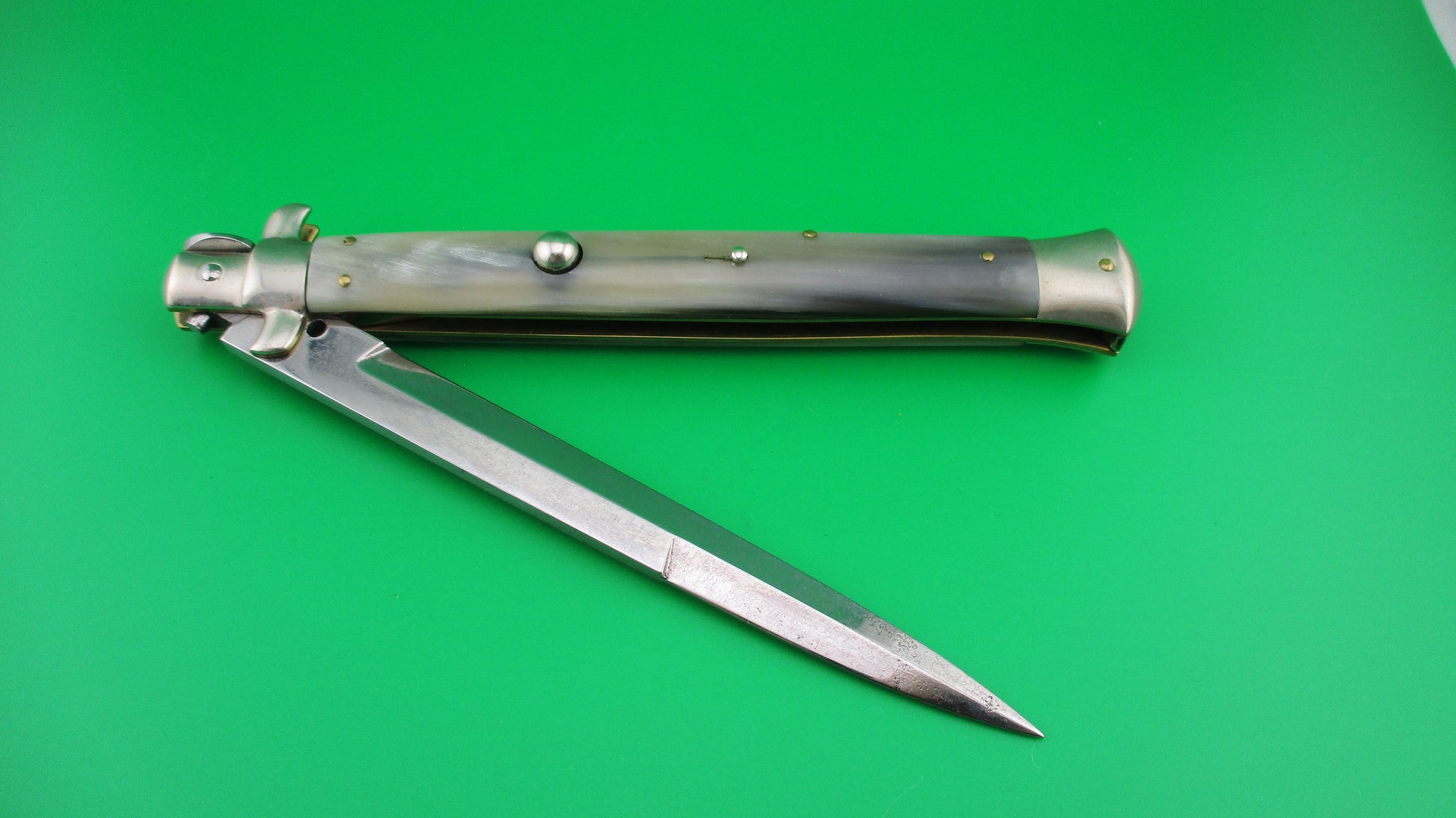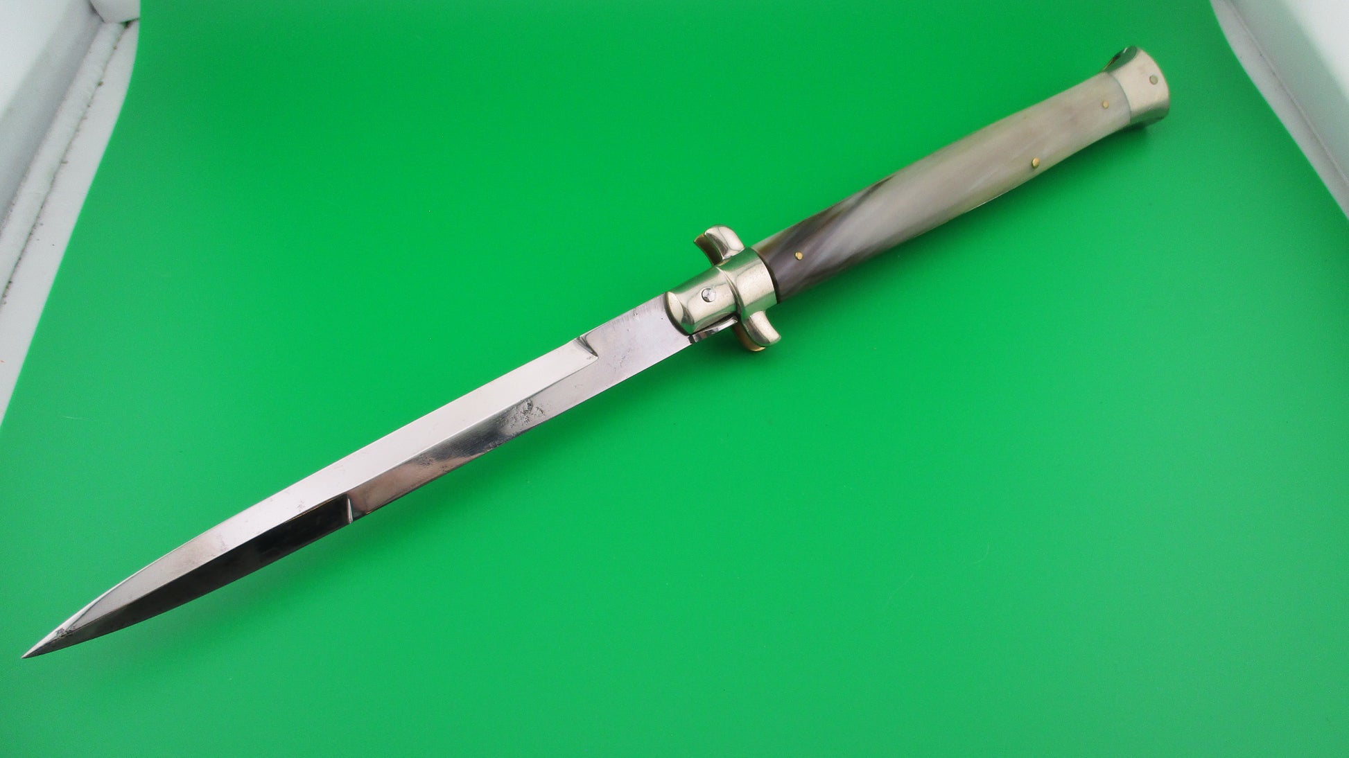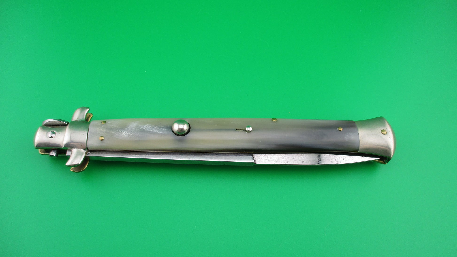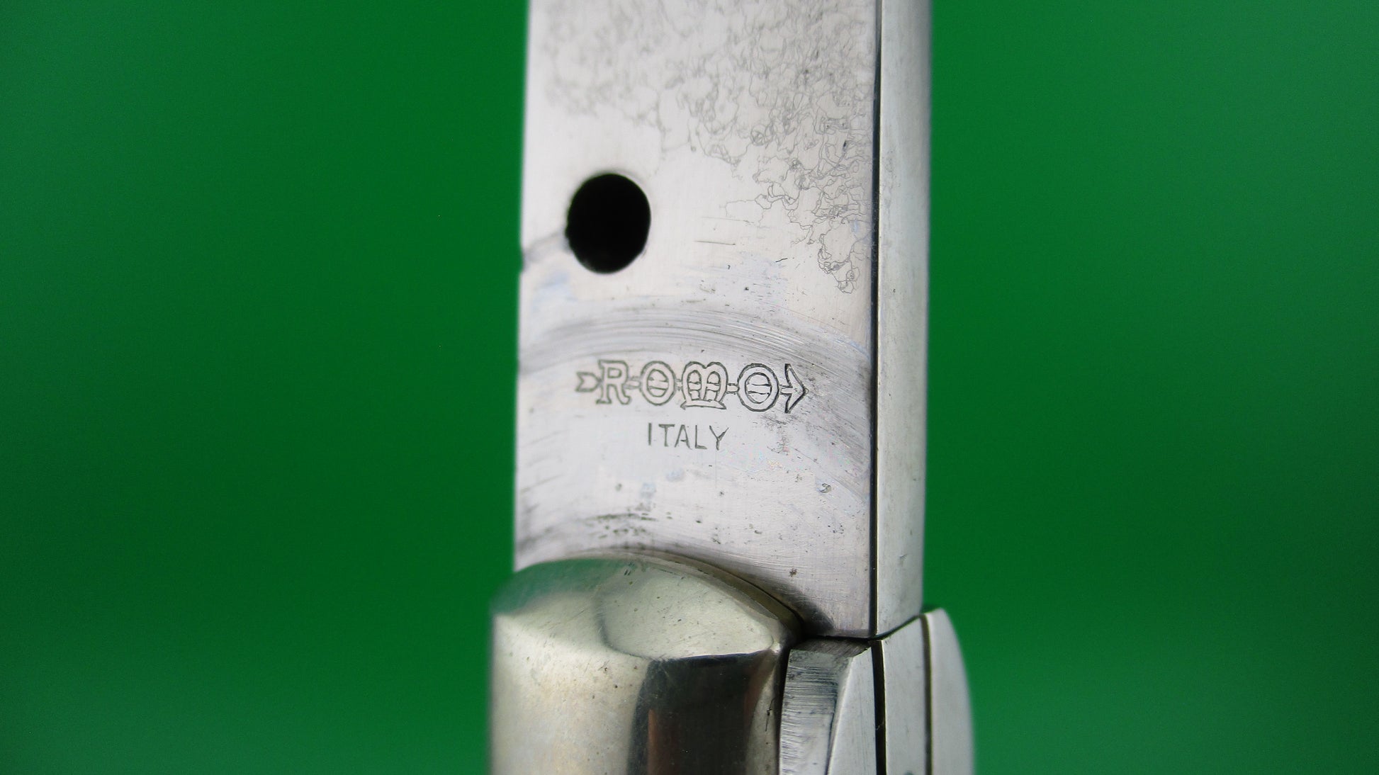 ROMO ITALY 33cm Italian Picklock Milky Light Horn vintage 1950s automatic knife measures 33.5cm (13 3/16 inches) open with D stamped brass liners and nickel silver bolsters, button and safety cap. The bayonet style blade is 99% or better with much of the original factory finish intact and some spotting and the ricasso is stamped ROMO ITALY. The genuine horn scales are Gorgeous with light translucent "milky" horn in excellent condition. I think it was a "Monday knife" because the safety slot is not perfectly done, but small detail on such a Beautiful knife! The knife works great with blade tip deep in the well closed, strong snap and excellent lockup with just a hint of movement at the tip. Safety works. EX condition.