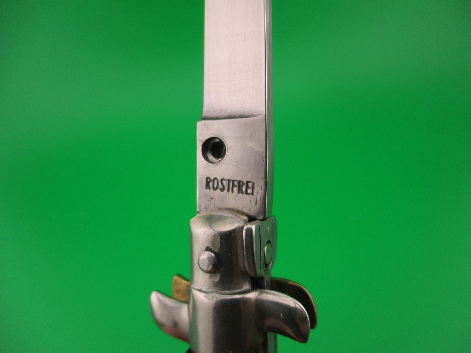 Vintage ROSTFREI 14cm Italian Swivel bolster Swedge Horn automatic knife made in Italy post 1990. The knife measures 13.8cm (5 7/16 inches) open and just over 3 inches closed with brass liners and steel bolsters, button & safety cap with brass lined guards on back top bolster. The swedge grind blade is 100% full with original finish and the ricasso is stamped ROSTFREI. The genuine horn scales are in great condition and black with white & tan streaks. The knife works great with blade tip well below liners closed, good snap and very good lockup with less than 1/16" movement at the tip. Does rattle if shaken with blade open. Safety works if you hold it in position, but otherwise moves when the button is pressed. EX- condition.