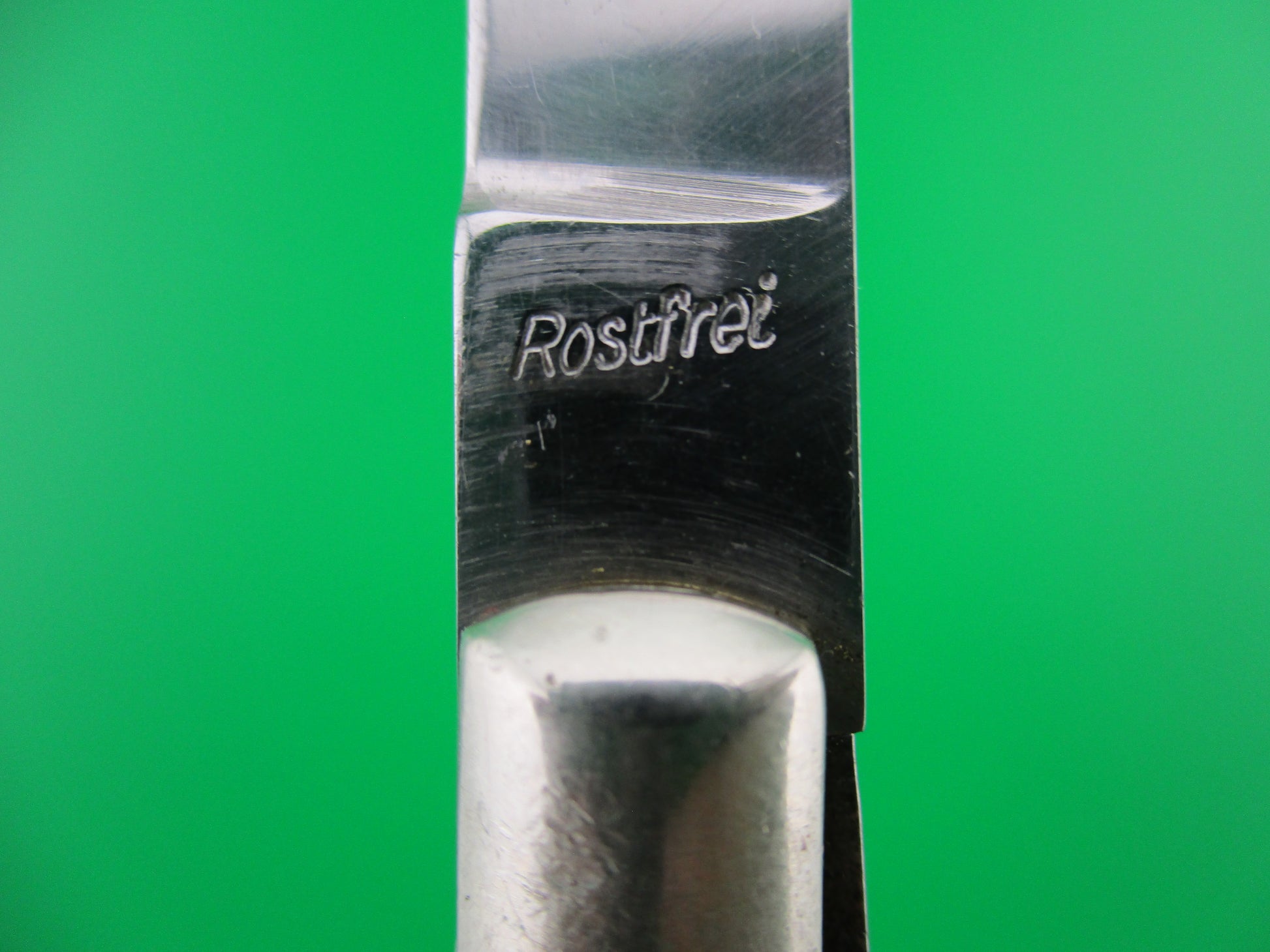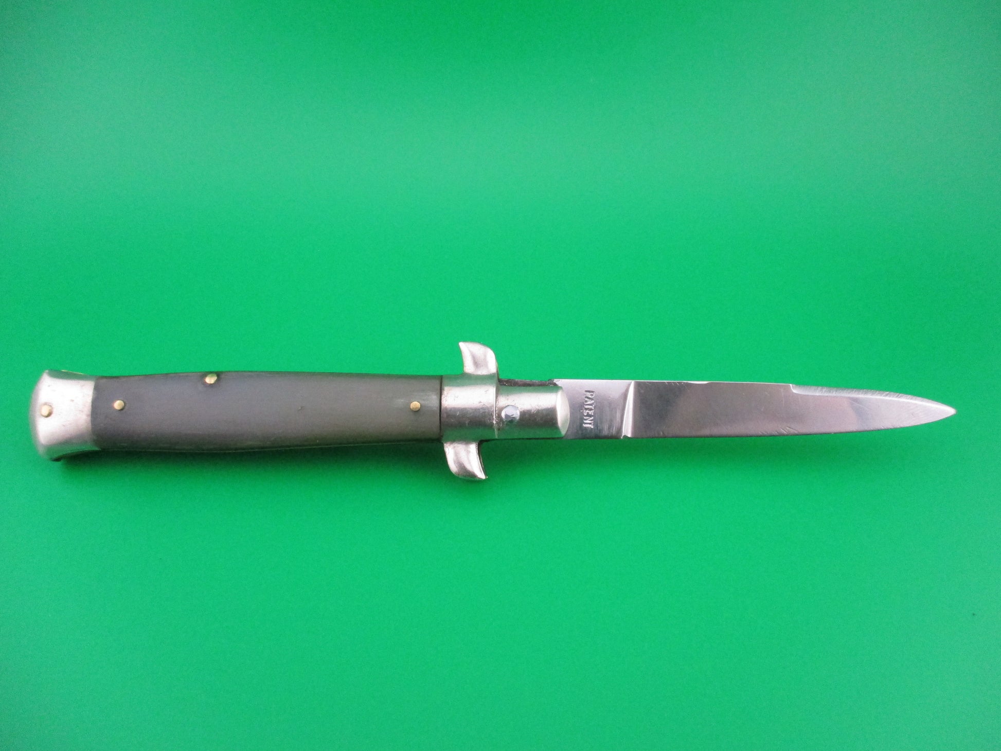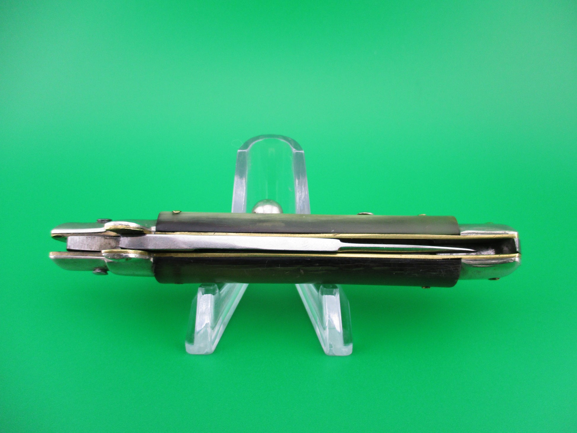 Vintage Italian BOBC (Button open, button close) stiletto with horn scales (handles). This knife was made in Italy, most likely during the 1960s or 70s. Knife measures 17cm (6 5/8 inches) open with D stamped brass liners and nickel silver bolsters, button and safety cap The flat grind swedge blade is mostly full with original factory finish and stamped Rostfrei diagonally (slant) on the front and PATENT on the rear ricasso with some scratches and sharpening marks. This knife is built with the same quality and materials as the 1950s Italian picklocks. The scales are light colored green horn with some cream streaks in great condition. The knife works perfectly with the blade tip sitting deep and centered when closed, strong snap and good lockup when open. Great old vintage Italian BOBC switchblade knife. Safety works. EX- condition.