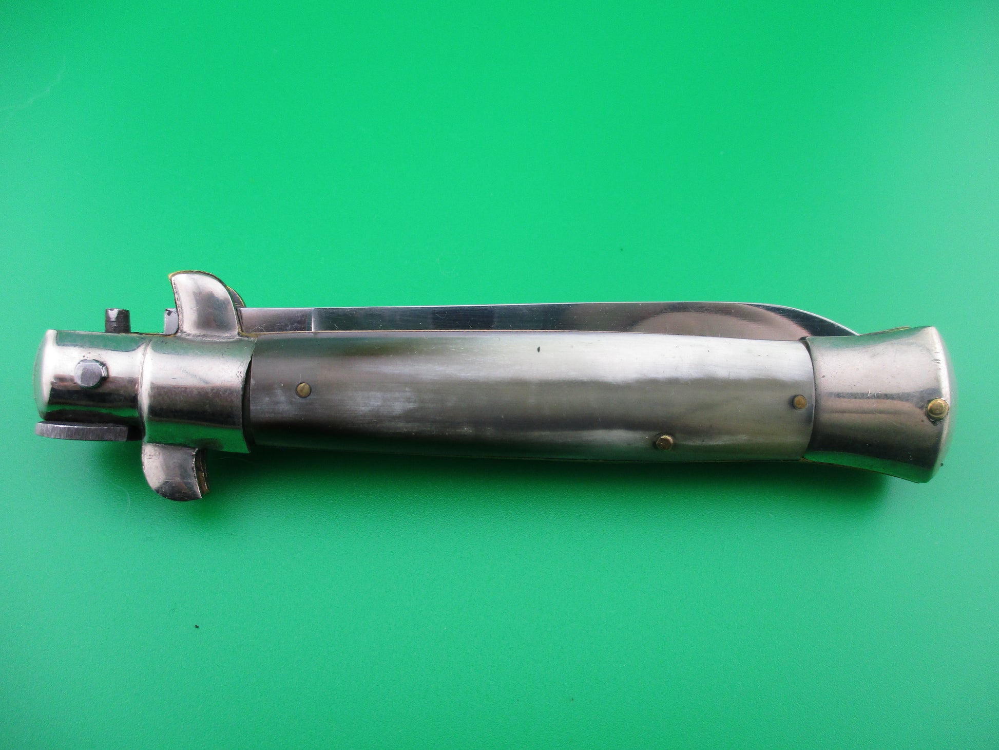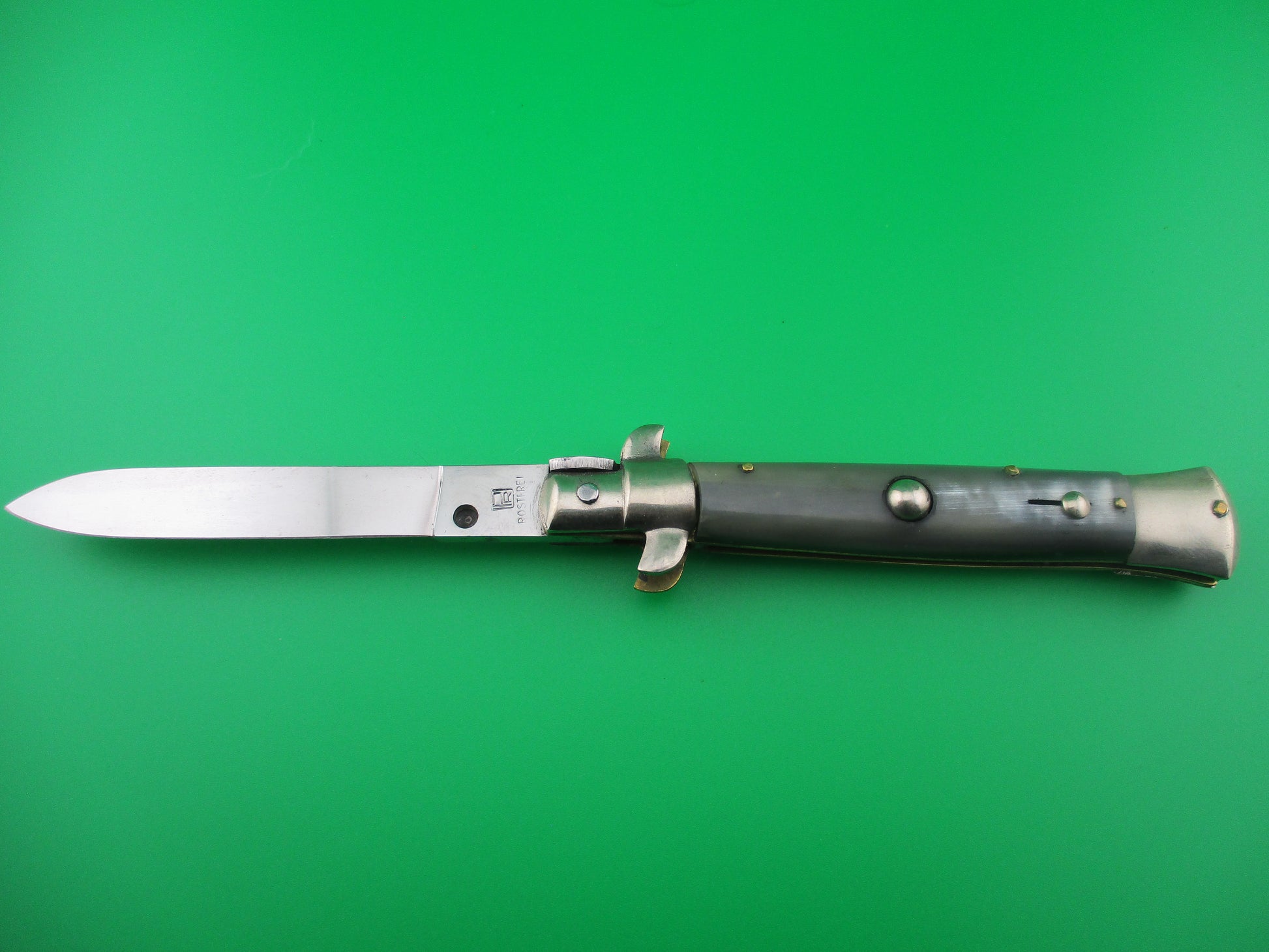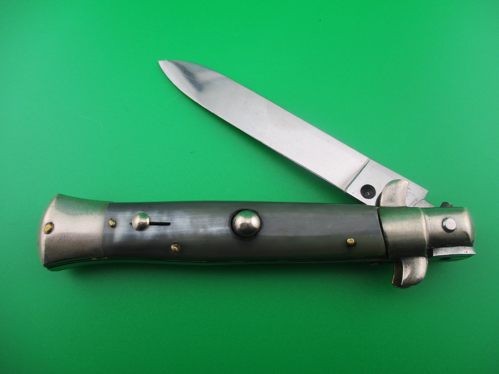 This is a gorgeous vintage Rosa Uliana Primo 20cm (8 inches) open switchblade from the 1960s. It has the less common Spear point blade which is more rounded at the tip than the standard flat grind blade found on most of these transitional Italian switchblades. This knife is in nearly new condition! The blade is full with all of the original factory finish! Gorgeous green/gray/white horn with dark brown streaks. Nickel silver bolsters, button and safety cap. Really Great knife!