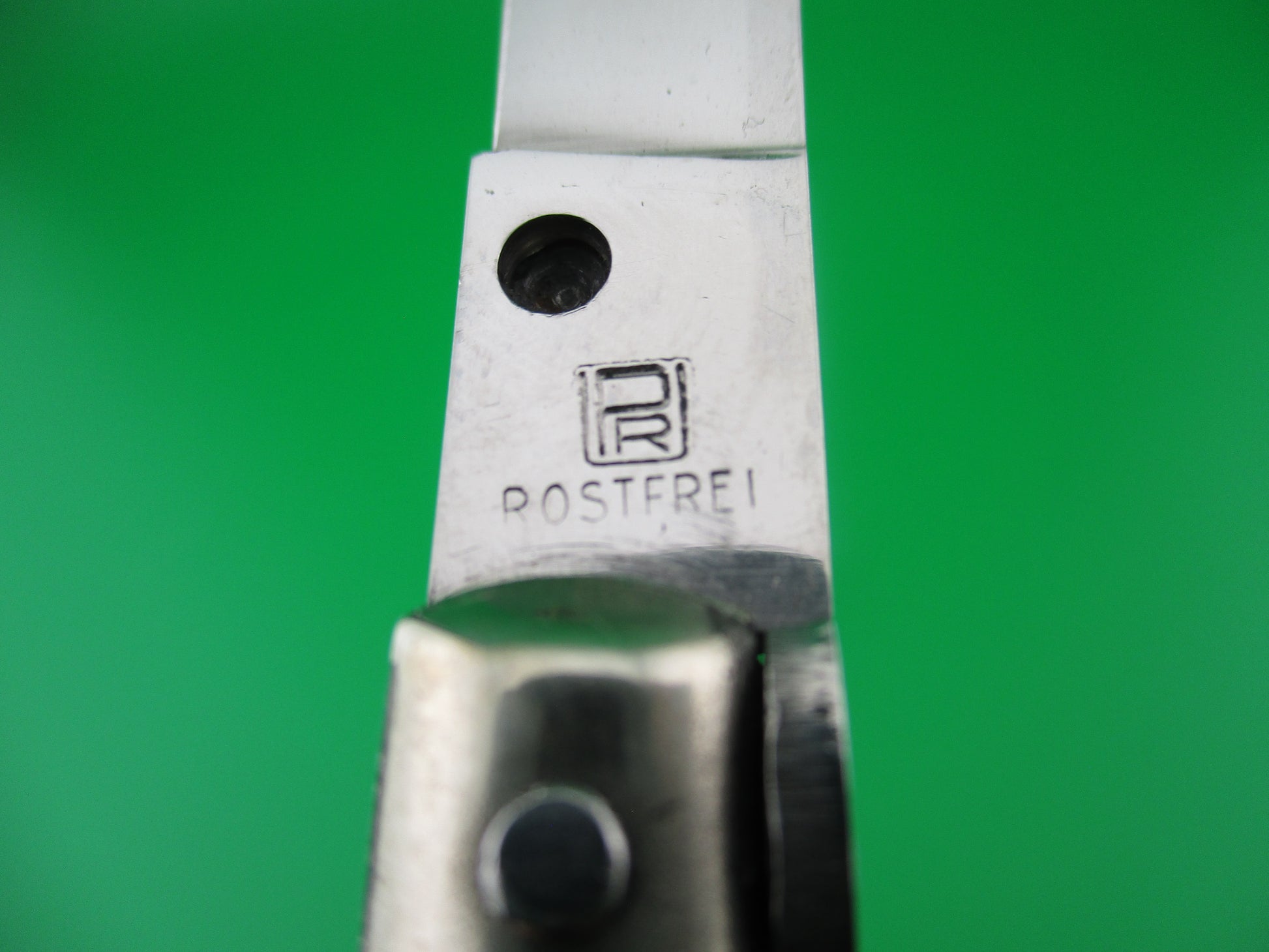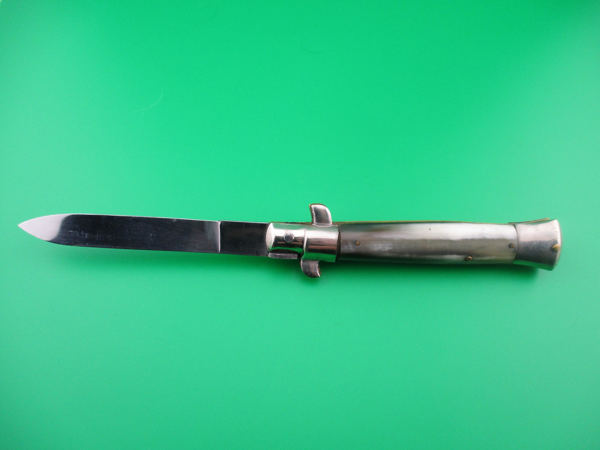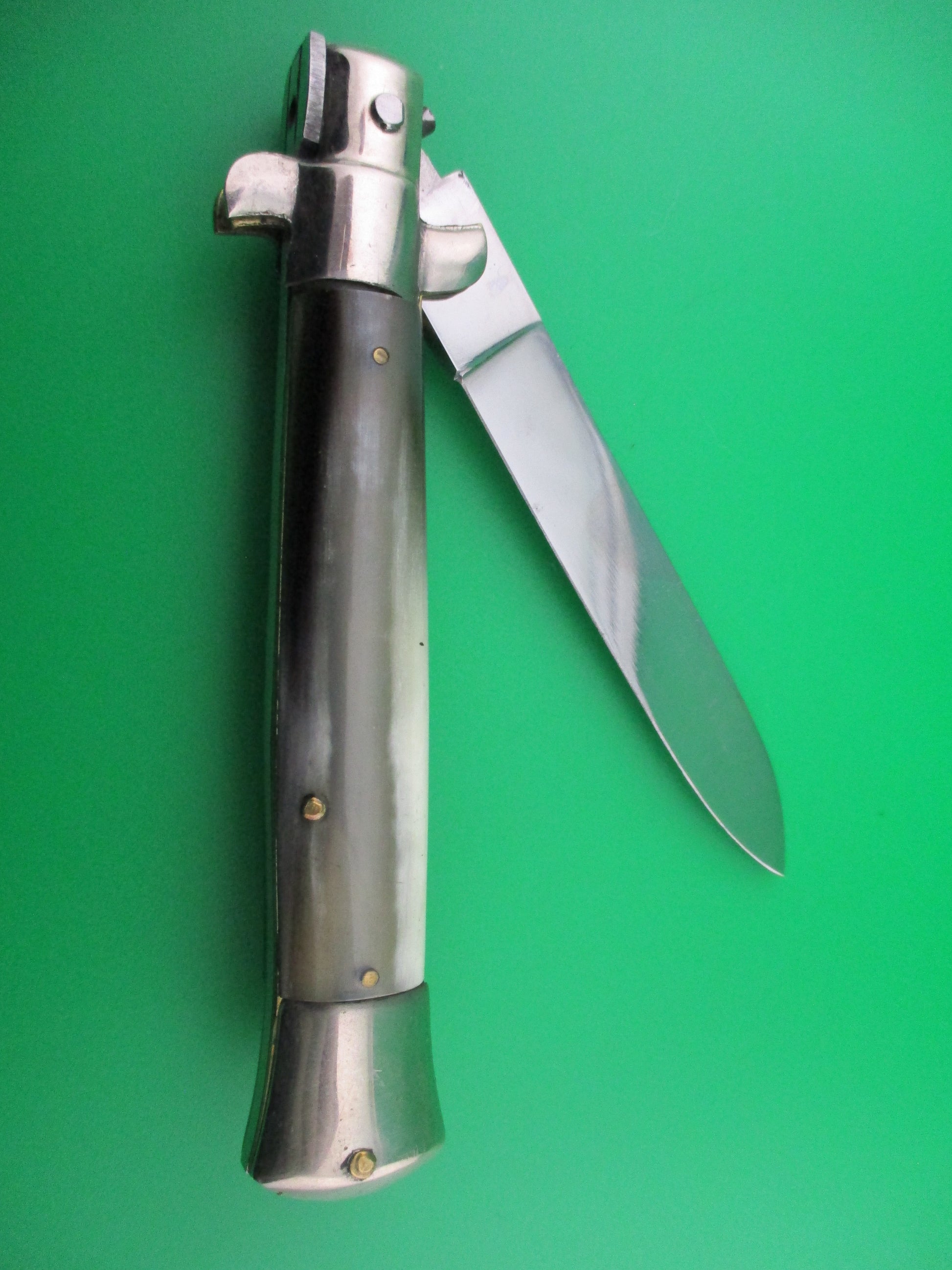 This is a gorgeous vintage Rosa Uliana Primo 20cm (8 inches) open switchblade from the 1960s. It has the less common Spear point blade which is more rounded at the tip than the standard flat grind blade found on most of these transitional Italian switchblades. This knife is in nearly new condition! The blade is full with all of the original factory finish! Gorgeous green/gray/white horn with dark brown streaks. Nickel silver bolsters, button and safety cap. Really Great knife!