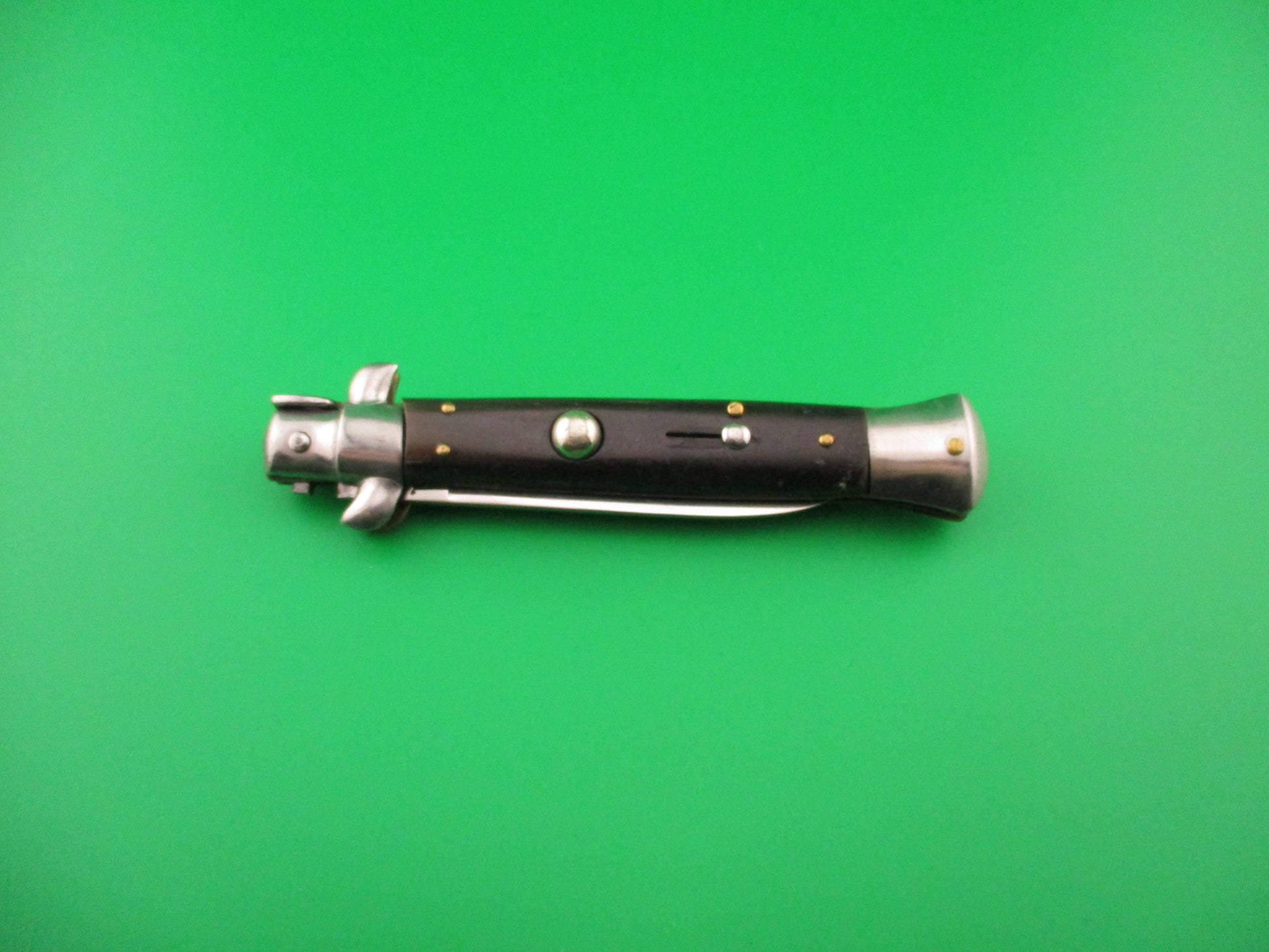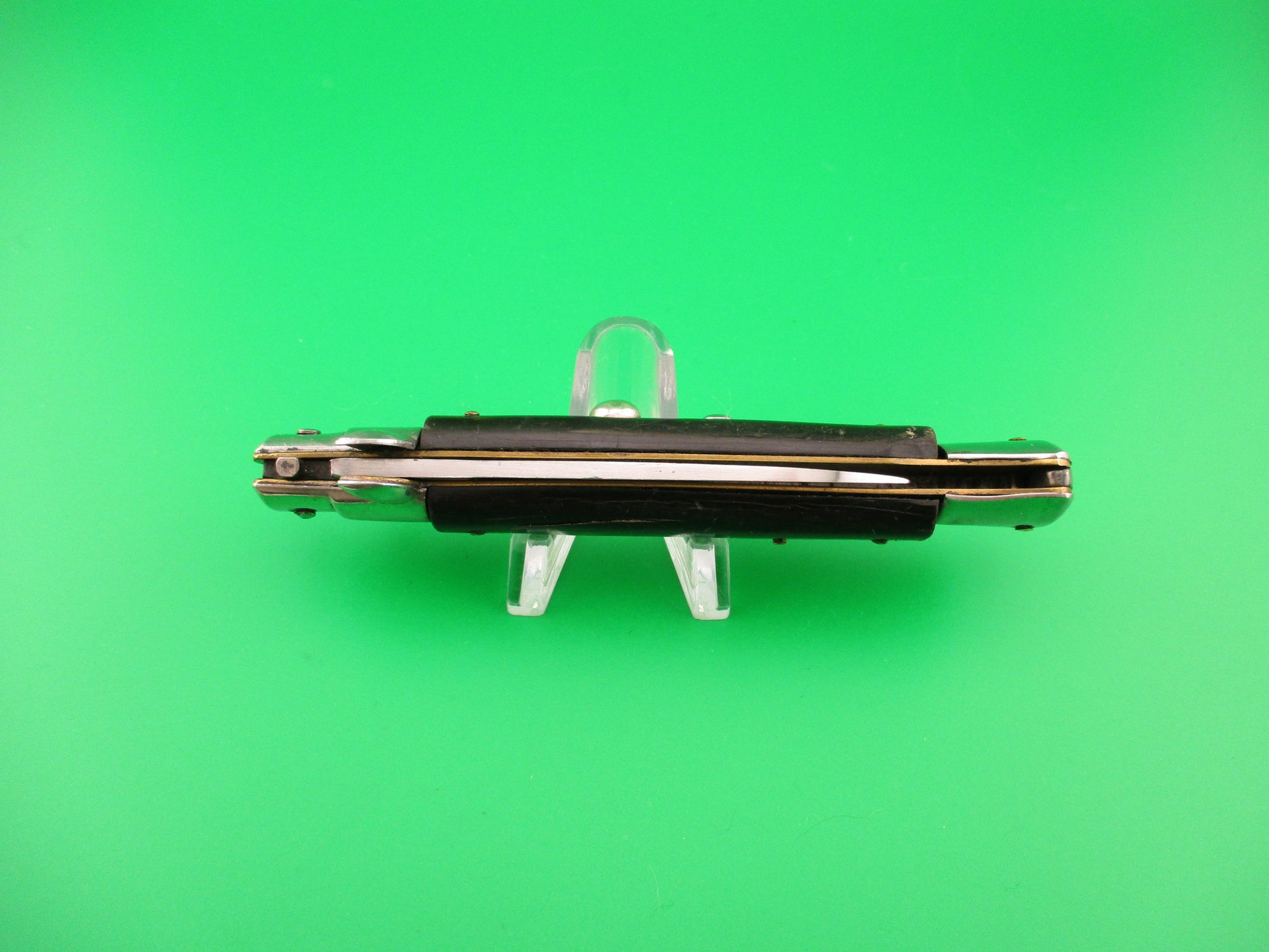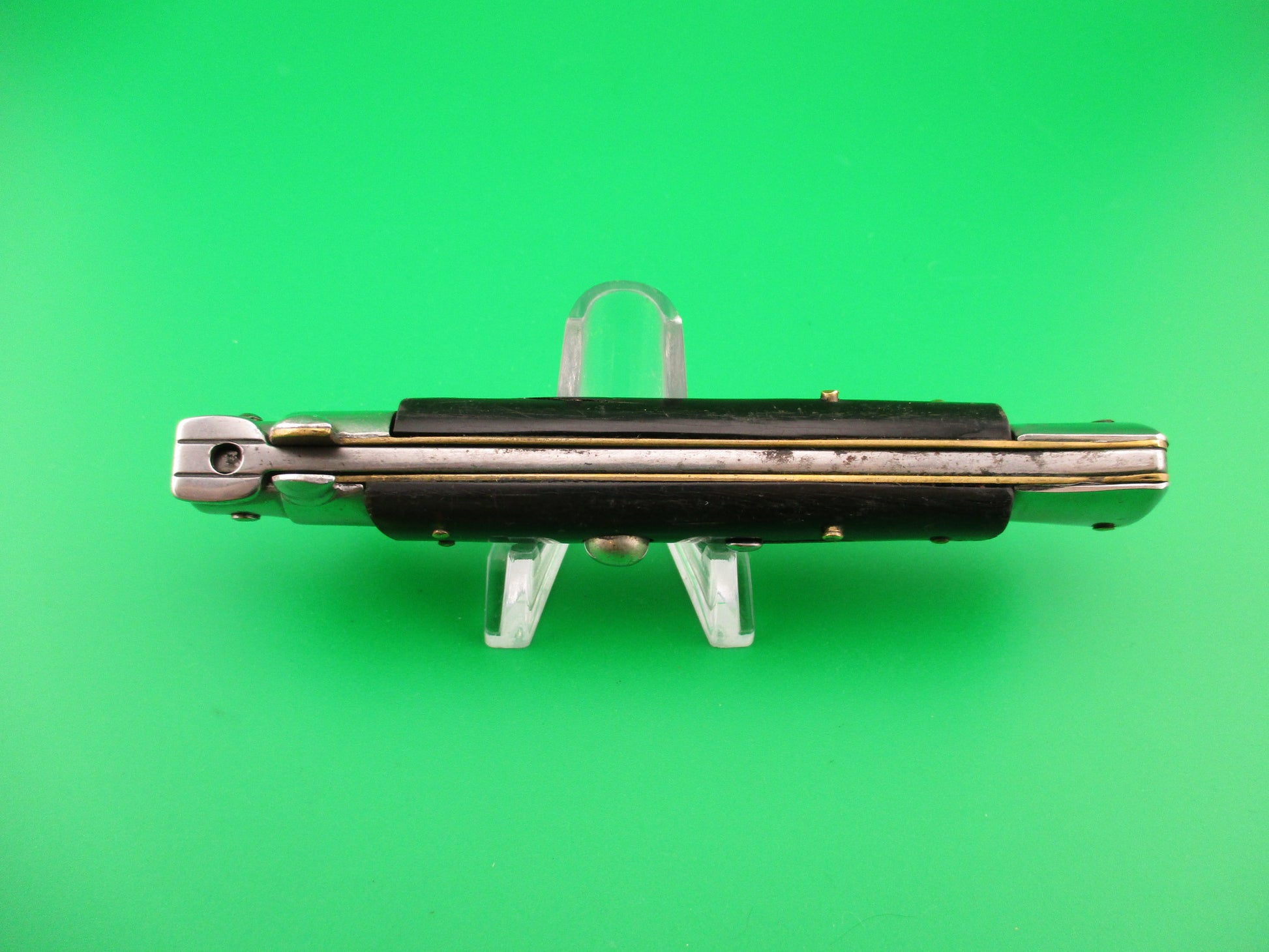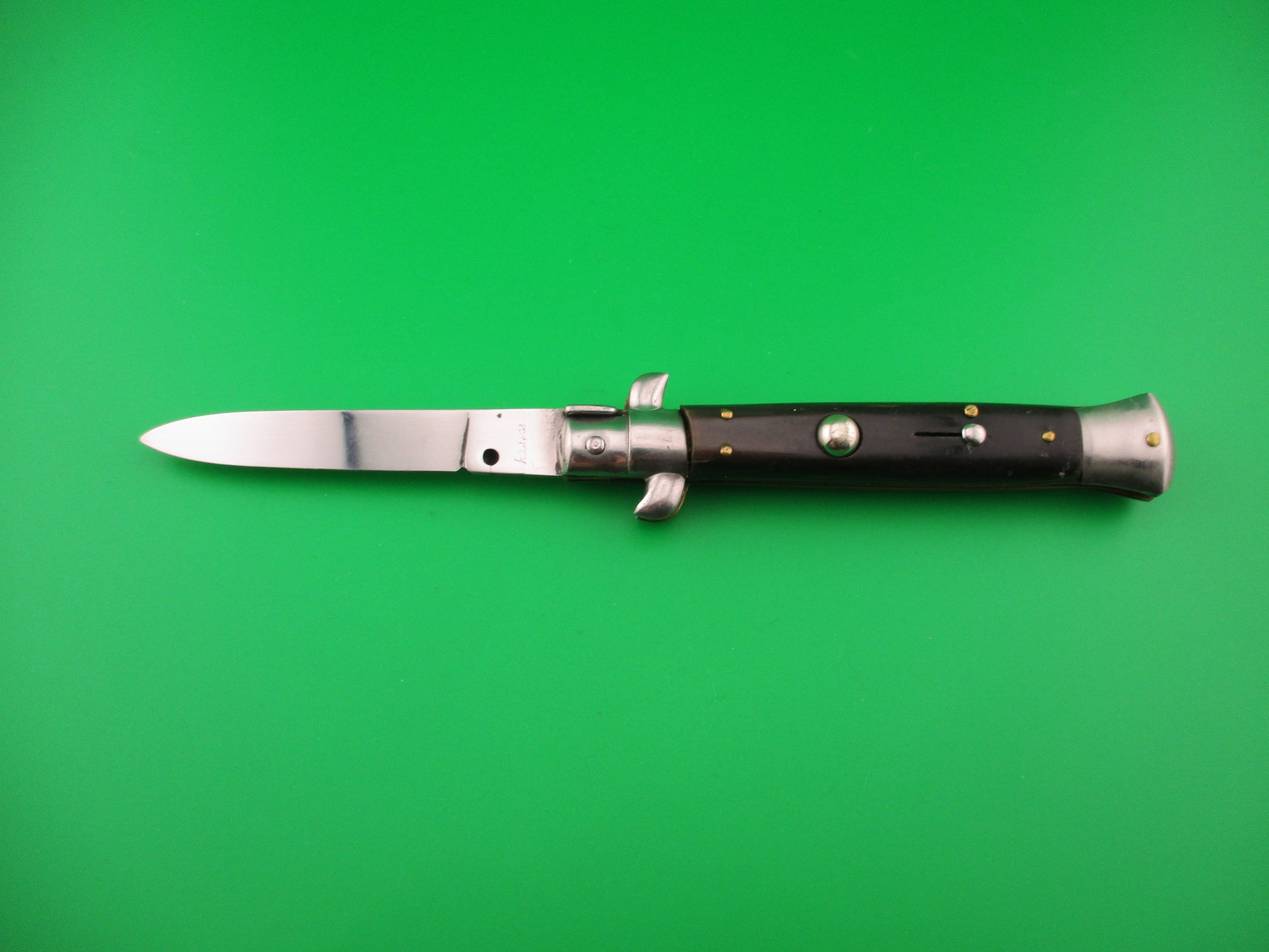 Vintage Rostfrei 21cm Italian Swivel bolster automatic knife made in Italy likely in the 1980s with shorter blade for export to Germany in compliance with German laws at the time. The knife measures 21cm (8.25 inches) open and 4 7/8 inches closed with brass liners and one nickel silver bolster (top rear) & button, with 3 steel bolsters & safety cap. The flat spear point blade is 100% full with original finish and the ricasso is stamped Rostfrei in script. The genuine horn scales are in good condition with some light scuffs & scratches from use and are mostly black with some brown streaks. The knife works well with blade tip deep & centered closed, strong snap and good lockup open with about 1/16" movement at the tip. Does not rattle if shaken with blade open. Safety works. EX- condition.
