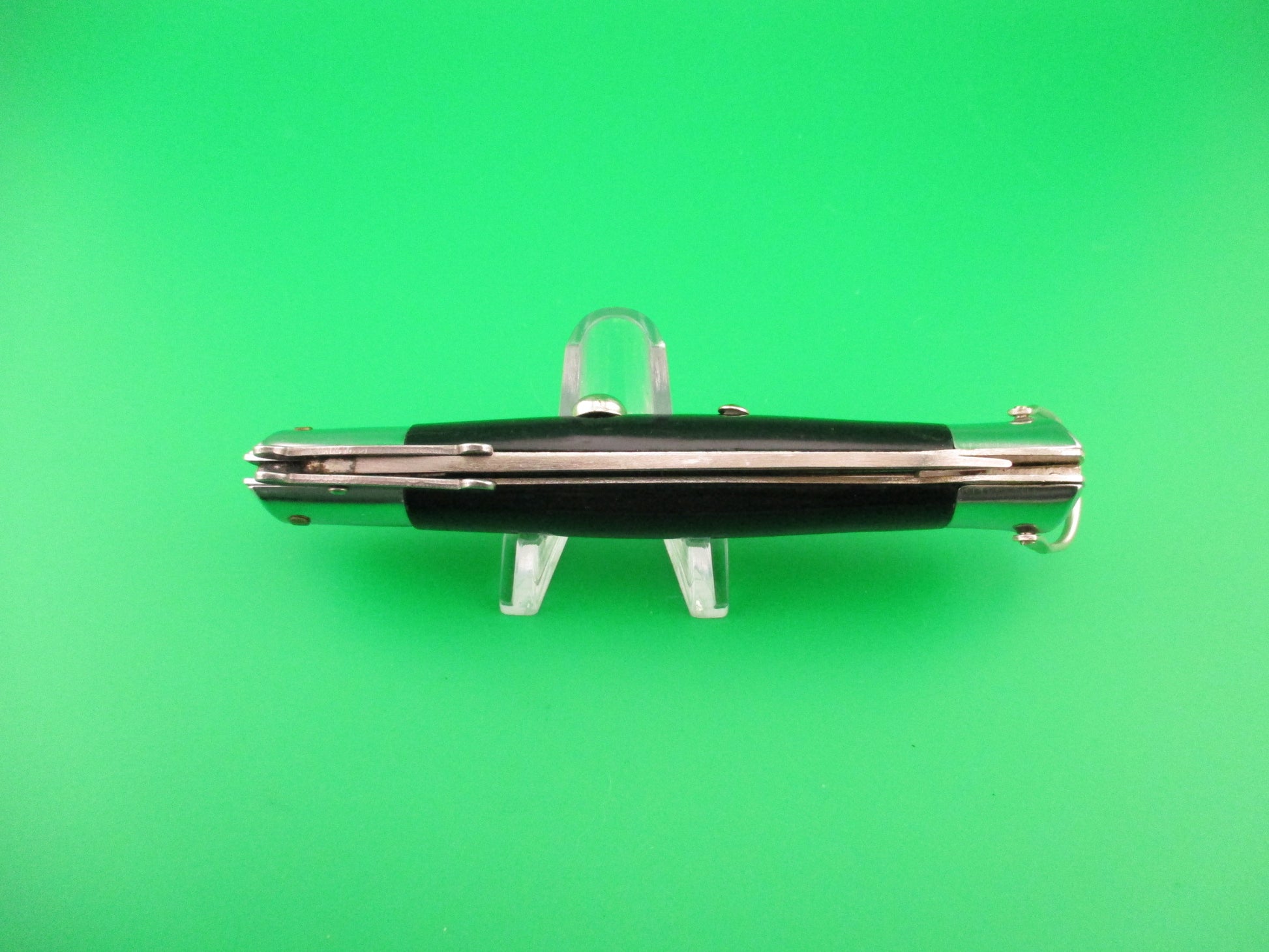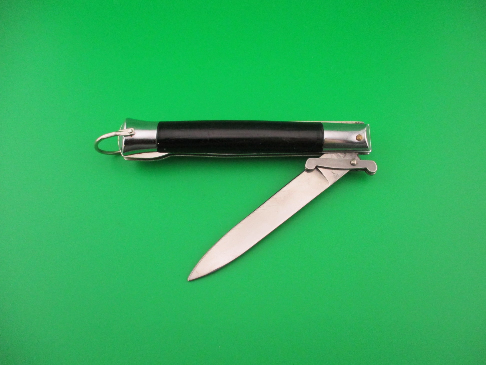 STAINLESS STEEL 22cm vintage Korean Rizzuto clone automatic knife most likely made in the 1970s or 80s and fondly referred to as a Korizzy. The knife measures 22cm (8 5/8 inches) open and 4 3/4 inches closed with steel liners, bolsters, guards & button with nickel silver lanyard ring. The flat spear point blade is 99% full or better with original factory finish with some light scratches and the ricasso is stamped ROSTFREI. The smooth black synthetic scales are in good condition with some scuffs & handling marks. The knife works well with the blade tip even with the liners closed, good snap and very good lockup open with a hint of down movement at the tip that springs back when you let go. Doesn't rattle when shaken with the blade open except for the folding guards. VG condition.