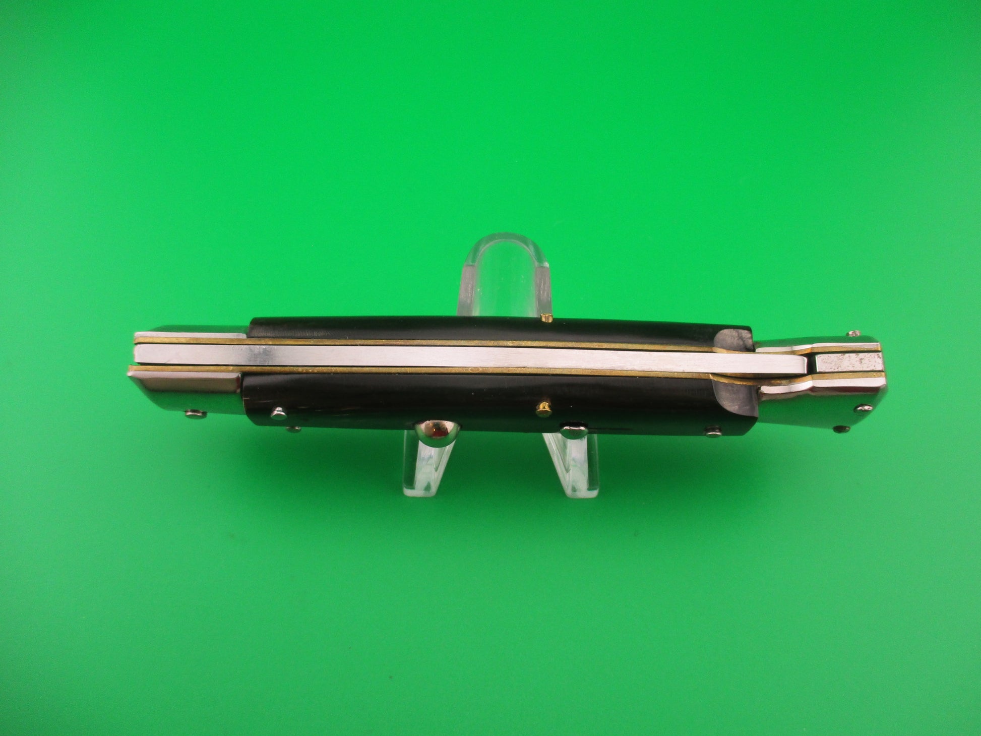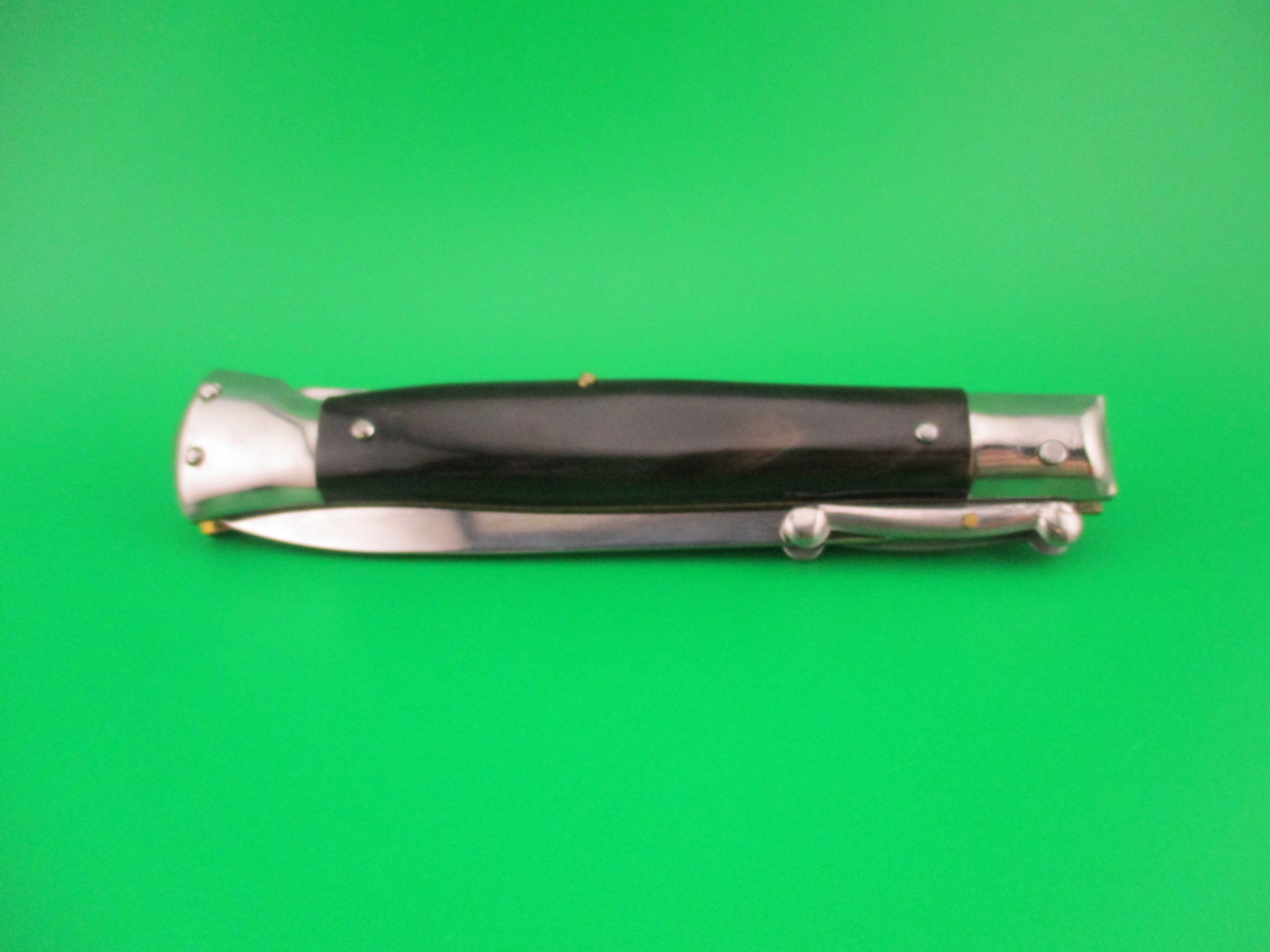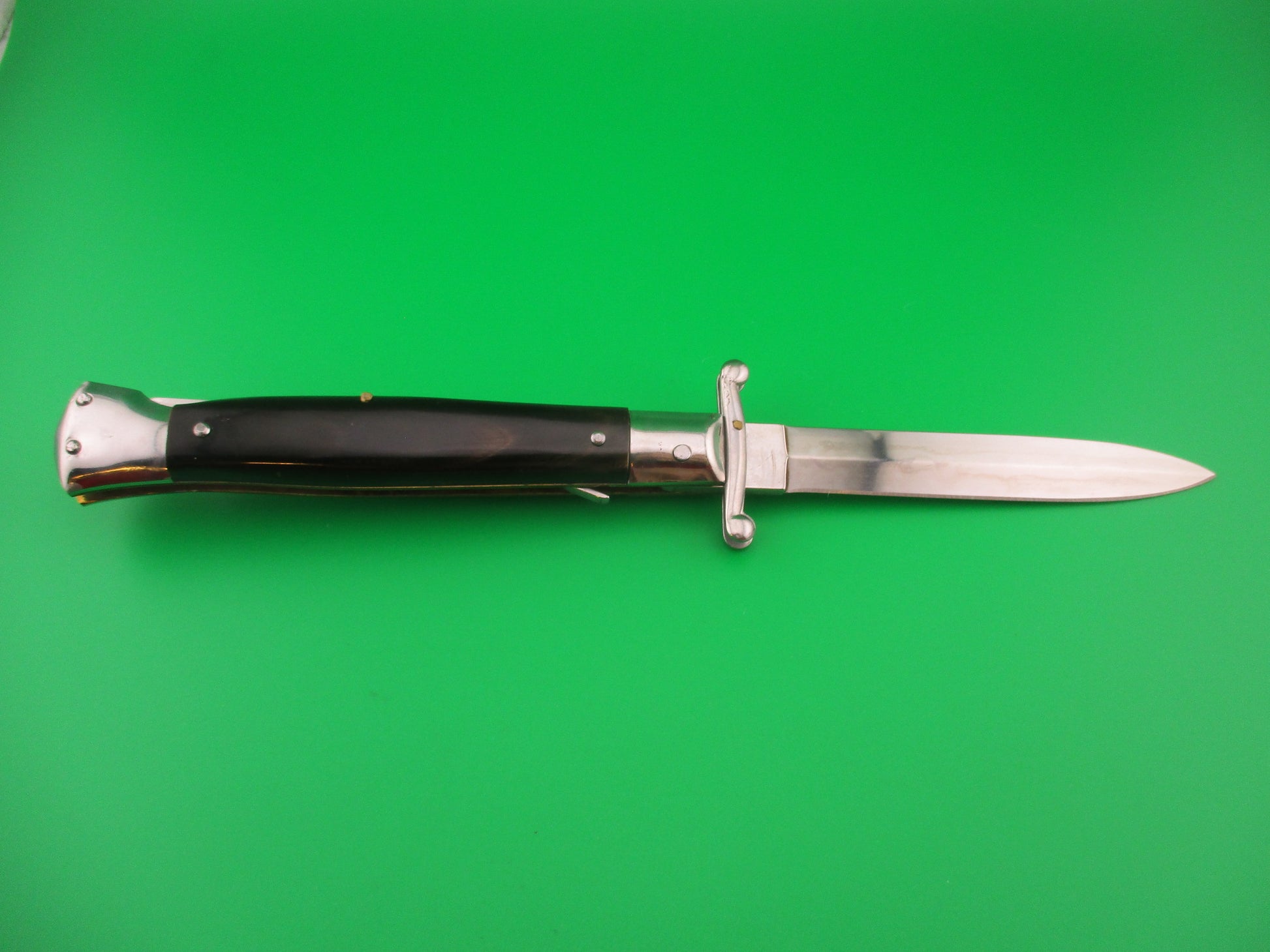 Rostfrei 23cm Italian Swing Guard Dagger blade 1980s vintage automatic knife made in Italy. The knife measures 22.8cm (9 inches) open and 4 15/16 inches closed with brass liners and steel bolsters & guards and nickel silver button and safety cap. Dagger grind blade is 99% full or better with original finish, very nice and stamped Rostfrei. Genuine horn scales that are very dark with a little light streaking and in great condition. The knife works well with blade tip deep & centered closed, strong snap and excellent lockup open with less than 1/16" movement at the tip. Does not rattle if shaken with blade open except for the guards. EX+ condition.