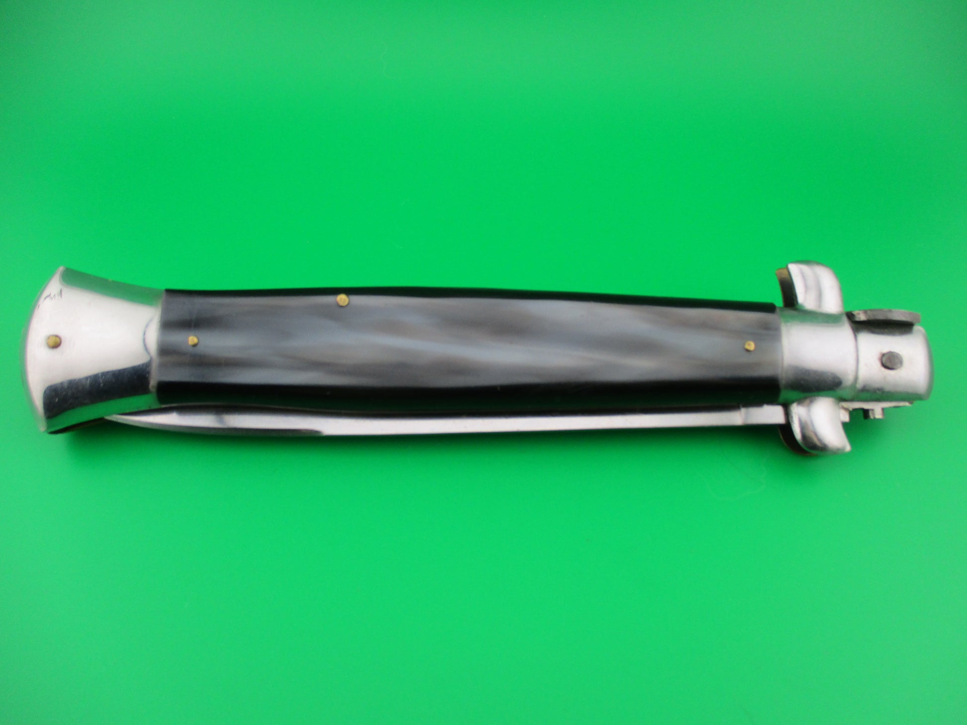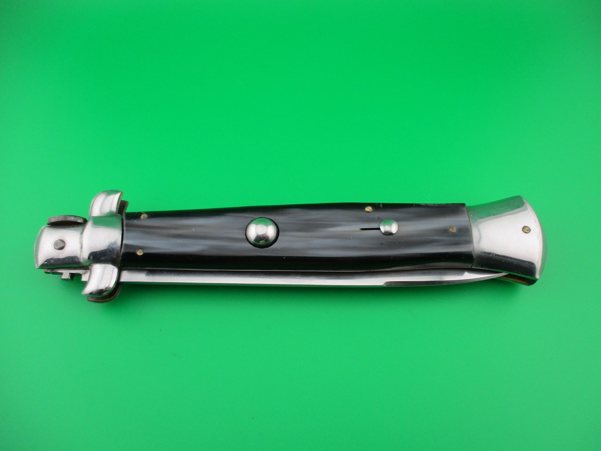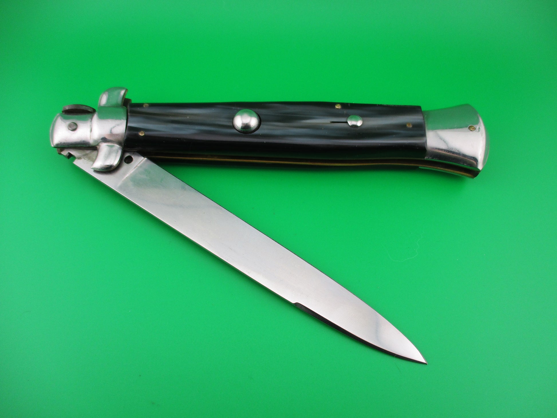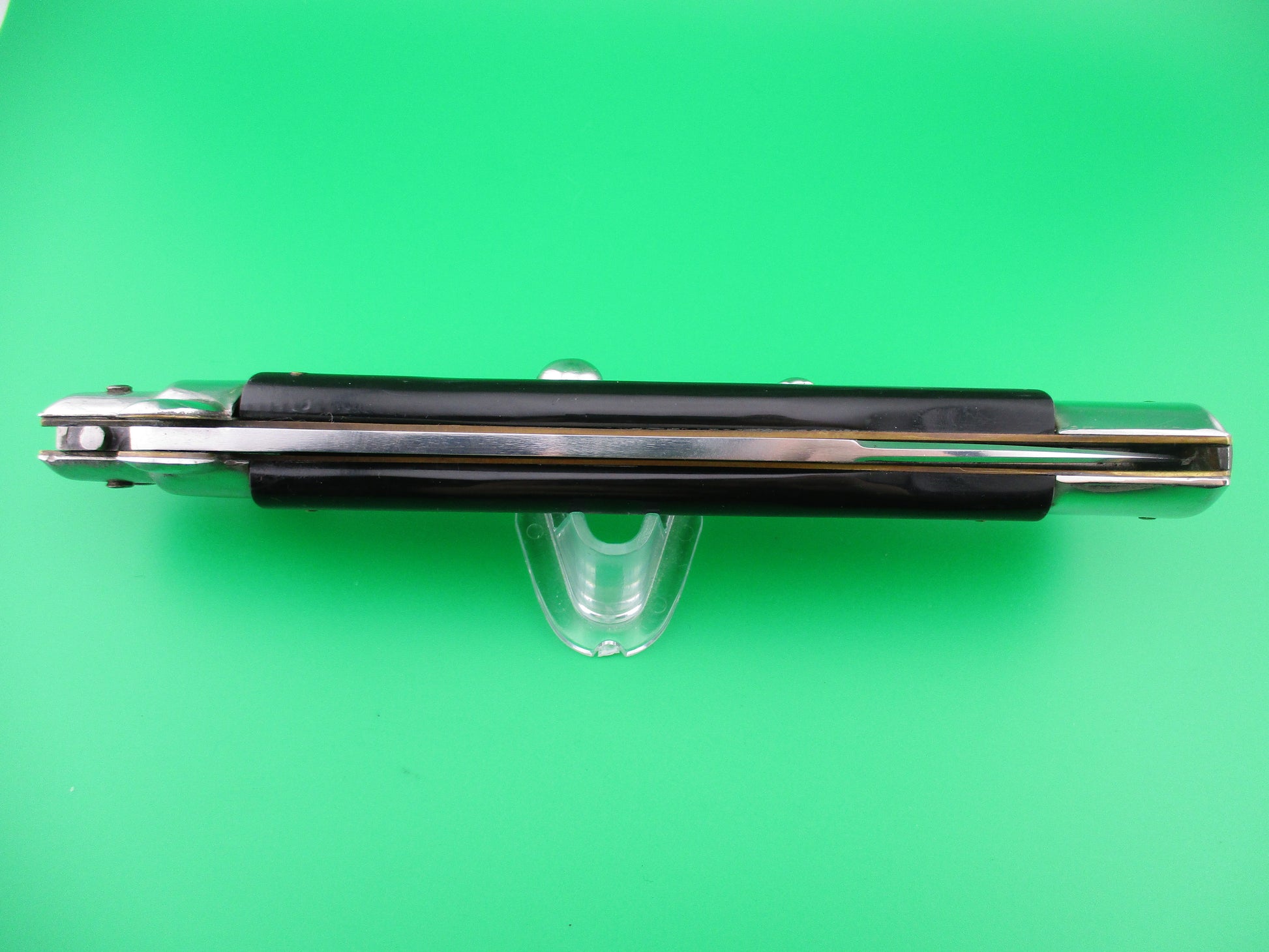Vintage ROSTFREI 38cm Italian Stiletto Black & Gray automatic knife with transitional traits. Knife measures 38cm (just under 15 inches) open with brass D stamped liners, one nickel silver bolster, button and safety cap and 3 stainless steel bolsters. The flat grind swedge blade is full and retains original factory finish with some light scratches on both sides of the blade. Scales are Black, gray & tan streaked synthetic in very nice condition. The knife works great with blade tip seating deep and centered, good snap and good lockup with a tiny bit of up and down and some side to side movement at the tip. Safety works. EX condition.