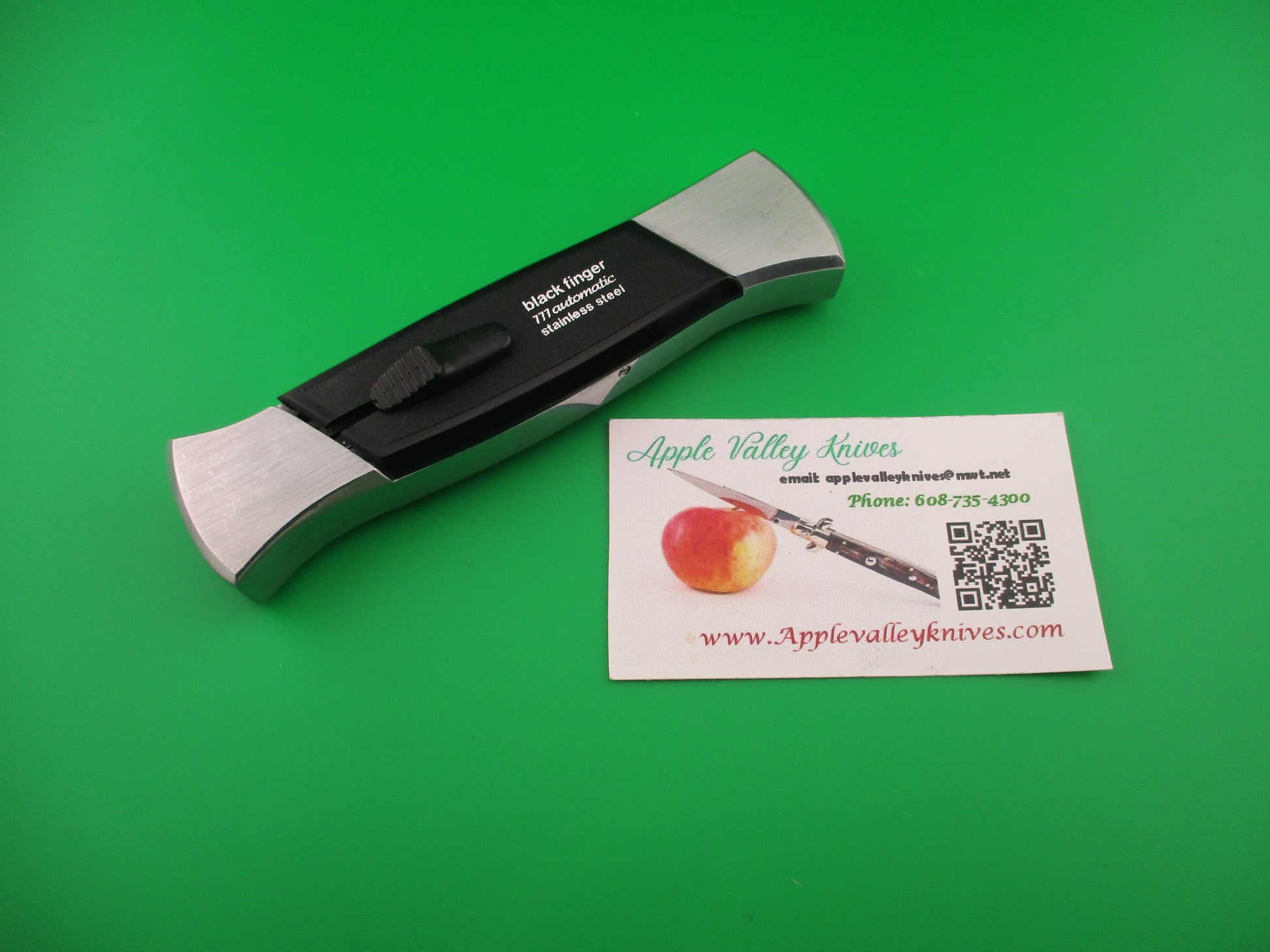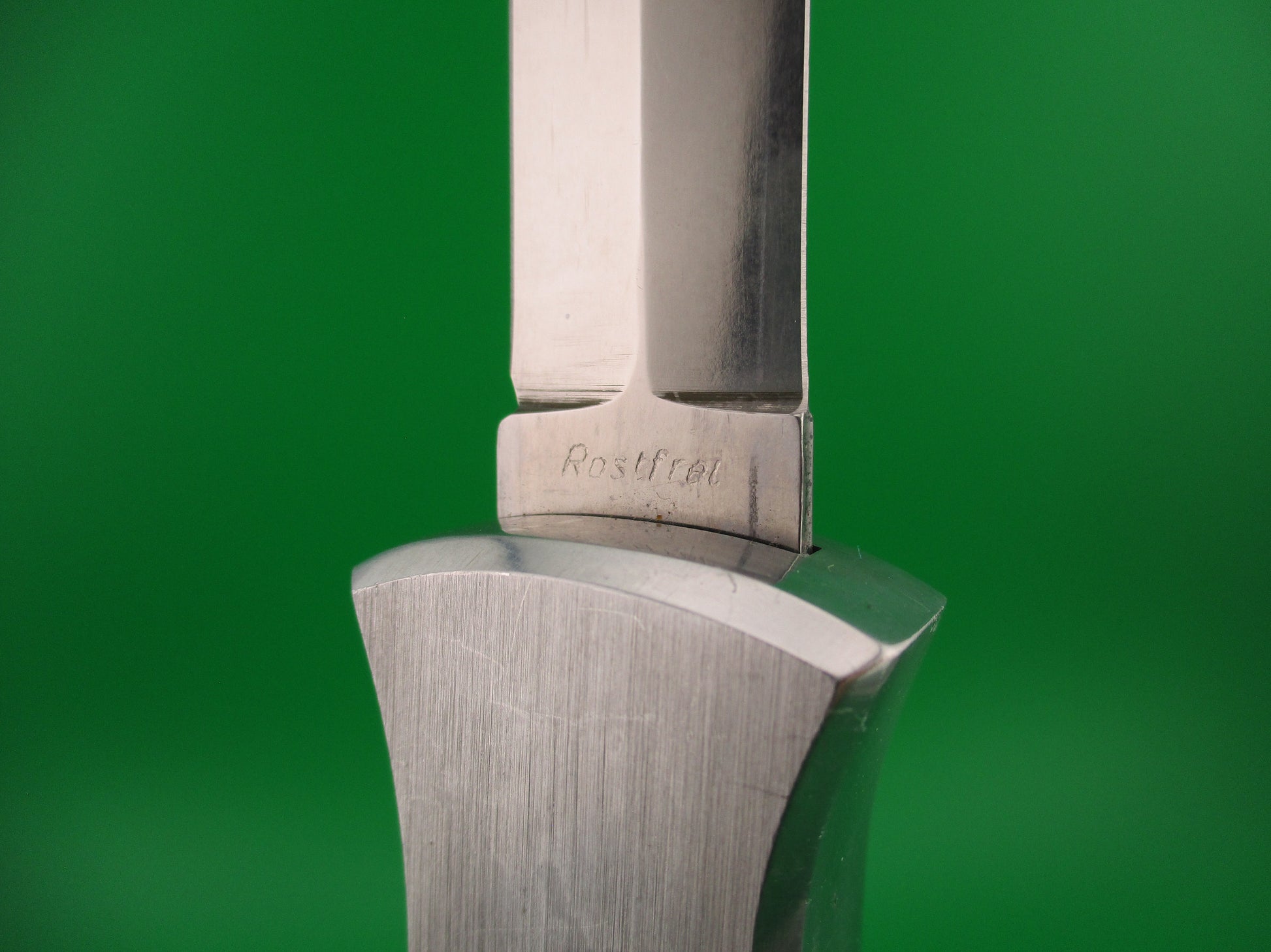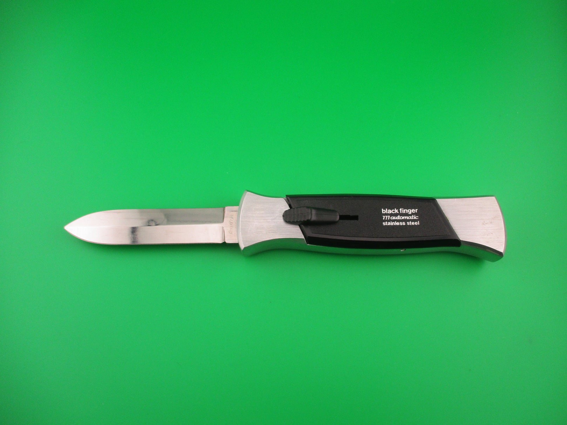 ROSTFREI BLACK FINGER 22cm Italian Vintage OTF automatic knife most likely made in the 1980s or 90s in Italy and copied by AKC. It measures 21.5cm (8.5 inches) open and 5 1/8 inches closed with an aluminum frame. The spear point dagger blade is 100% full with factory finish marked ROSTFREI. The brushed aluminum frame is in excellent condition with textured black plastic scales that have white lettered wording that says "black finger 777 automatic stainless steel". The knife works great with blade opening fully when switch (button/knob) is pushed forward and retracting fully when it's pulled backwards. EX+ condition.