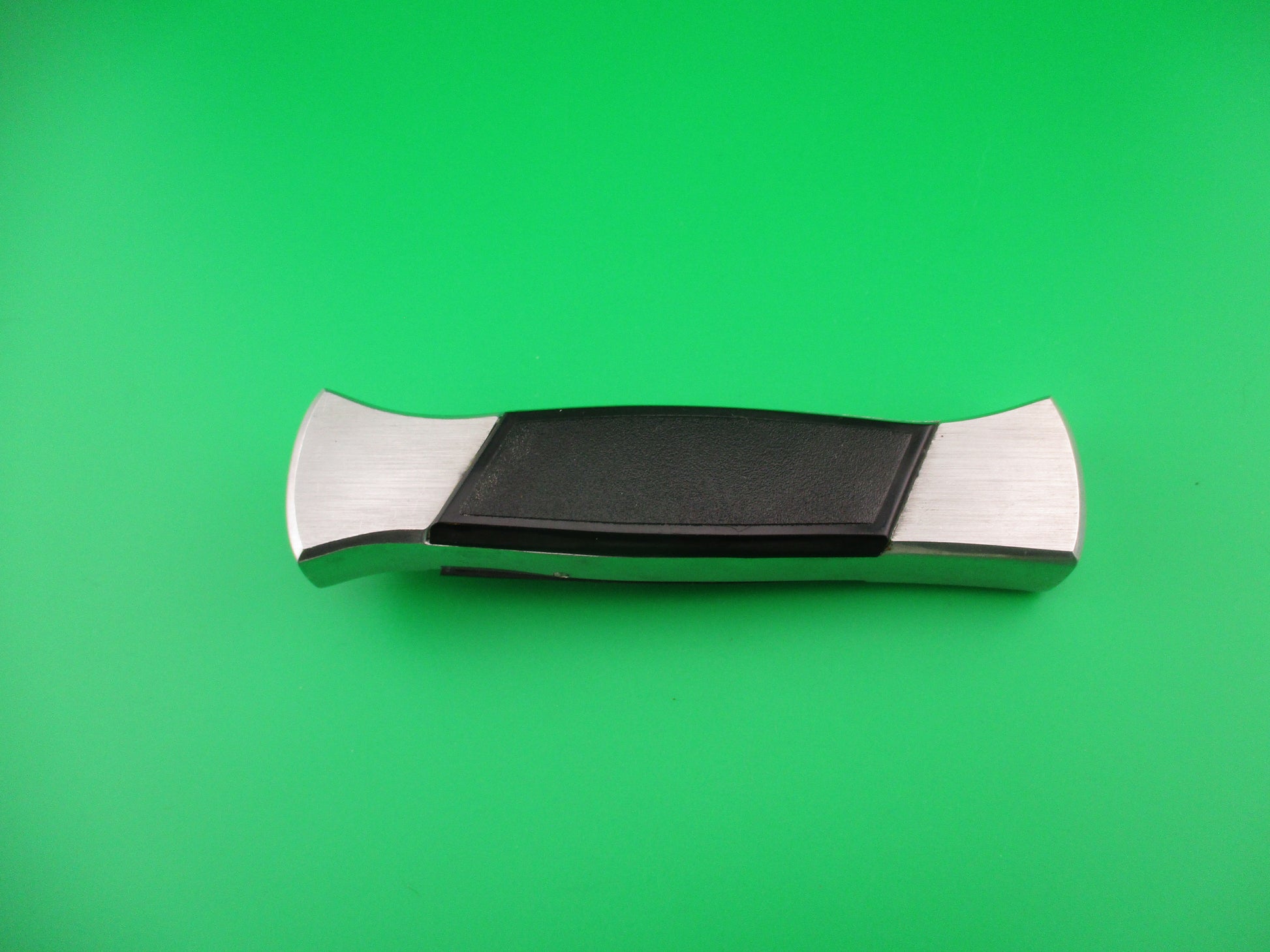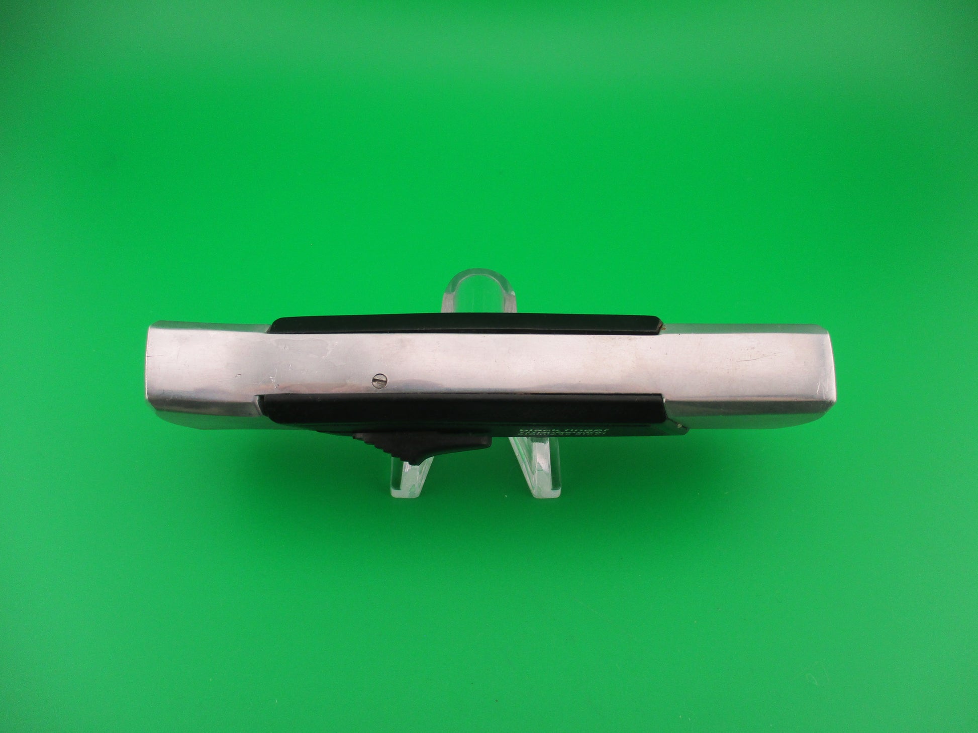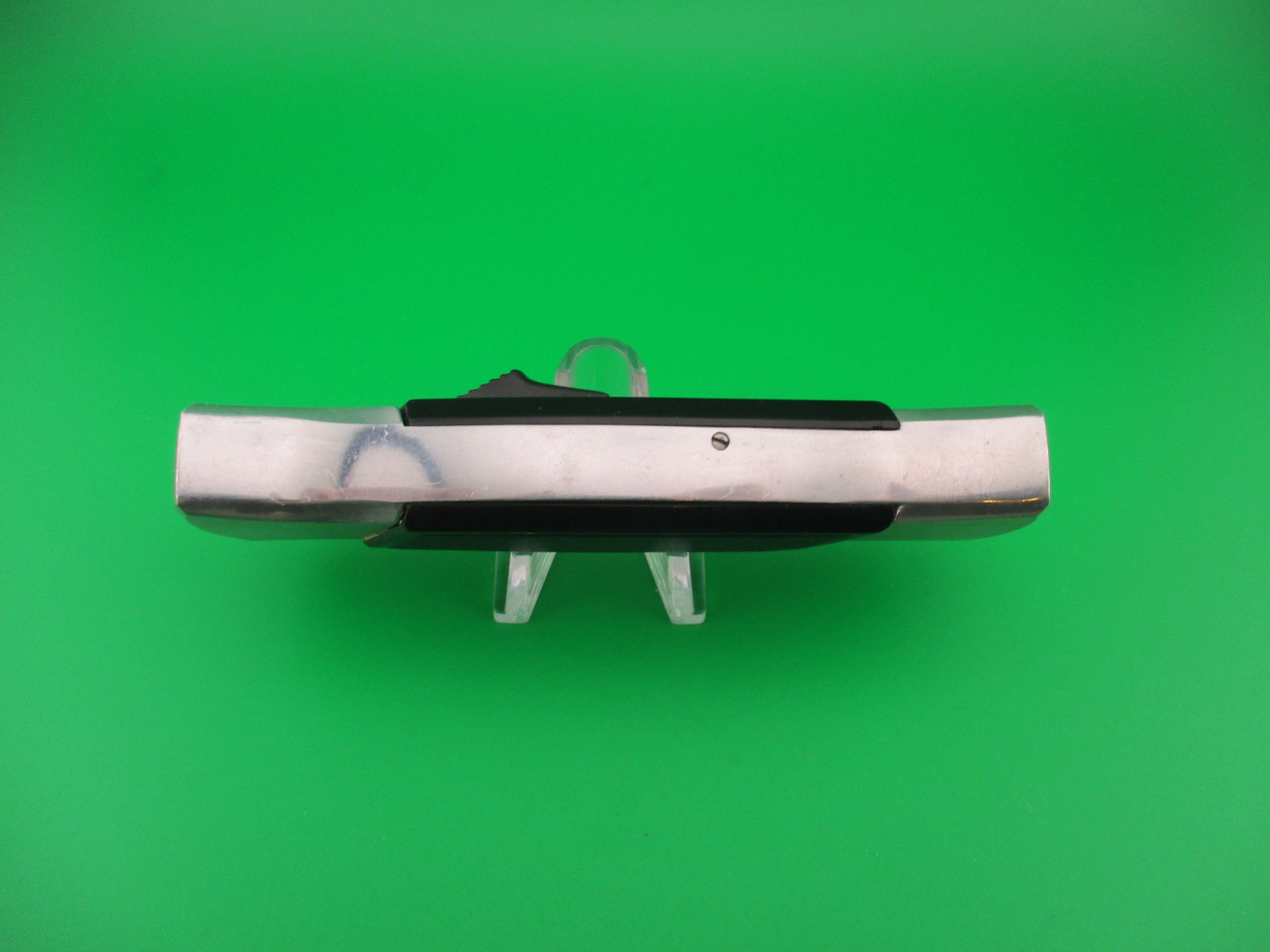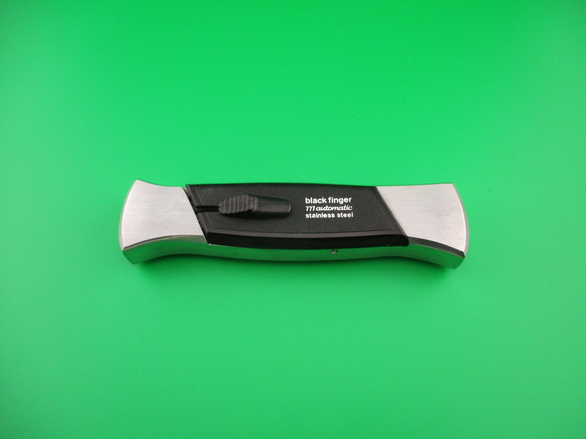 ROSTFREI BLACK FINGER 22cm Italian Vintage OTF automatic knife most likely made in the 1980s or 90s in Italy and copied by AKC. It measures 21.5cm (8.5 inches) open and 5 1/8 inches closed with an aluminum frame. The spear point dagger blade is 100% full with factory finish marked ROSTFREI. The brushed aluminum frame is in excellent condition with textured black plastic scales that have white lettered wording that says "black finger 777 automatic stainless steel". The knife works great with blade opening fully when switch (button/knob) is pushed forward and retracting fully when it's pulled backwards. EX+ condition.