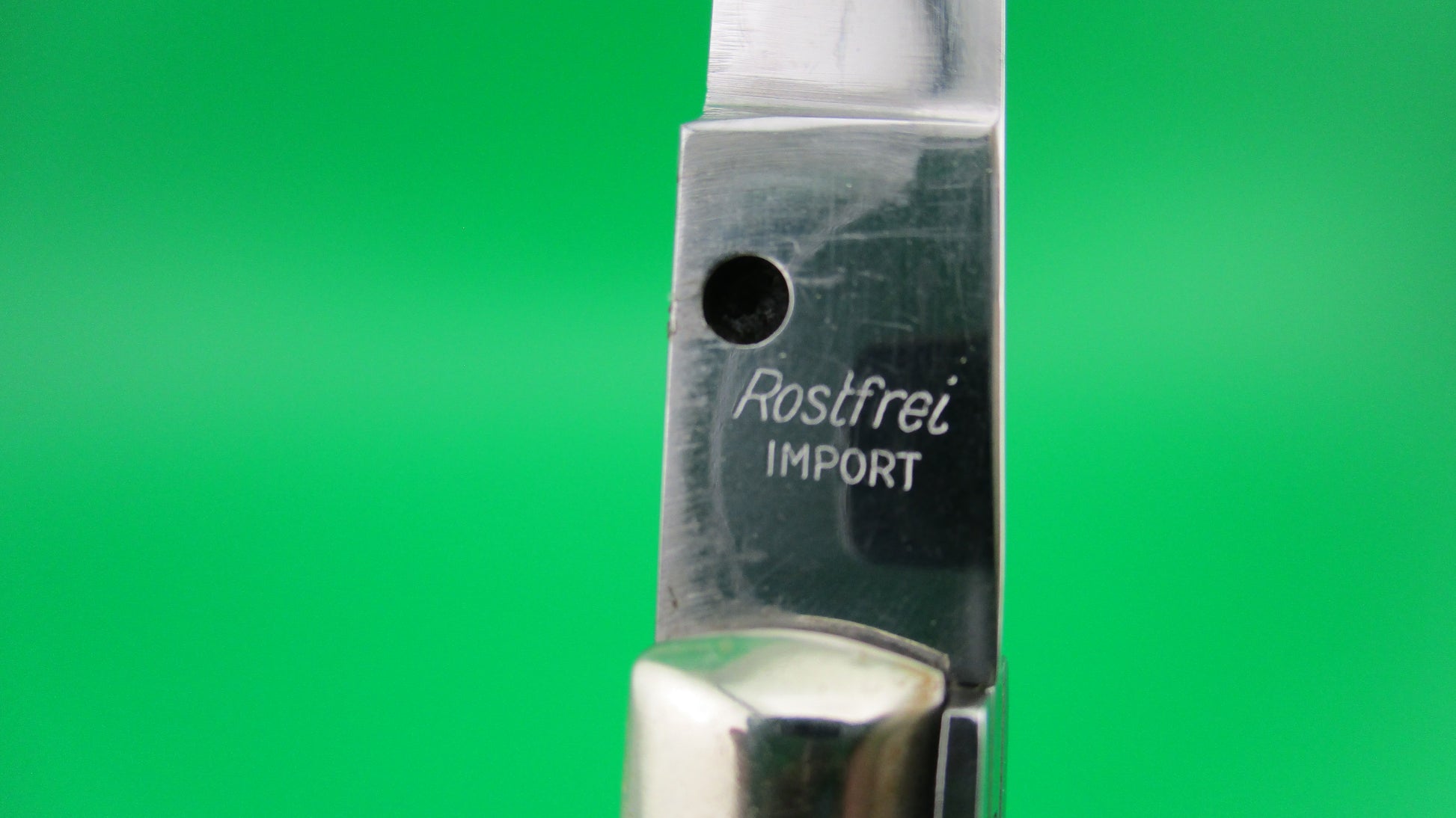 Vintage Rostfrei IMPORT 18cm Italian Transitional Stiletto Pearlex automatic knife made in Italy in the 1960s, or early 70s. It measures 17.6cm (6 15/16 inches) open with D Stamped brass liners & pins with nickel silver bolsters & button and missing the safety cap. The flat grind swedge blade is mostly full (97%) with some of the original factory finish intact and has some sharpening marks and light scratches. The ricasso is stamped Rostfrei IMPORT and the backside is stamped 1 (or capital i). The pearlex (faux pearl) scales are Gorgeous and look almost like real mother of pearl with Red dot safety. Knife works great with blade tip below the liners clsoed, strong snap and excellent lockup open. Safety works (though missing the cap). EX condition.