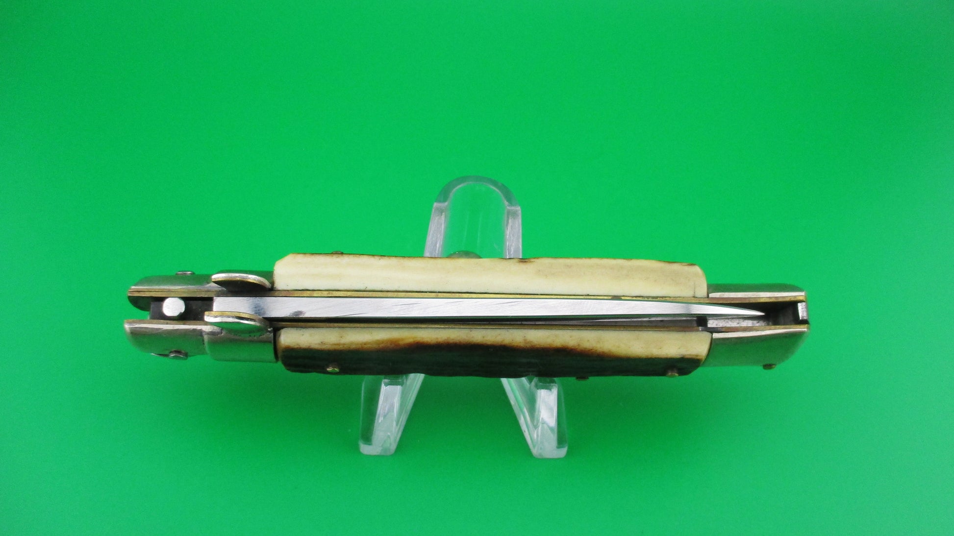 Vintage Rostfrei IMPORT 20cm Italian Stag transitional stiletto switchblade knife measures 19.7cm (7.75 inches) open with brass liners and nickel silver bolsters, button and safety cap. The flat grind blade is nearly full with original factory finish and some light scratches and is marked Rostfrei IMPORT on the tang (ricasso). The scales are very nice stag with a red dot safety and are in great condition with one tiny hairline crack on the edge of front scale. The knife works great with the blade tip sitting below the liners when closed, good snap and tight lockup. Swivel bolster so you push down on the right finger guard on top front bolster to swivel it and release the blade to close. Very nice old Italian Stag 8 inch transitional from the 1960s, or 70s. Safety works. EX+ condition.