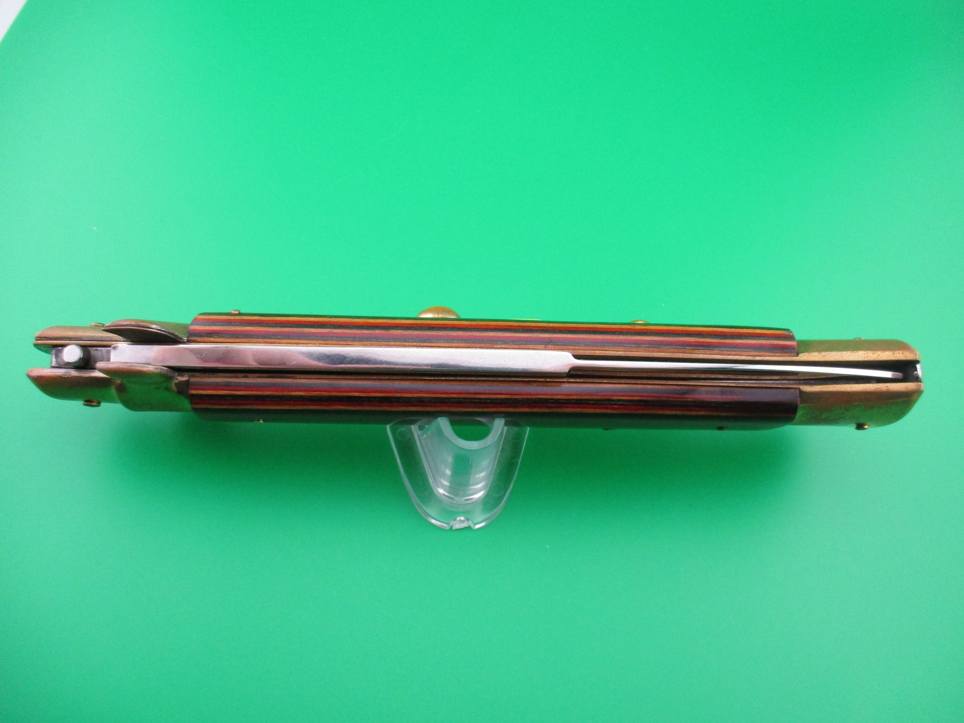 Vintage ROSTFREI ITALY 38cm Italian Stiletto Pakkawood & Brass automatic knife. This Big knife has some gorgeous patina on the brass and was likely made in the early 1980s by Angelo Campolin Sr under the Falcon brand. This knife measures 38cm (15 inches) open with D Stamped brass liners and Brass bolsters, button and safety cap. The bayonet style blade is full with original factory finish and is stamped ROSTFREI ITALY on the ricasso. The pakkawood scales are very interesting because different colored layers are revealed when the wood is shaped. They are in good condition. The knife works well with the blade tip deep and centered closed, good snap and TIGHT lockup open. Safety works. EX condition.