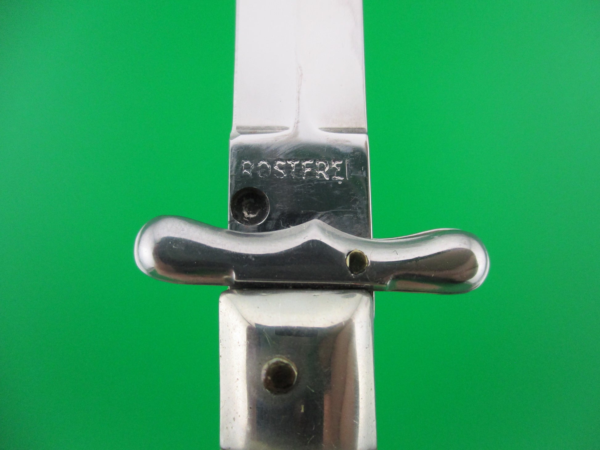 Medici Rostfrie vintage 19cm Italian Stag swing guard dagger automatic knife. Beautiful old Italian swing guard with nice stag. The knife measures 19cm (7.25 inches) open with brass liners, nickel silver bolsters and steel button, guards & safety. The dagger grind blade is full with original finish and has a factory nail nick and is marked Rostfrei. The stag scales are very nice and thick with no flaws. The knife works perfectly, with blade tip deep and centered closed, strong snap and tight lockup open. Safety works, but will move off safe if you push hard on the button. This knife is in Like New condition.