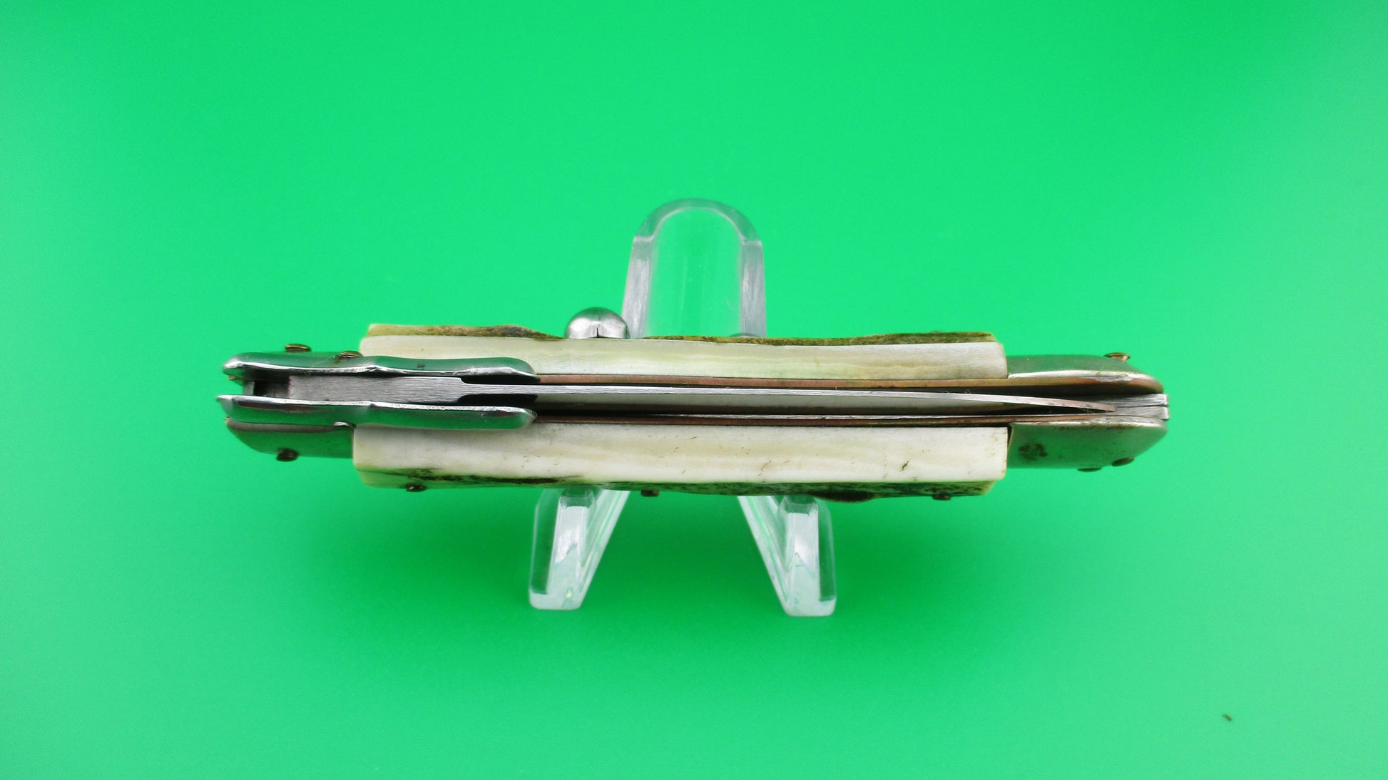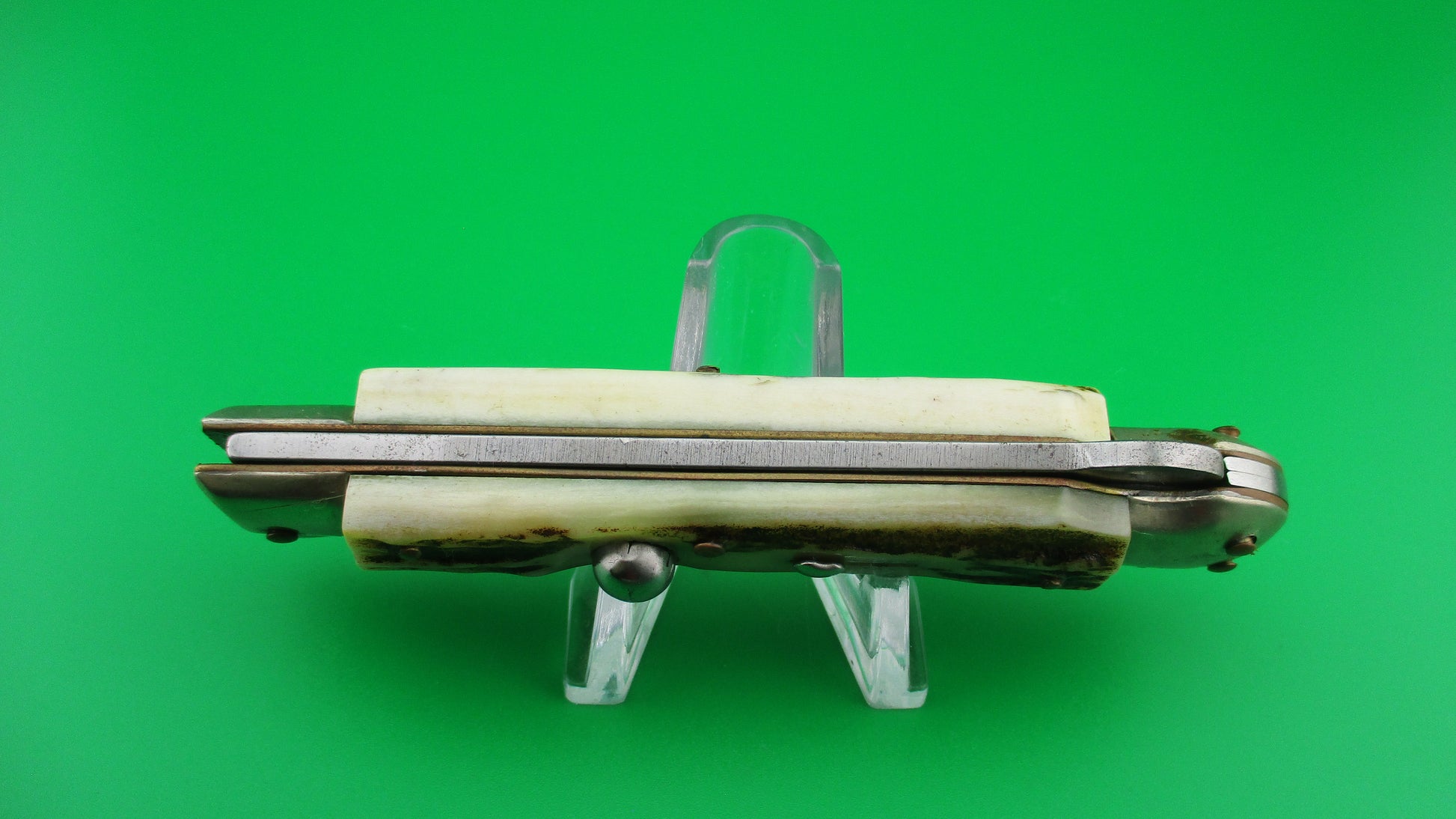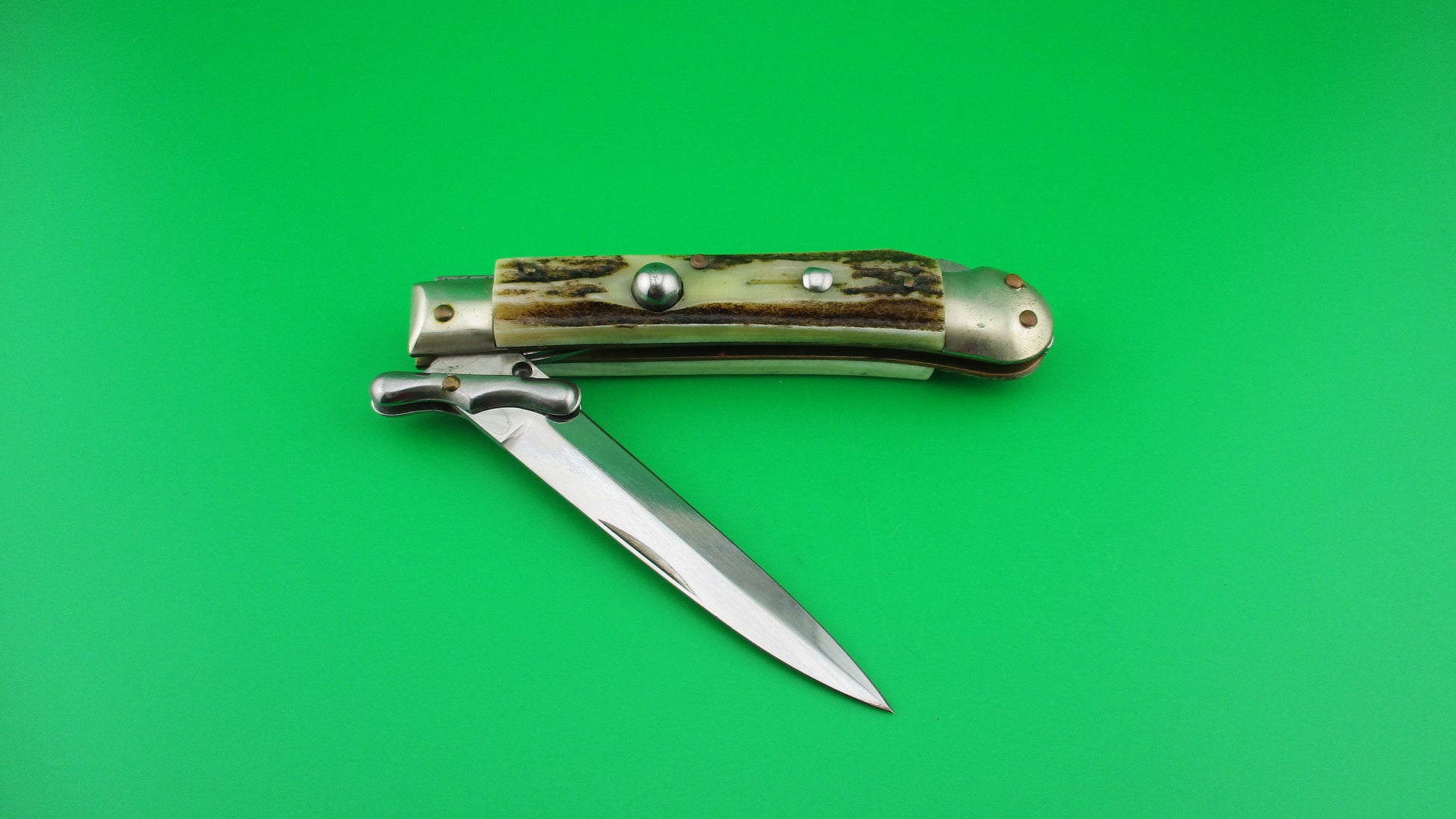 Medici Rostfrie vintage 19cm Italian Stag swing guard dagger automatic knife. Beautiful old Italian swing guard with nice stag. The knife measures 19cm (7.25 inches) open with brass liners, nickel silver bolsters and steel button, guards & safety. The dagger grind blade is full with original finish and has a factory nail nick and is marked Rostfrei on the back of the ricasso. Genuine stag scales are very nice and thick with no flaws. The knife works perfectly, with blade tip deep and centered closed, strong snap and tight lockup open. Safety works. Nearly new condition.