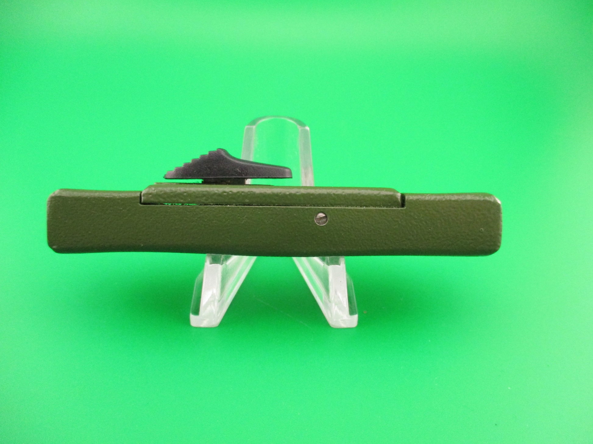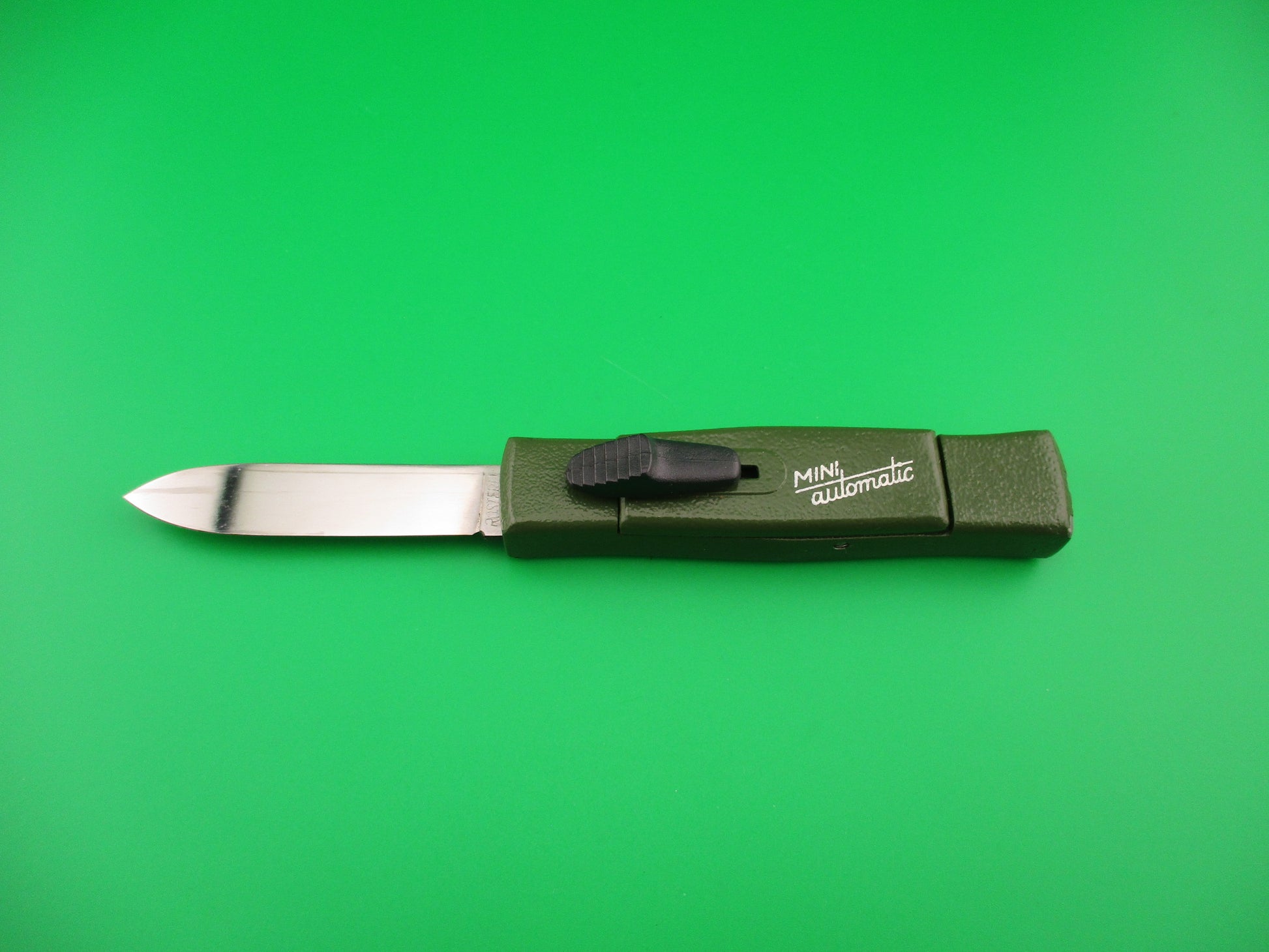 Vintage ROSTFREI MINI Automatic 15cm Green OTF automatic knife measures just 15.2cm (6 inches) open and 3 5/8 inches closed with non magnetic frame. I believe this knife is from the 1990s and likely made in Taiwan or Korea. The flat spear blade is full with original factory finish and is stamped ROSTFREI on the tang. The body is in great condition. The DA (double action) knife functions perfectly with the blade opening fully when the switch (button/knob) is pushed forward and fully retracting into the frame when the button is slid backward. Nearly new condition.