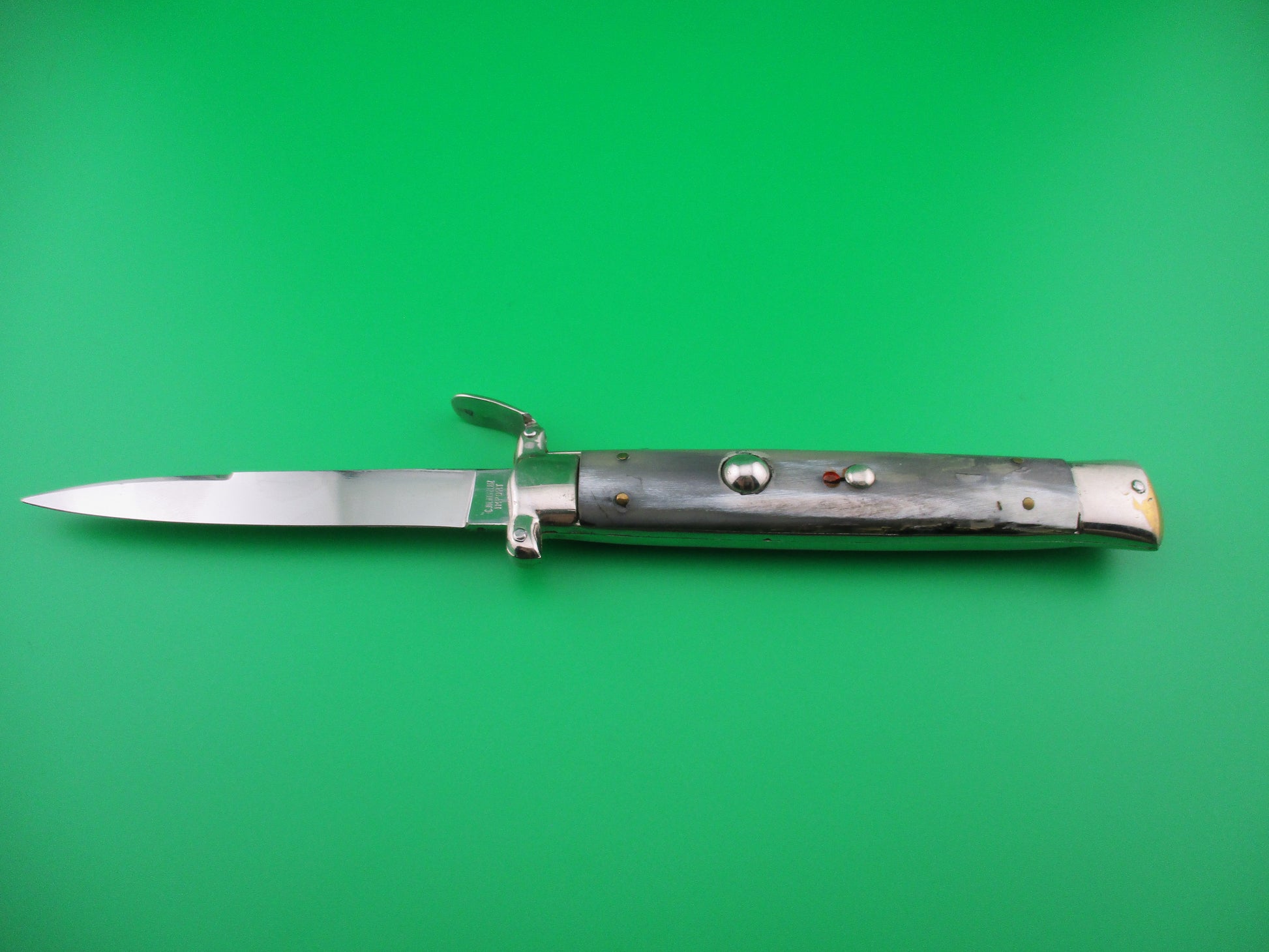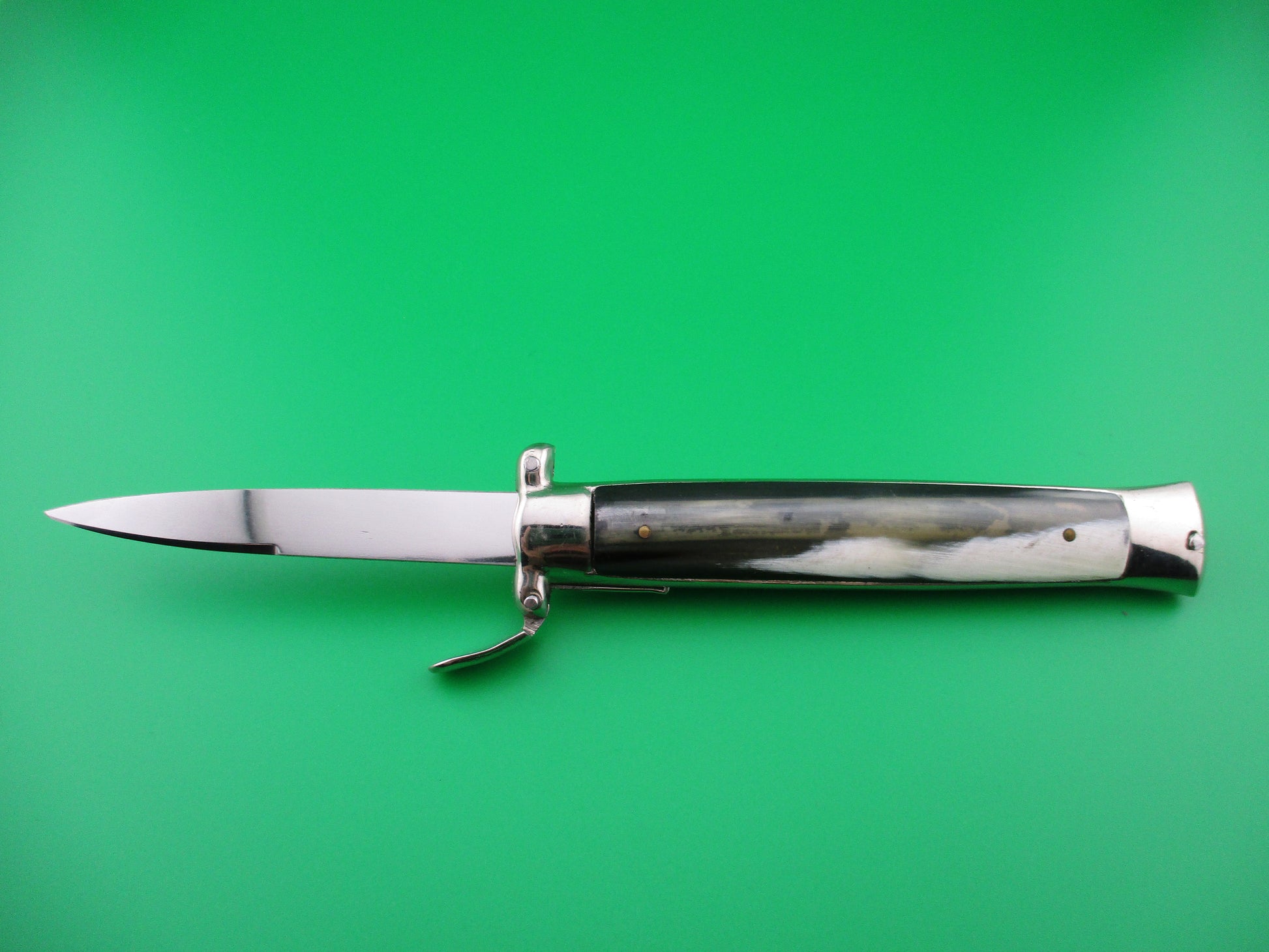 Vintage 1960s Italian trapdoor switchblade. This knife is New Old Stock and is part of a group of these knives that was found in an old workshop in Italy a couple of years ago. These switchblades have been very rare in the collecting community over the past 50 years so this find will give the opportunity to many collectors to own one of these knives who would likely never have had that opportunity before. These knives were never sold retail. I believe the reason that they weren't sold is because each one has some issue, most very minor, that precluded them from being sold as perfect. This one, for example has a flaw in the plating on the bottom bolsters and some brass is showing through. Pretty minor, but no perfect. Otherwise this is a like new 1960s Italian trapdoor OTF switchblade that works great! The blade is stamped C JUL HERBERTZ over IMPORT and the backside is stamped PATENT over ROSTFREI. It measures 21.2cm (8 3/8 inches) open and has some gorgeous light green/white translucent horn. Amazing old Italian switchblade!