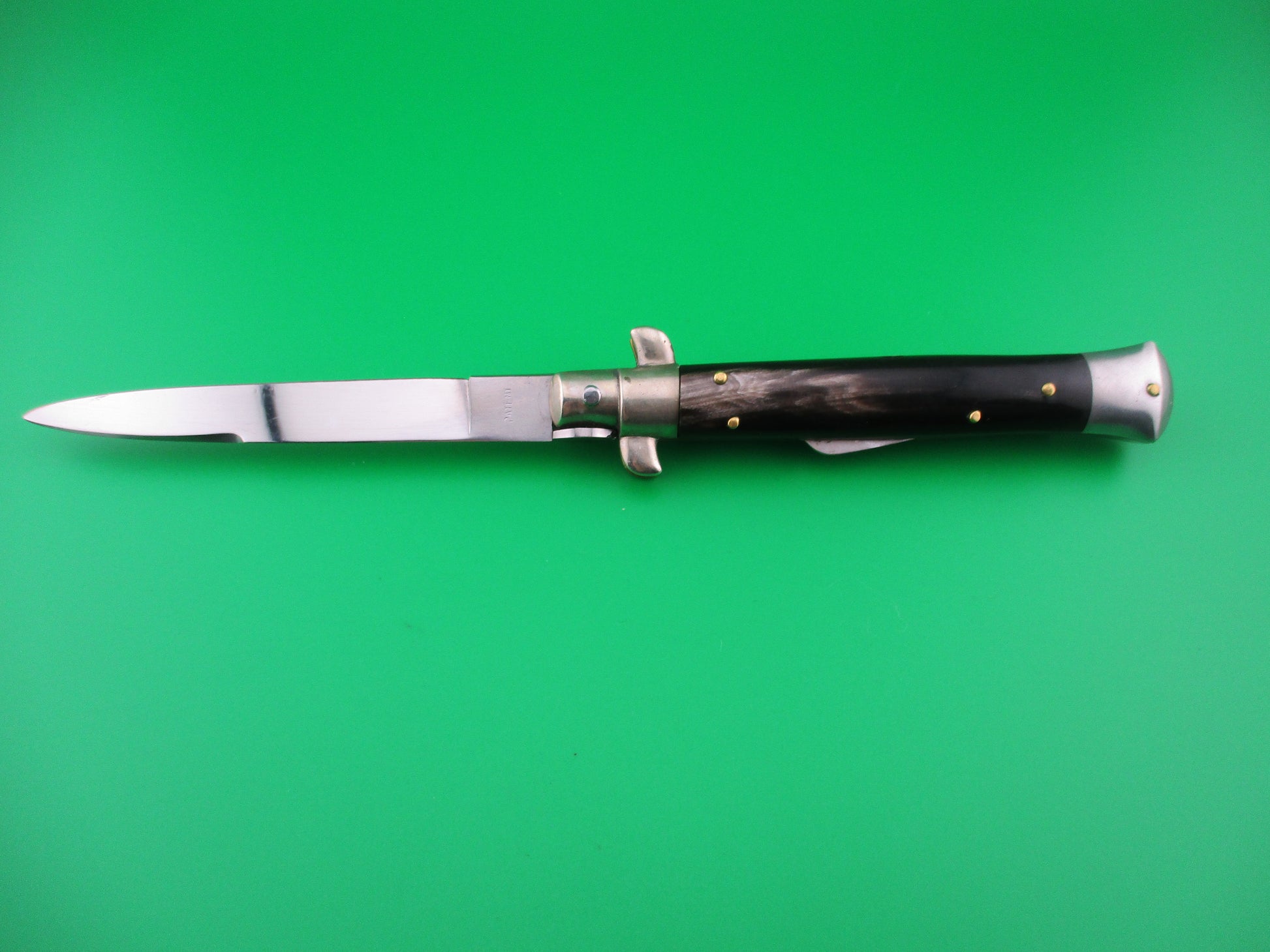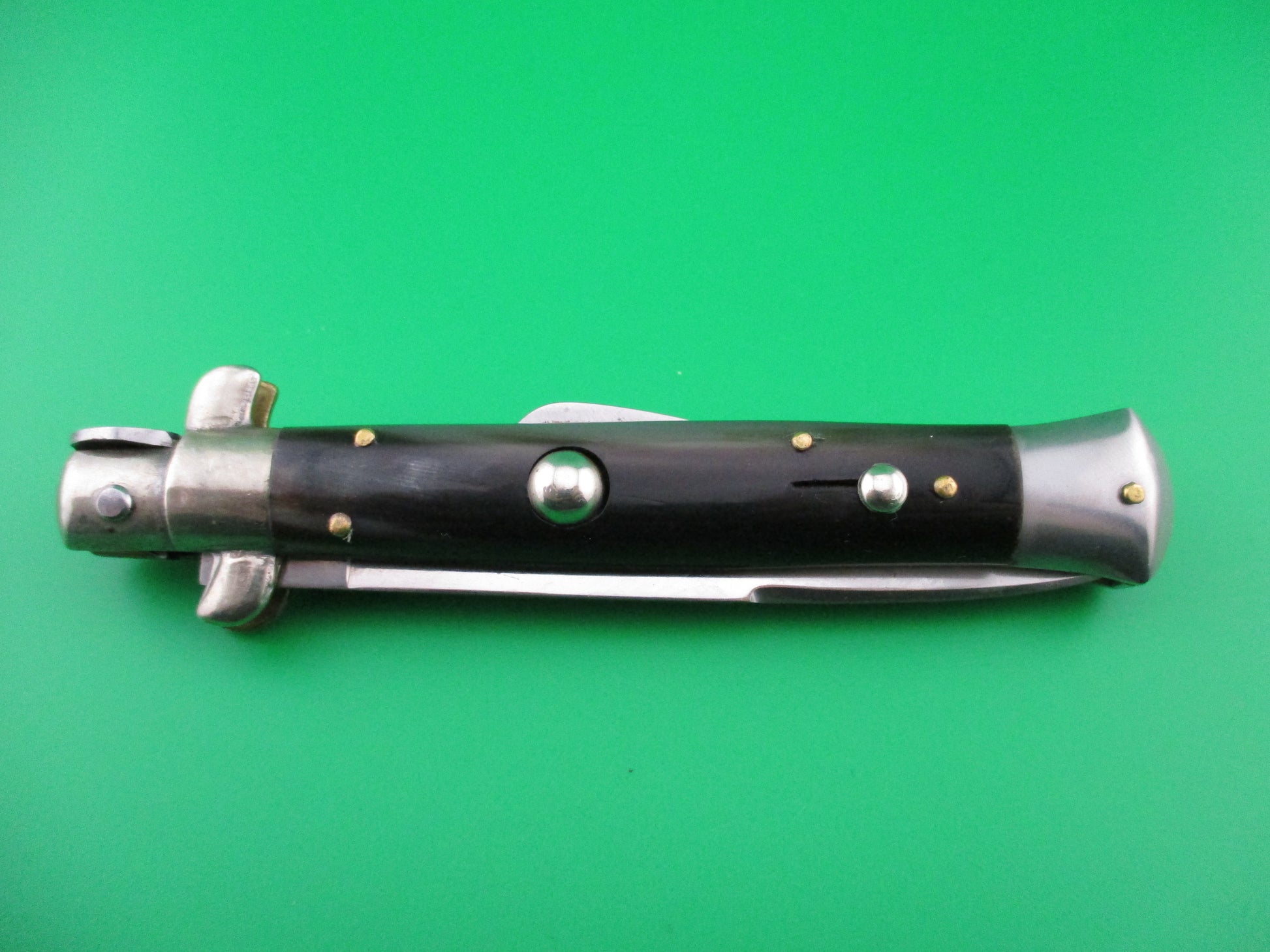 Vintage Italian 23cm Humpback stiletto switchblade knife. I believe this knife was made in the 1960s and these are referred to as Humpbacks due to the hump/bump on the back spring that you press to close the blade. The knife measures 23cm (9 inches) open with brass liners and German silver bolsters, button and safety cap. The blade is 100% full with all of the factory finish and is marked ROSTFREI on the front and PATENT on the rear of the tang. The horn scales are black with green streak in the front and tan streaks in the rear scale and in very good condition. The knife works great with the blade tip seating deep and centered, nice smooth snap and tight lockup! It is coil spring fired with no kickback. Safety works. Really beautiful vintage Italian humpback switchblade.