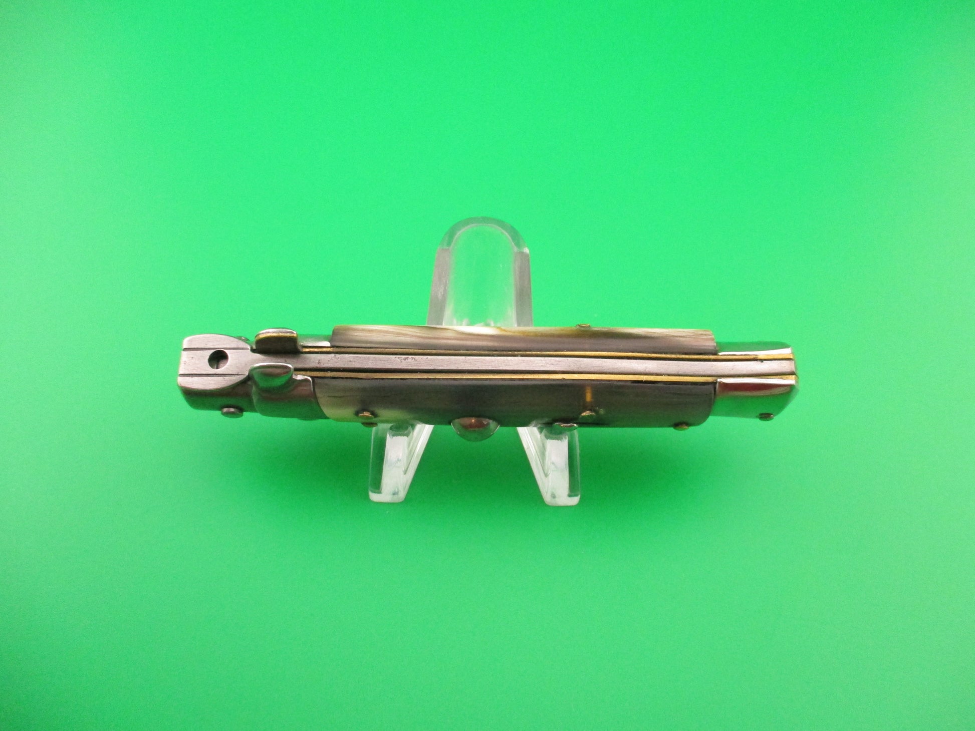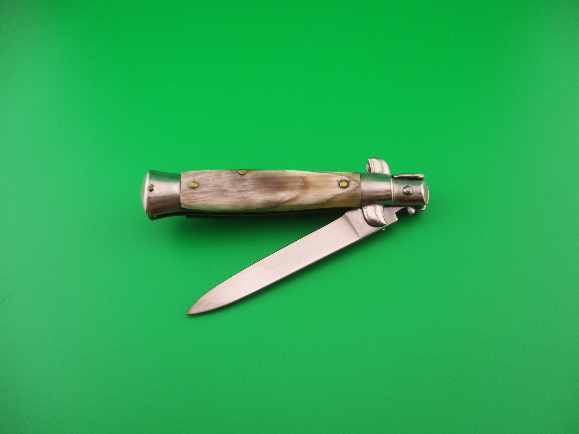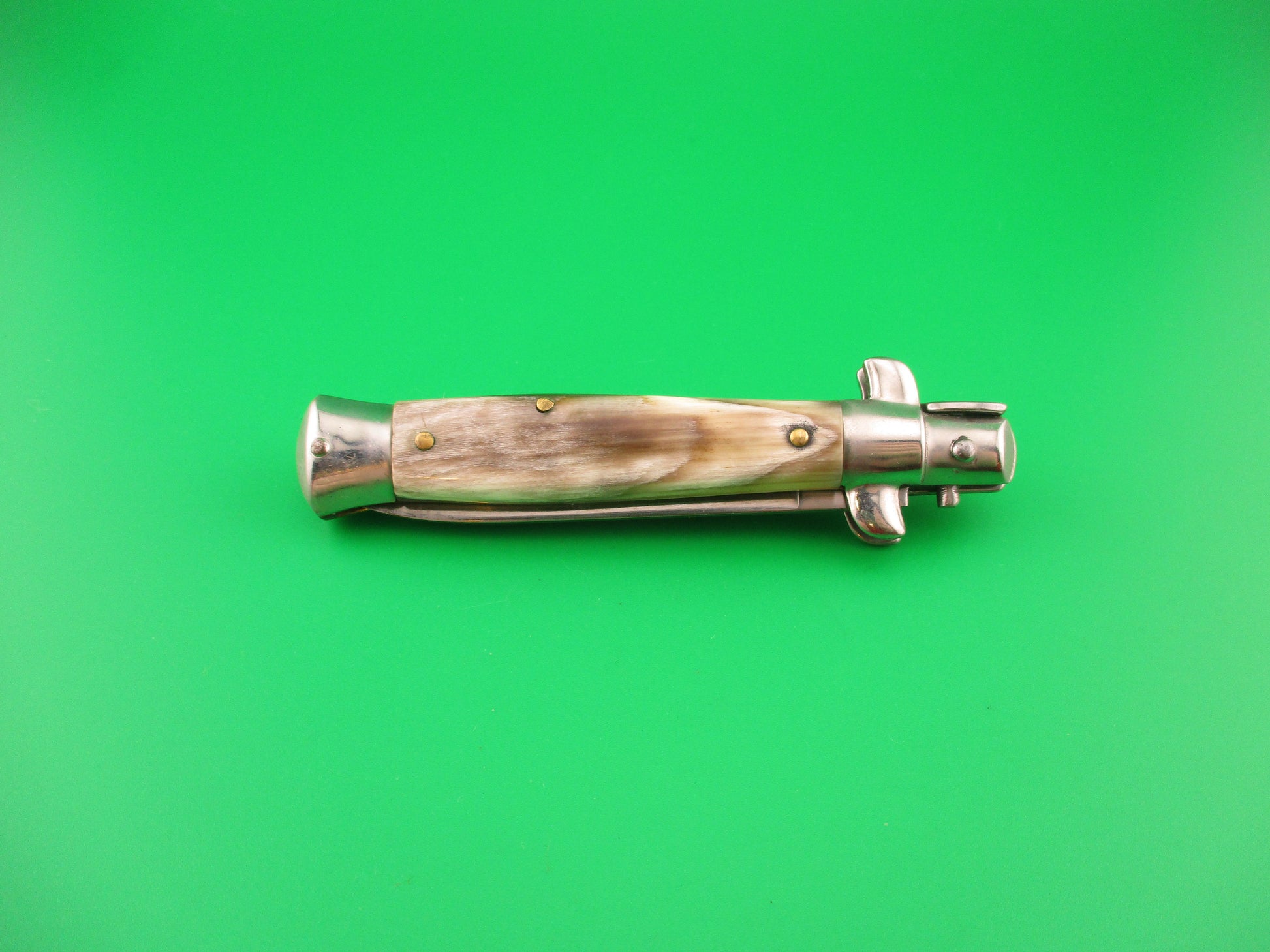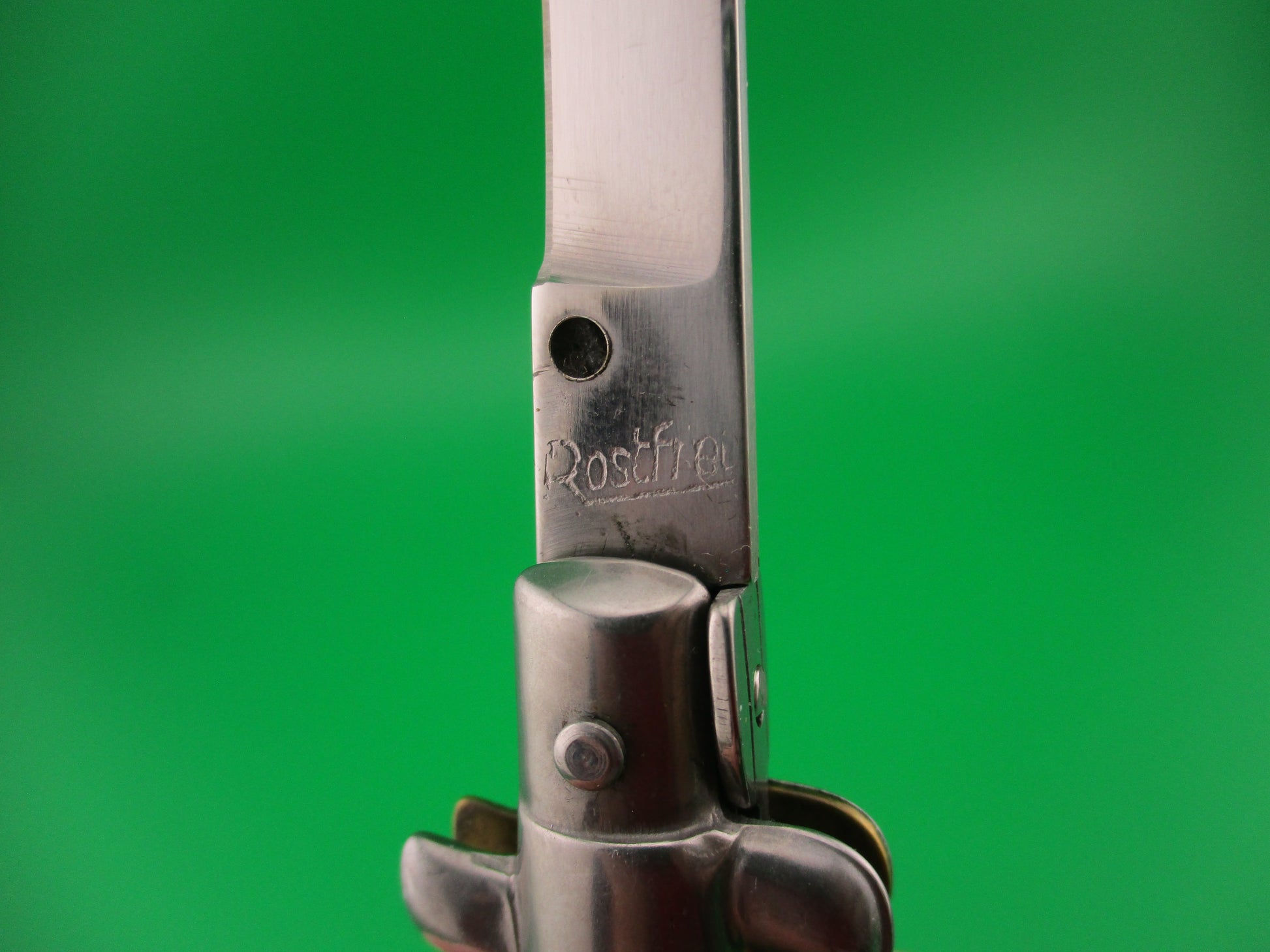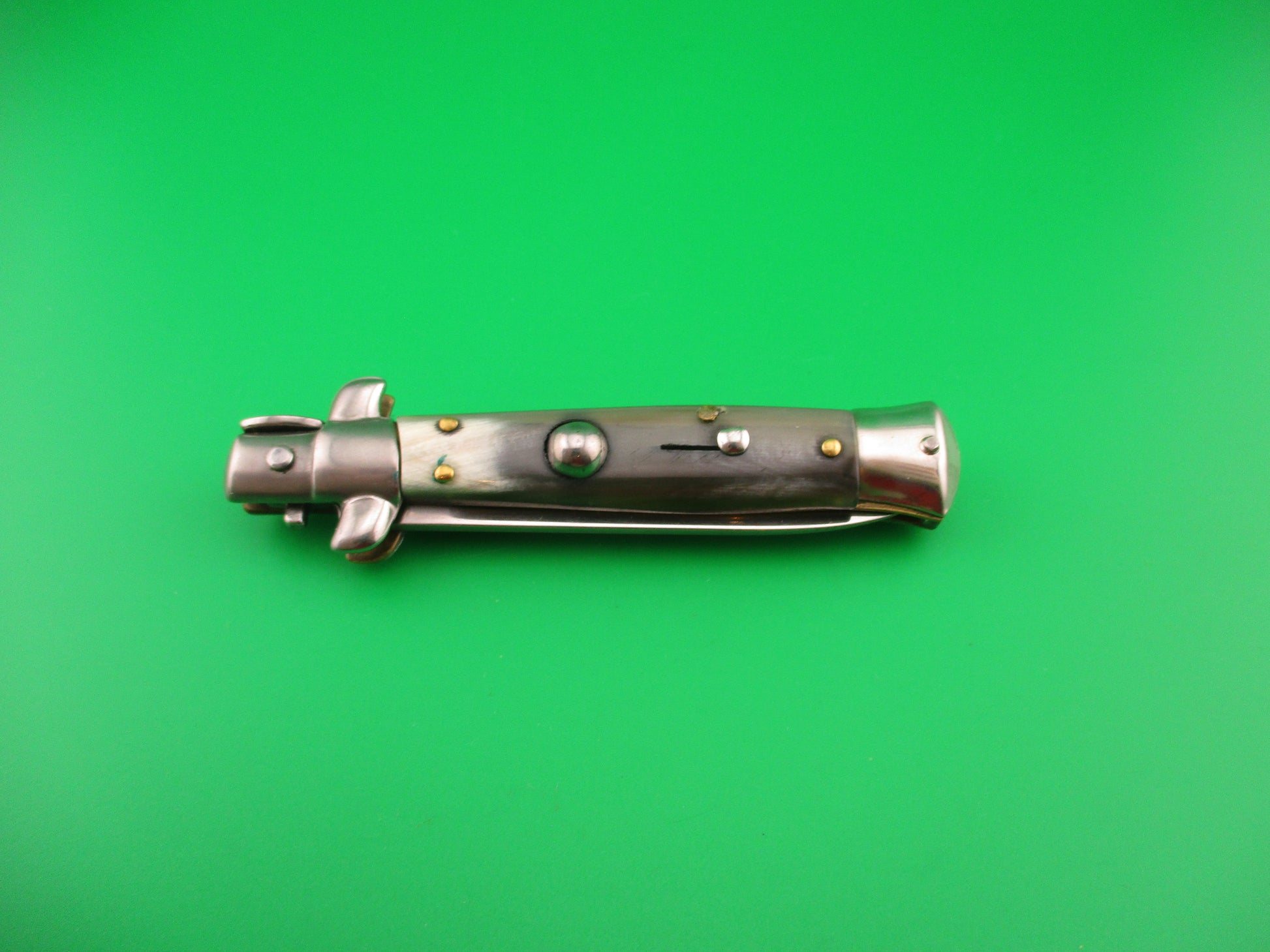 ROSTFREI 18cm Italian Stiletto Swivel bolster Vintage automatic knife most likely made in the 1970s measures 17.5cm (6 7/8 inches) open and 3 7/8 inches closed with brass liners, one steel bolster (top front) and 3 nickel silver bolsters, steel button and safety cap. The flat grind blade is 99% full, or better with factory finish intact and ricasso is stamped Rostfrei diagonally (slant). The genuine horn scales are in very good condition and are very attractive with tan & cream backs scale and green & cream on the front. The knife works well with blade tip deep & centered closed, good snap and excellent lockup with just a hint of up and down at the tip. Does not rattle if shaken when open. Safety works. EX+ condition.