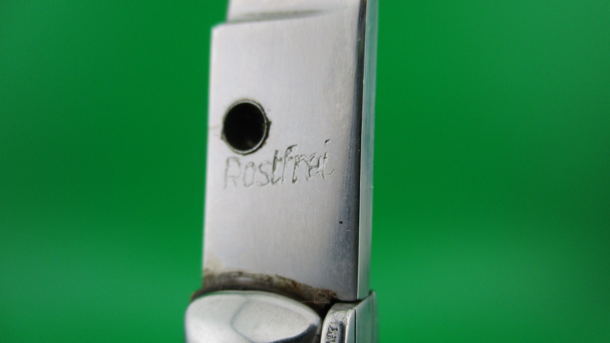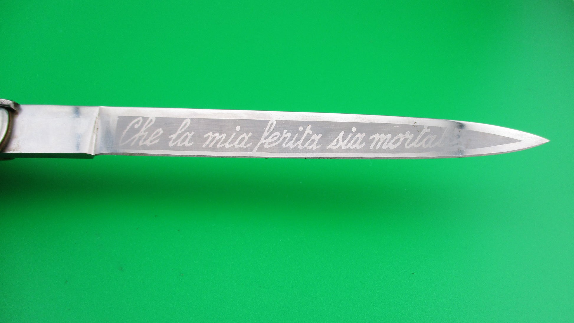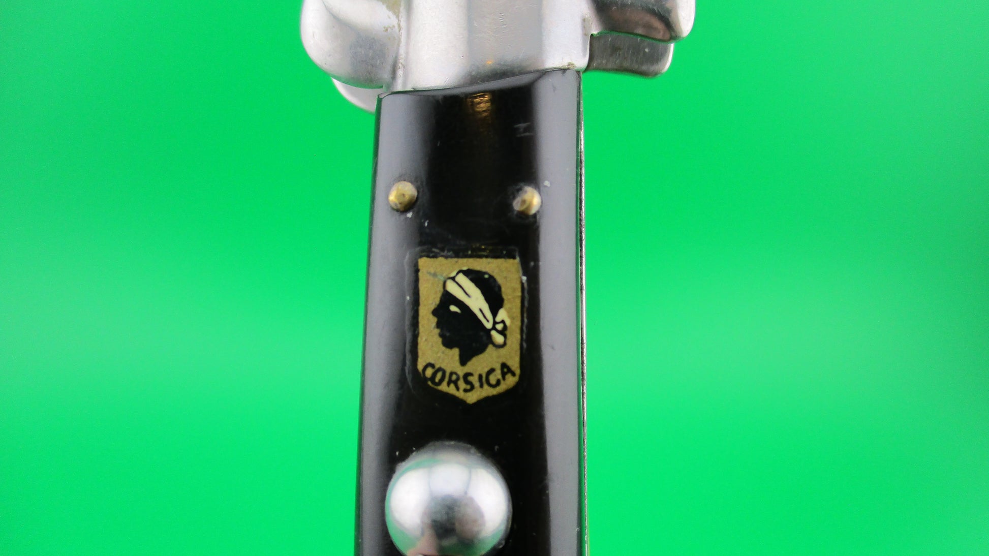 Vintage Rostfrei (slant) 28cm Italian Stiletto Vendetta Corsa automatic knife measures 27.3cm (10 3/4 inches) open with brass liners and steel bolsters & button and nickel silver safety cap. The flat grind blade is nearly full with original finish and etch that reads "Vendetta Corsa" on the front and "Che la mia ferita sia mortale" on the back which translates to: "may all your wounds be mortal" roughly and is stamped Rostfrei diagonally (slant) on the ricasso. The horn scales (handles) are in very good condition and are mostly black with a little color variation and have a Moore's head on a gold shield with the word CORSICA on it. The knife works well with blade tip deep and centered in the well, strong snap and Tight lockup open. Safety works. EX+ condition.