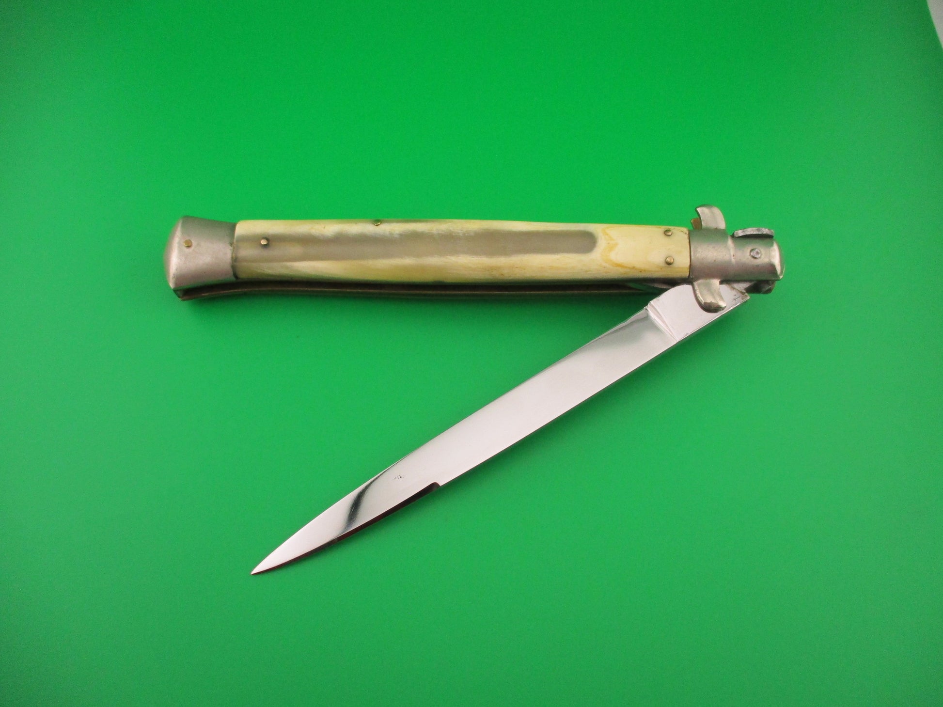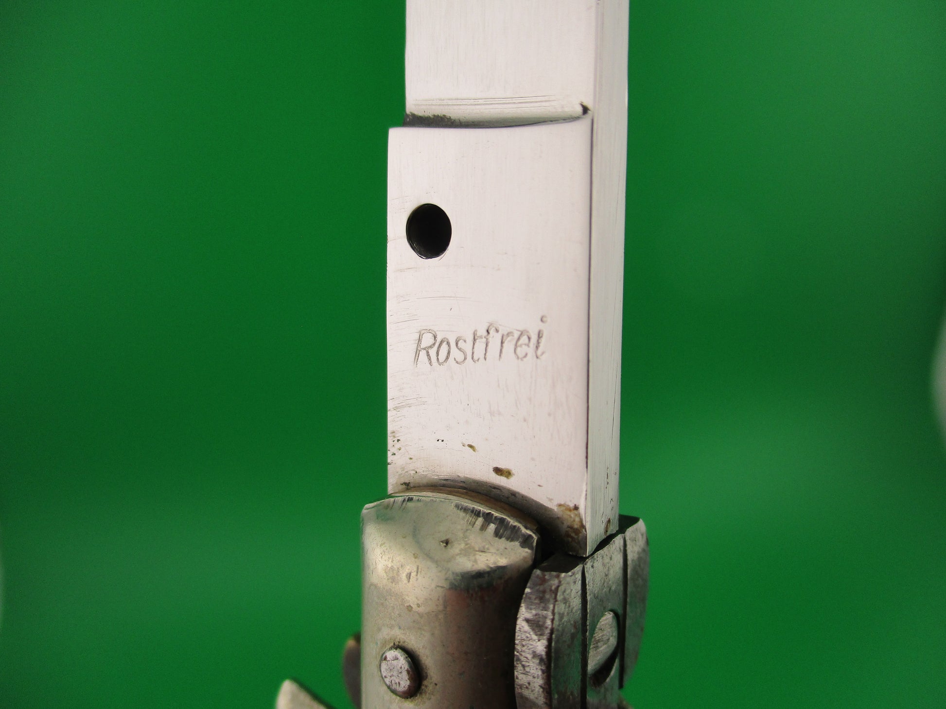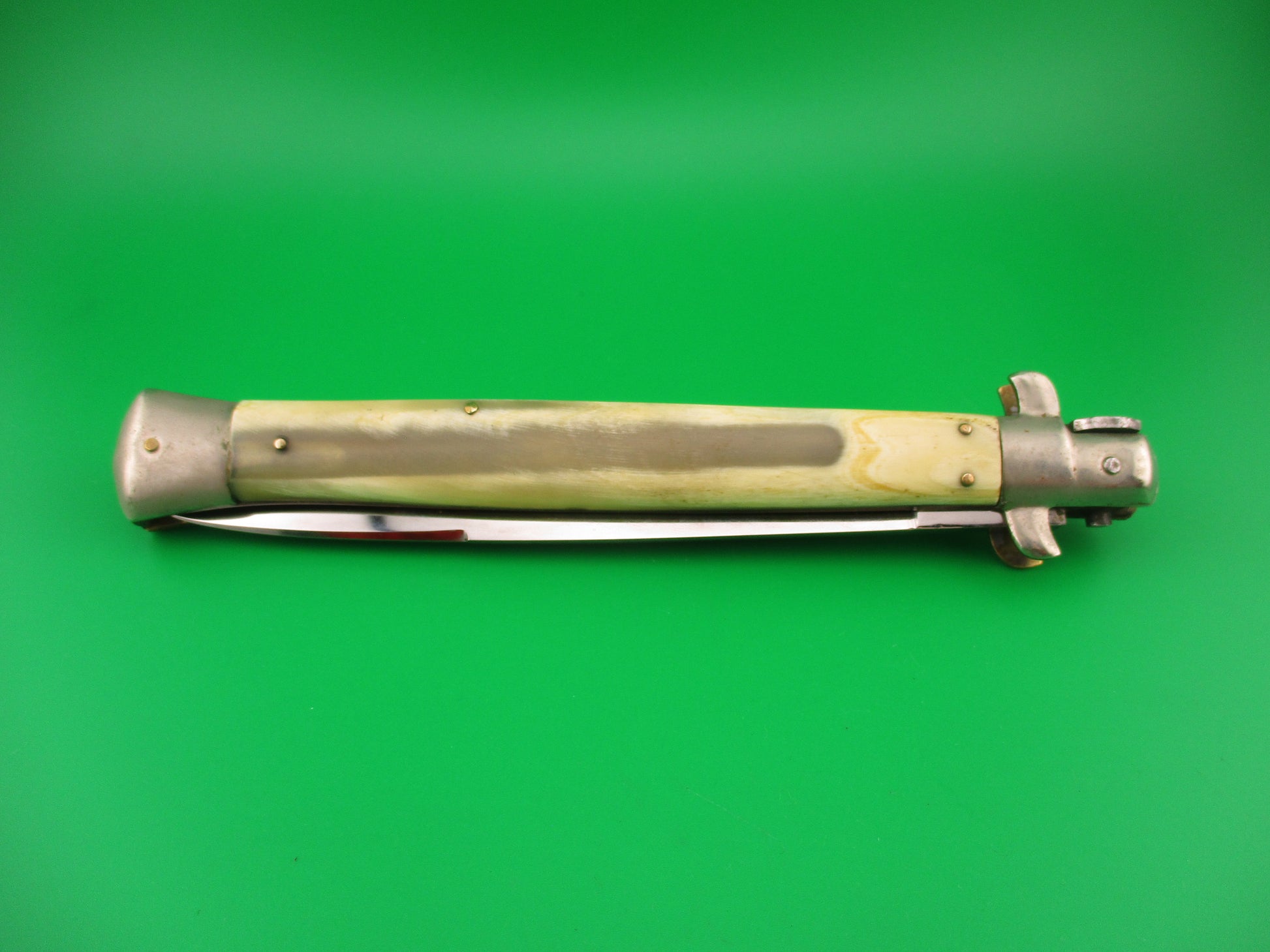 Vintage Rostfrei 33cm Italian transitional stiletto Honey & yellowed Cream 5mm backspring switchblade knife made in Italy in the 1960s. The knife measures 33.4cm (13 1/8 inches) open and 7 1/8 inches closed with D stamped brass liners and nickel silver bolsters, button and safety cap. The flat grind swedge blade is 99% full or better with original factory finish with some light scratches and is marked Rostfrei diagonally (slant) on the ricasso. The attractive horn scales (handles) are in excellent condition except for some hairline cracks by the button and range in color from Yellowed cream to honey horn. The knife works well with the blade tip centered and below liners closed, good snap and really good lockup. 5mm thick back spring & base of blade. Nice old 13 inch Italian transitional stiletto automatic knife. Safety works. VG+ condition.