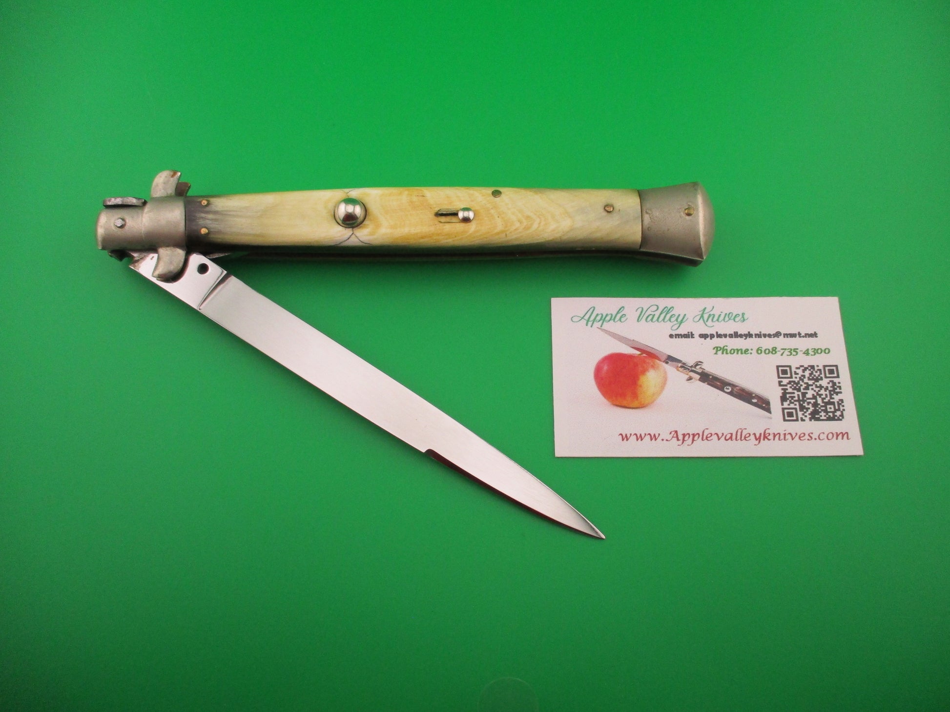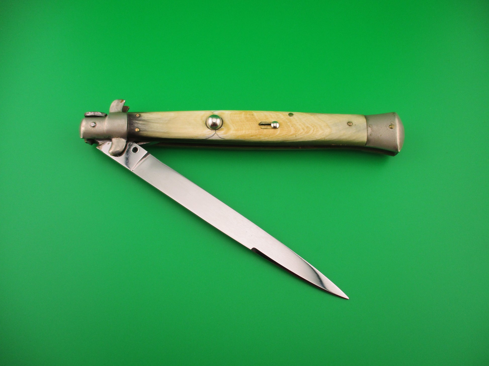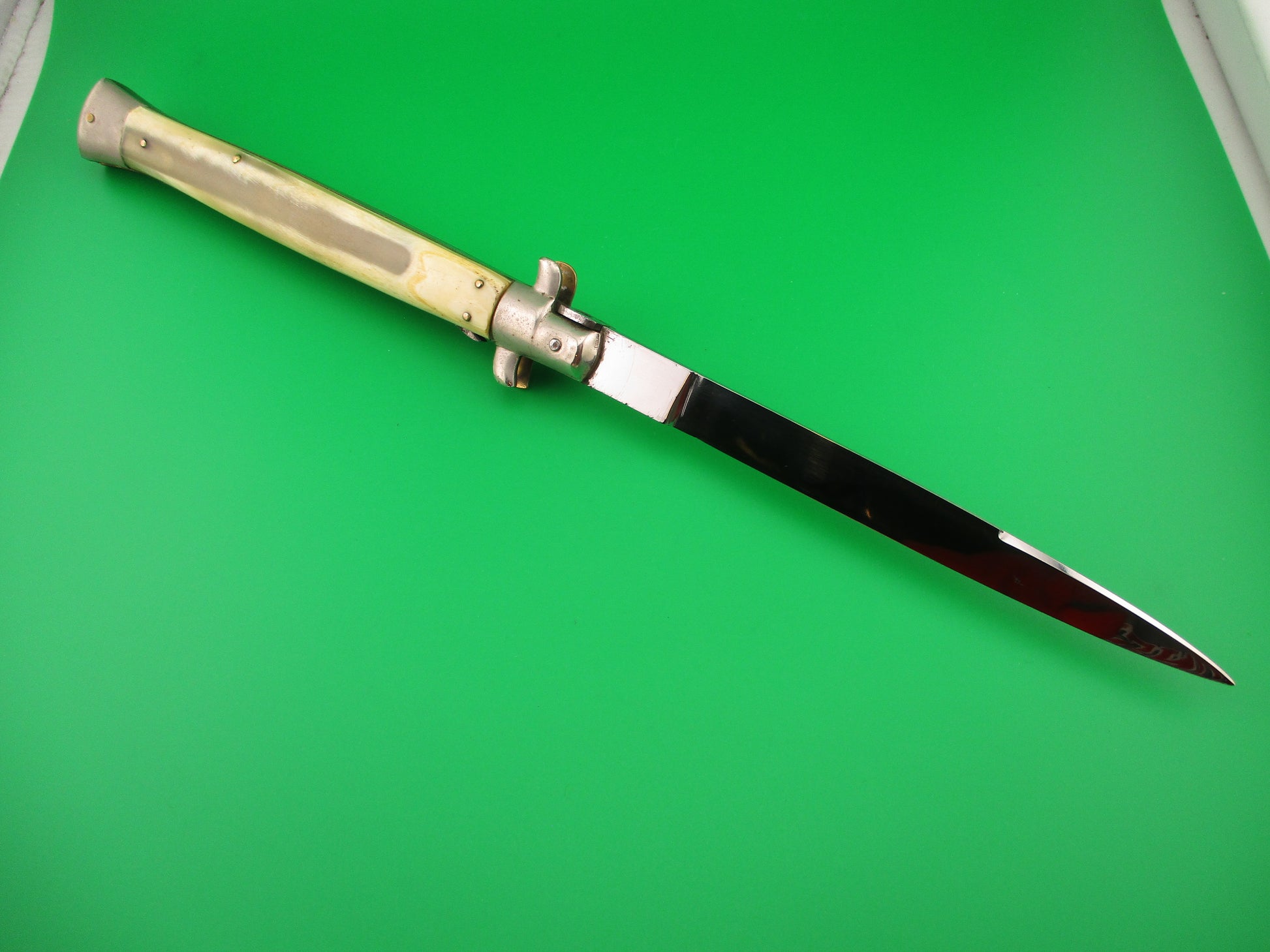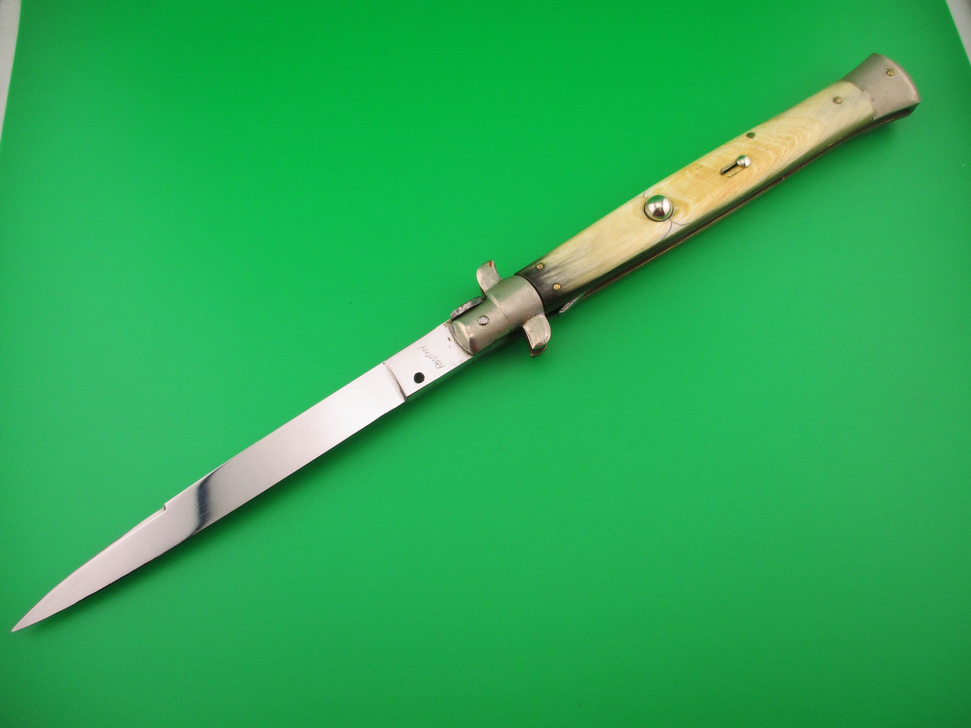 Vintage Rostfrei 33cm Italian transitional stiletto Honey & yellowed Cream 5mm backspring switchblade knife made in Italy in the 1960s. The knife measures 33.4cm (13 1/8 inches) open and 7 1/8 inches closed with D stamped brass liners and nickel silver bolsters, button and safety cap. The flat grind swedge blade is 99% full or better with original factory finish with some light scratches and is marked Rostfrei diagonally (slant) on the ricasso. The attractive horn scales (handles) are in excellent condition except for some hairline cracks by the button and range in color from Yellowed cream to honey horn. The knife works well with the blade tip centered and below liners closed, good snap and really good lockup. 5mm thick back spring & base of blade. Nice old 13 inch Italian transitional stiletto automatic knife. Safety works. VG+ condition.