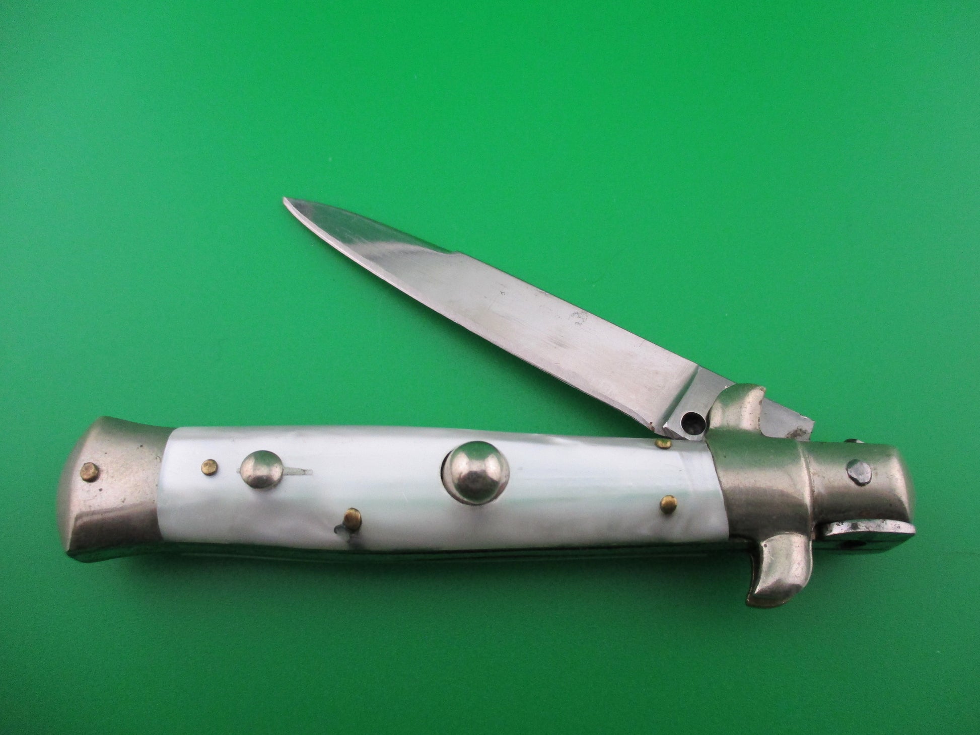 Vintage Italian transitional switchblade with pearlex scales (handles). This knife was made in Italy, most likely in the 1960s and measures 17.5 cm open (6 7/8"). The blade is nearly full with some sharpening marks and most of the original factory finish. The Pearlex (faux pearl) scales are in great condition and are very attractive. The knife works well with the blade tip seating deep, strong snap and great lockup. It's a swivel bolster release so you push down on the finger guard and pivot the bolster to release the blade to close. Just a really nice old Italian switchblade. 100% money back guarantee including return shipping if you're not happy with this knife.