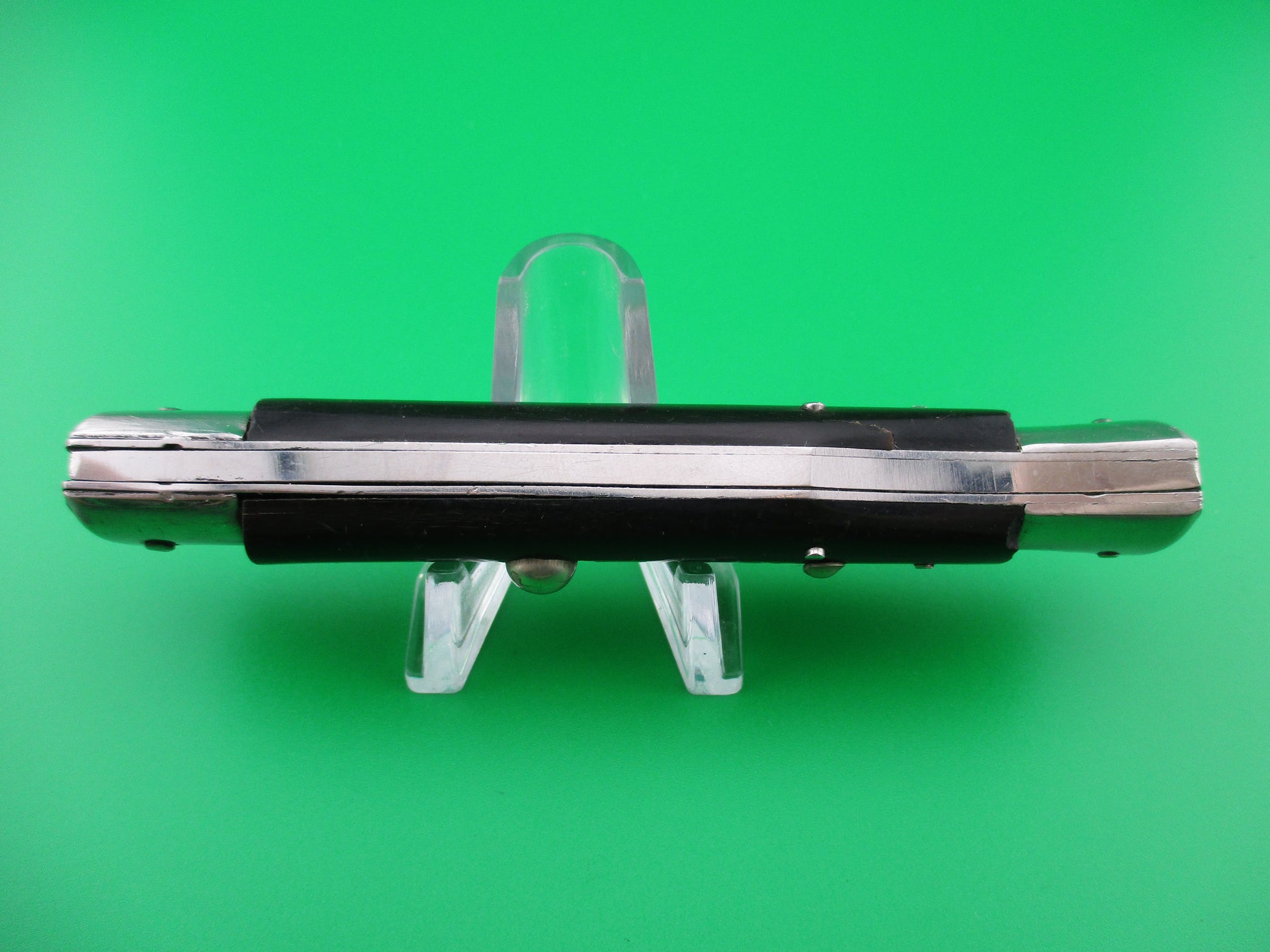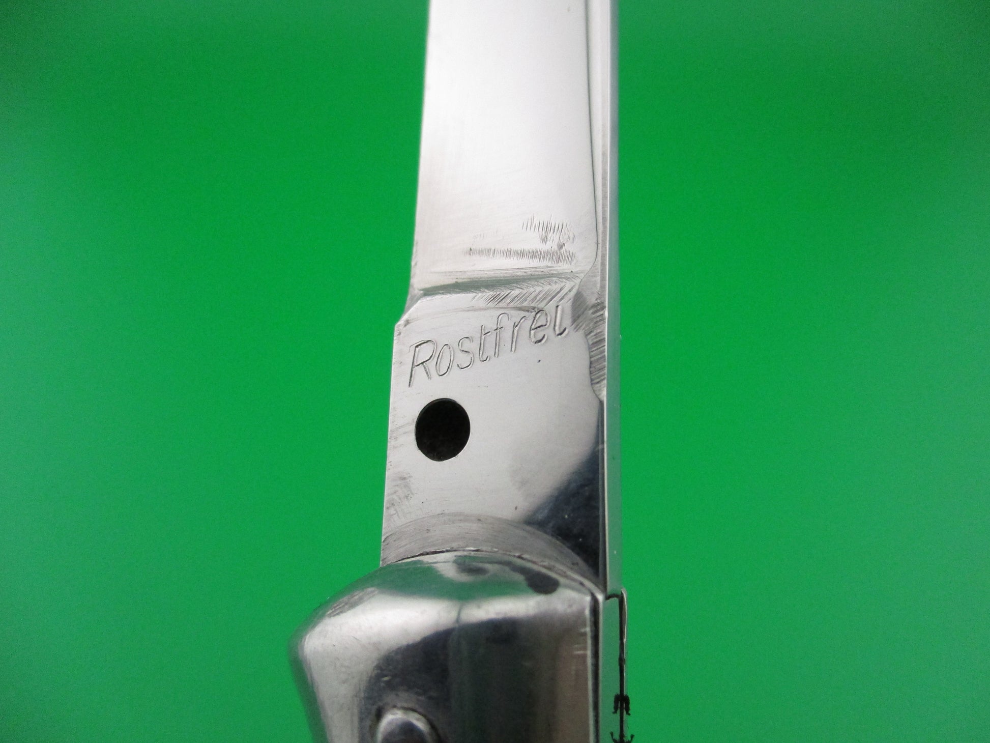 Rostfrei Vintage Italian Bird's Head BoBc automatic knife from the 1960s or 70s. The knife measures 19.5 cm (7.75 inches) open with steel liners, bolsters & button. The flat grind spearpoint blade is nearly full and shiny with scratches, mostly on the backside. The horn scales are dark with just a bit of brown streaks and in good shape except for a small missing piece by the button. The knife works well with the blade tip seating 1/8 inch above the liners closed, good snap and average lockup for this style knife. The blade can be moved some in the open position, but snaps back when you let go. Safety works. Press button to open and press button to unlock blade to close.