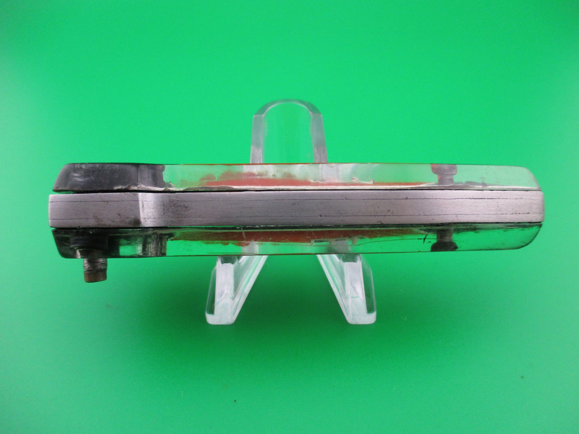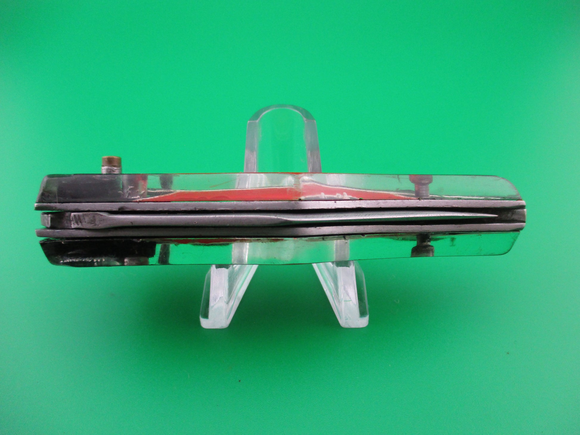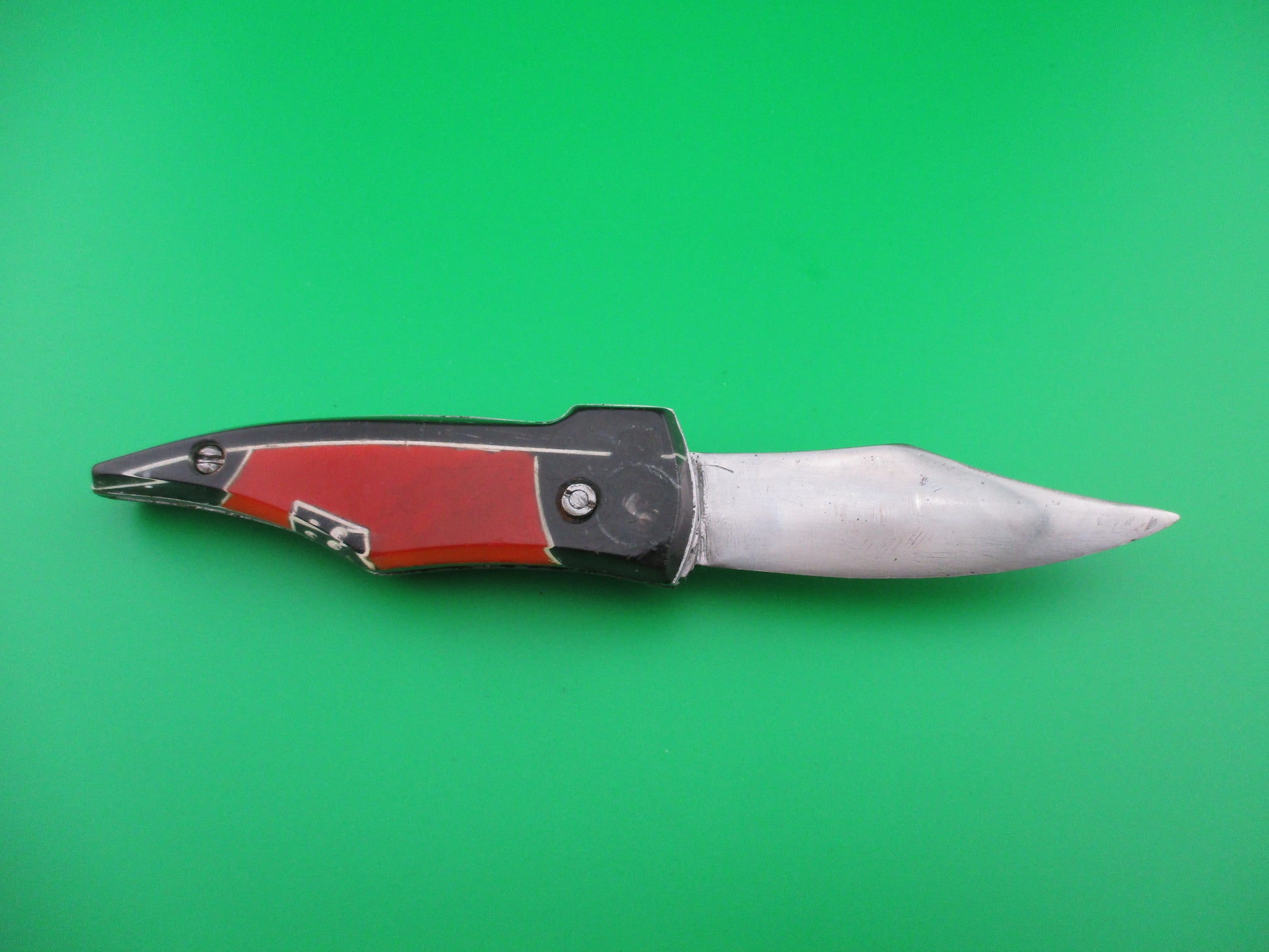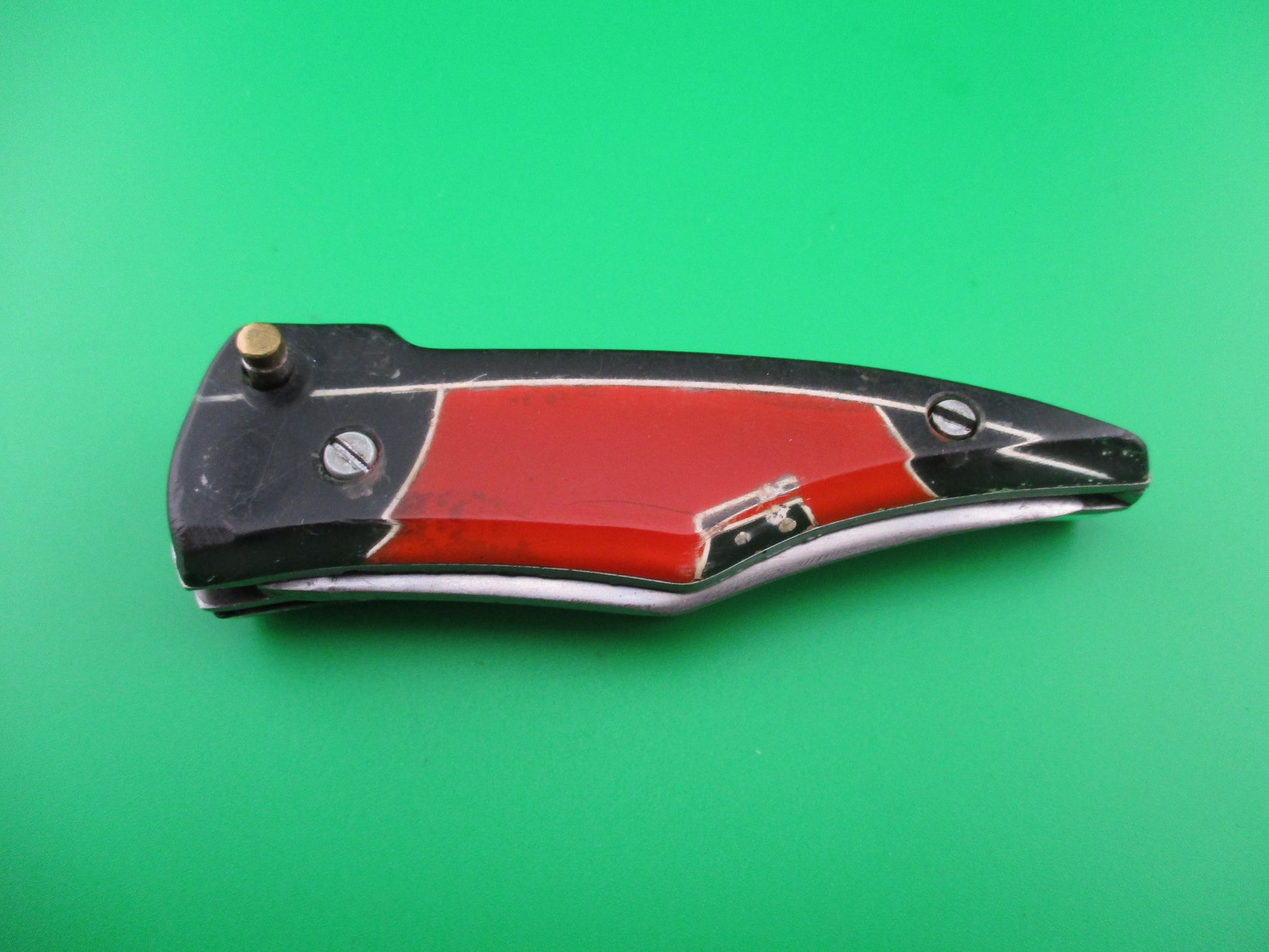RPK 17cm Russian Prison Shoe automatic knife w/ pouch. Made by inmates in USSR prisons sometime between 1940s and 1970s to be sold/traded/gifted by guards and staff. This knife measures 17cm (6 5/8 inches) open with steel liners and is shaped like a fancy shoe. The blade appears to be nearly full with patina and scratches. The scales are hand painted red/black/white shoe covered in clear acrylic held on with screws. The knife works well with blade tip just above liners closed, good snap and good lockup with just a little movement each way at the tip. Sheath seems to be made of shoe leather with some markings inside. VG+ condition.