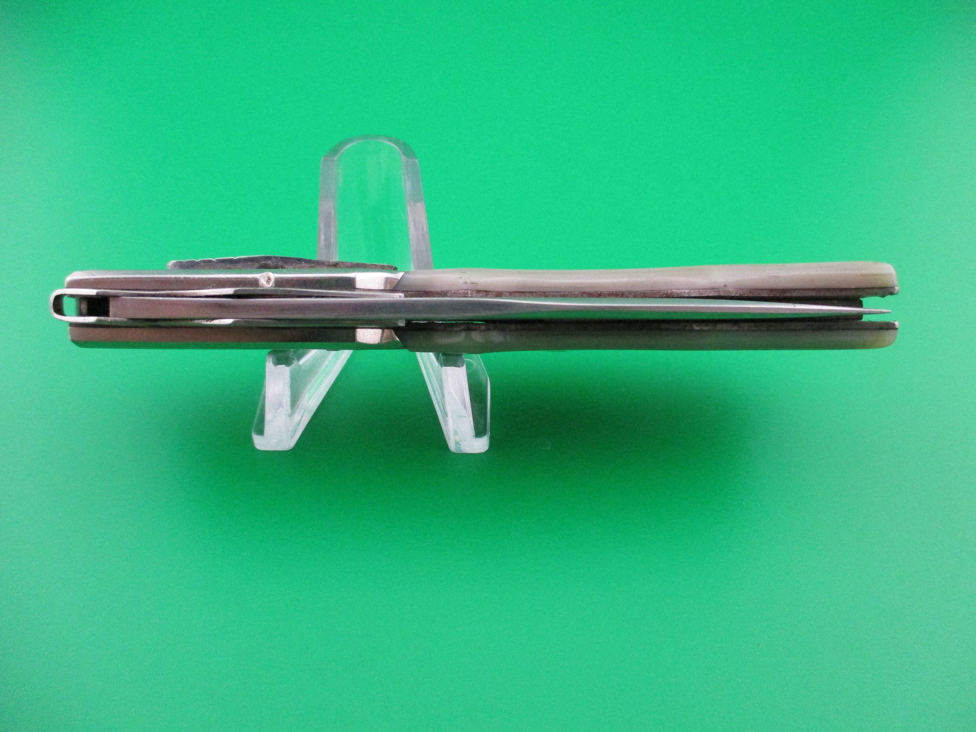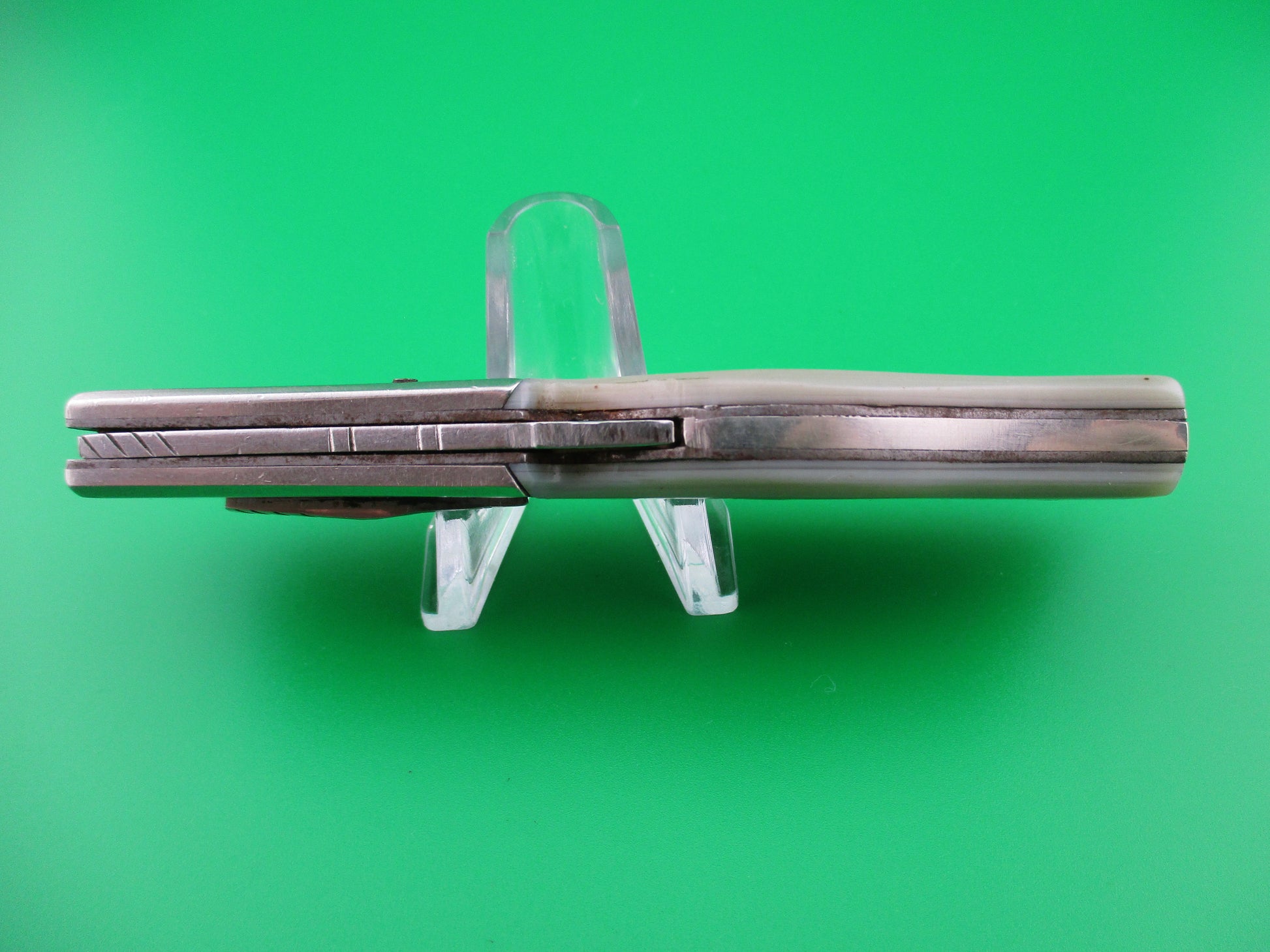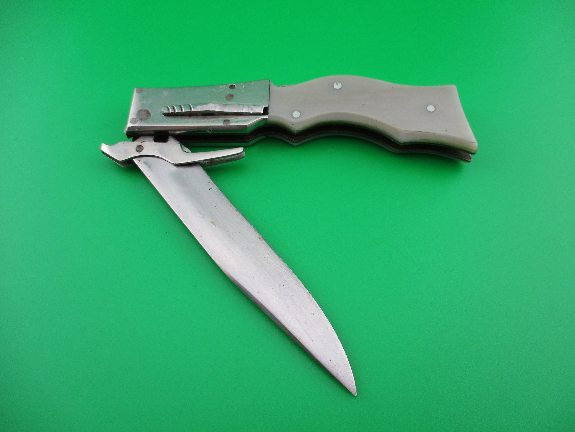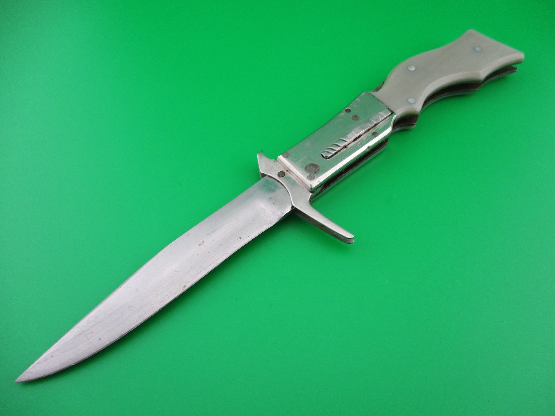RPK Russian Prison Knife Vintage Gunstock swing guard switchblade knife. These knives were made by inmates of Russian prisons back in the 1960s and 70s to be sold to raise capital for the prisons. They are all hand made and very unique and beautiful pieces of Russian cutlery Folk Art. This knife measures just over 21cm (8 3/8 inches) open with a steel liners and, aluminum bolster plates and guards. The blade is nearly full and has lots of light scratches. The knife works well with the blade tip seating below the liners when closed, smooth snap and good lockup when open. It is button open, backspring release close. Very cool vintage Russian RPK gunstock swinger switchblade.