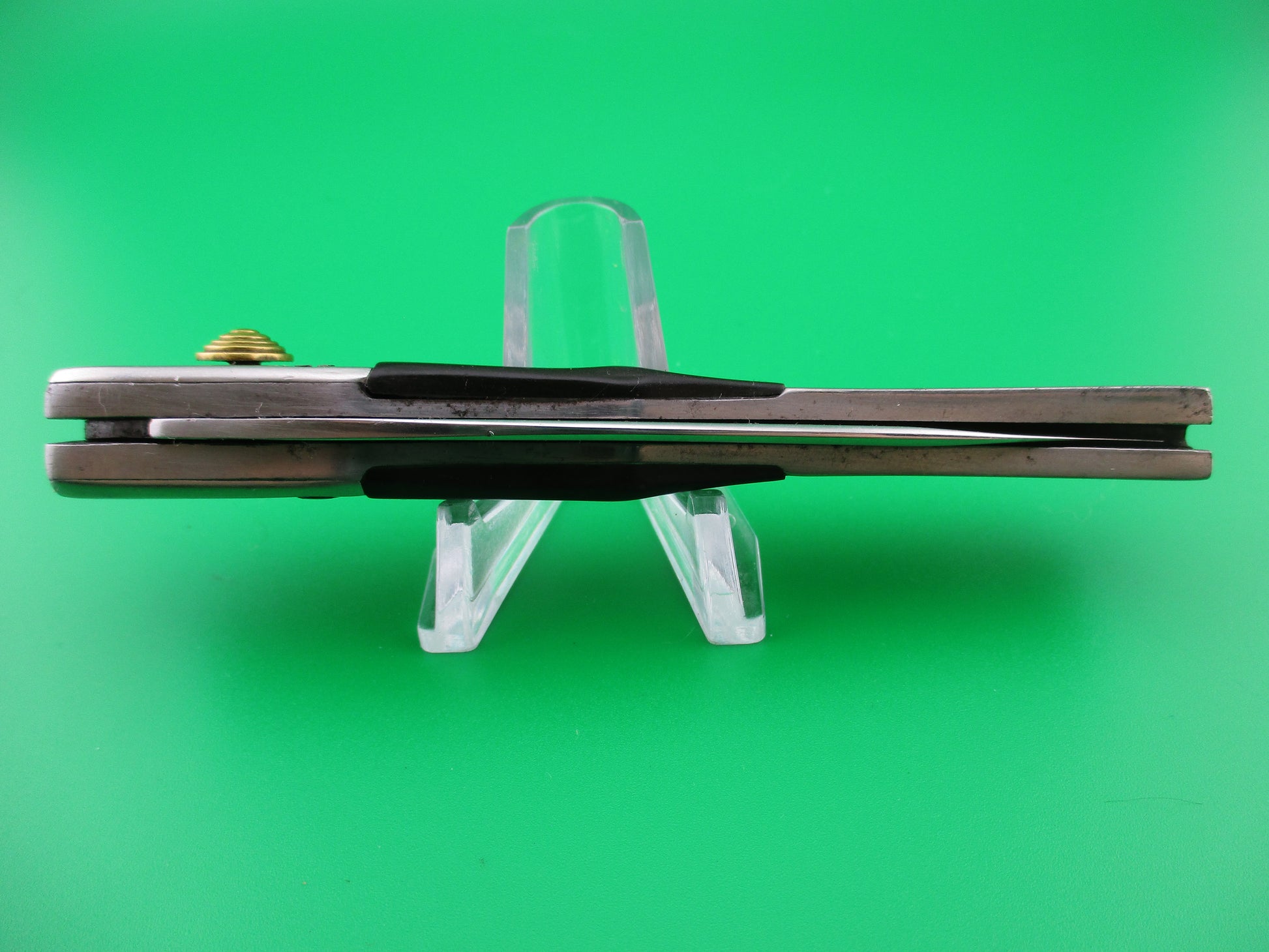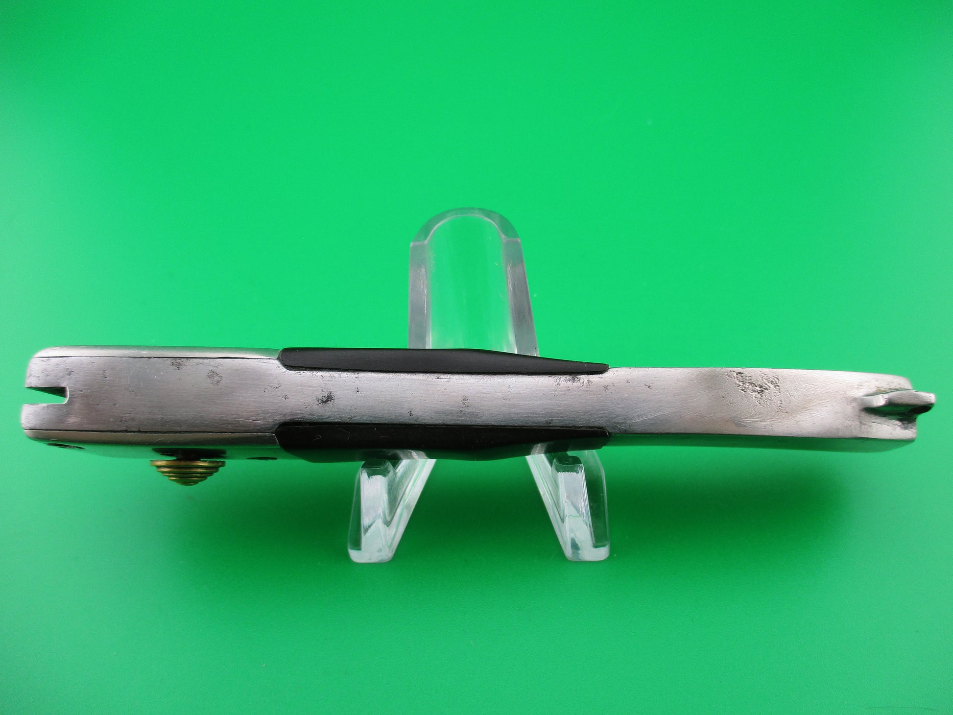 Vintage Russian RPK (Russian Prison Knife) switchblade. These knives were made by inmates of Russian prisons back in the 1960s and 70s to be sold to raise capital for the prisons. They were all hand made and very unique and beautiful pieces of Russian cutlery Folk Art. This knife measures 21cm (8.25 inches) open with steel liners/frame and aluminum bolster plates. The saber grind drop point blade is full and shiny. Ebony inserts in the steel frame, overall good condition with hole near the back for lanyard ring. The knife works well with the blade tip seating deep in the well when closed, smooth snap and super tight lockup when open. Button slides to open and to release blade to close. EX+ condition.