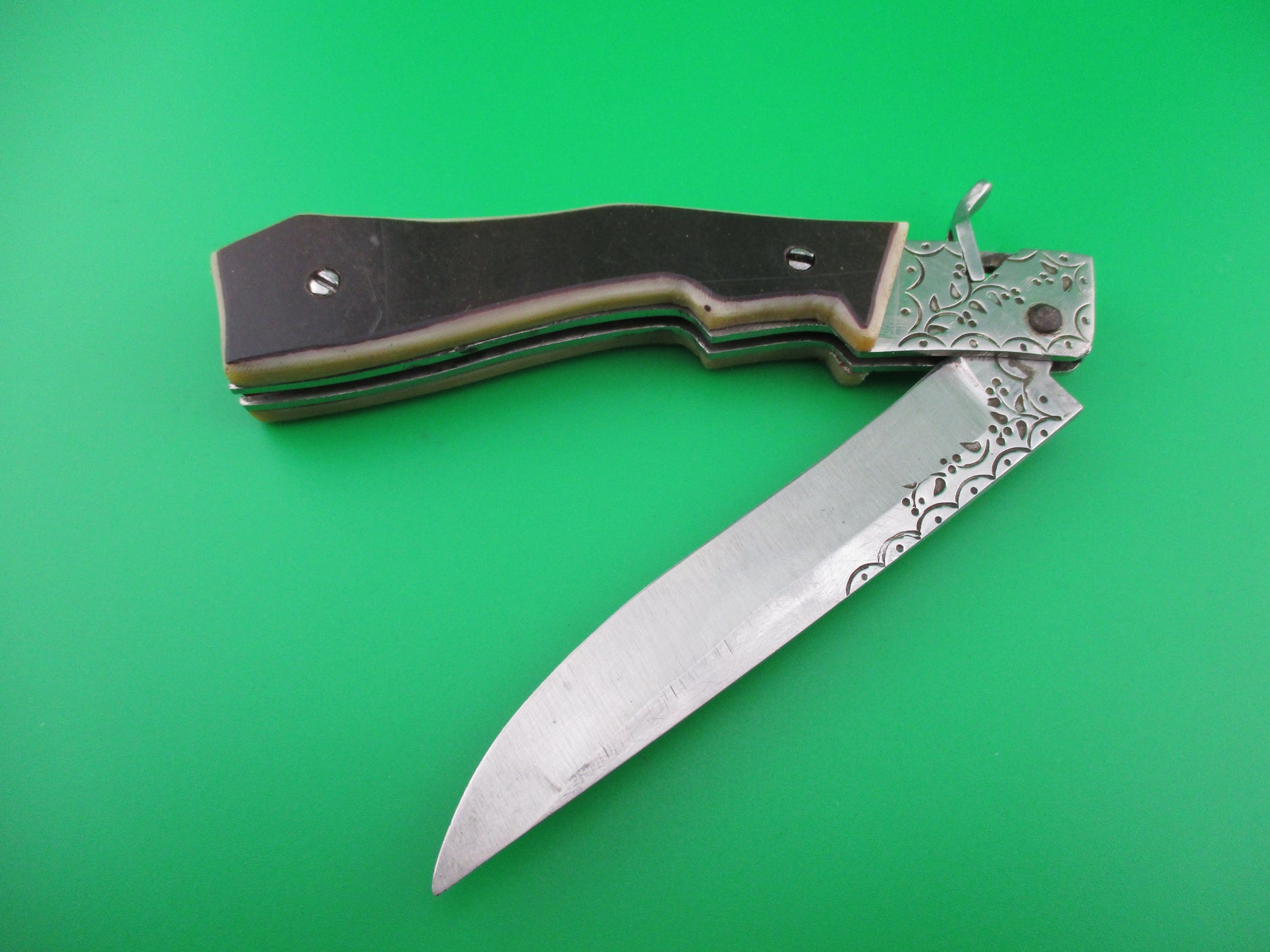 RPK 22cm Russian Prison Knife Manual opening decorative knife. These knives were made by inmates of USSR prisons between mid 1940s and 1980s to be sold, or traded, mostly by the guards. This knife is not automatic. Pull blade open and it locks. Push lever to lift backspring to close. It measures 22cm (8 1/2 inches) open with steel frame. The straight back saber blade appears to be nearly full with some engraving that ties in with the bolsters. The two tone plastic scales are in good condition with scratches from handling. Works well, blade locks open. VG+ condition.