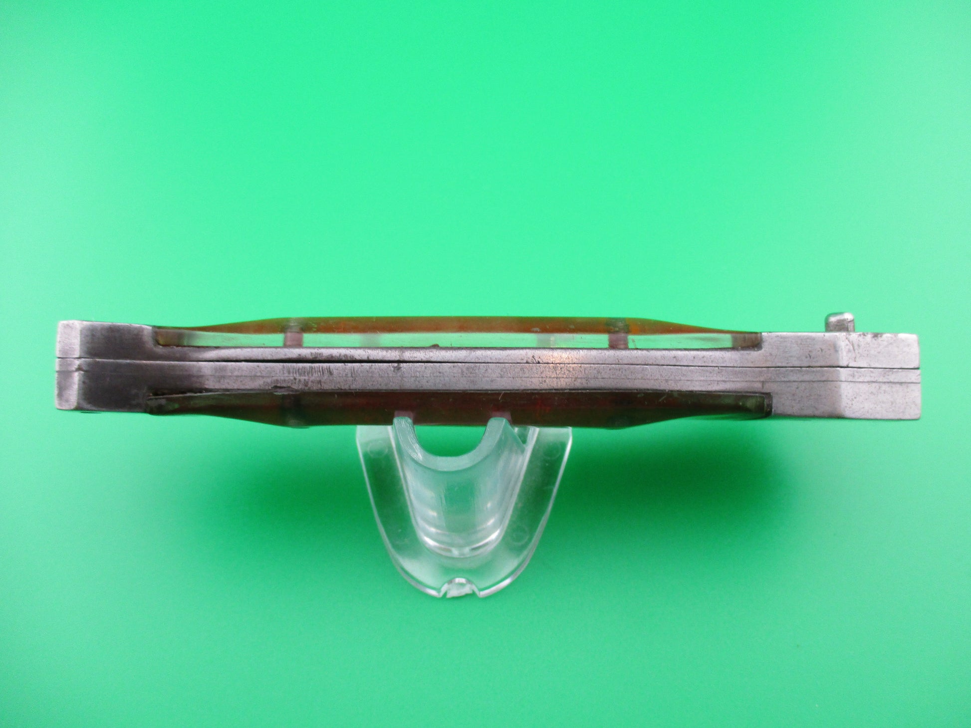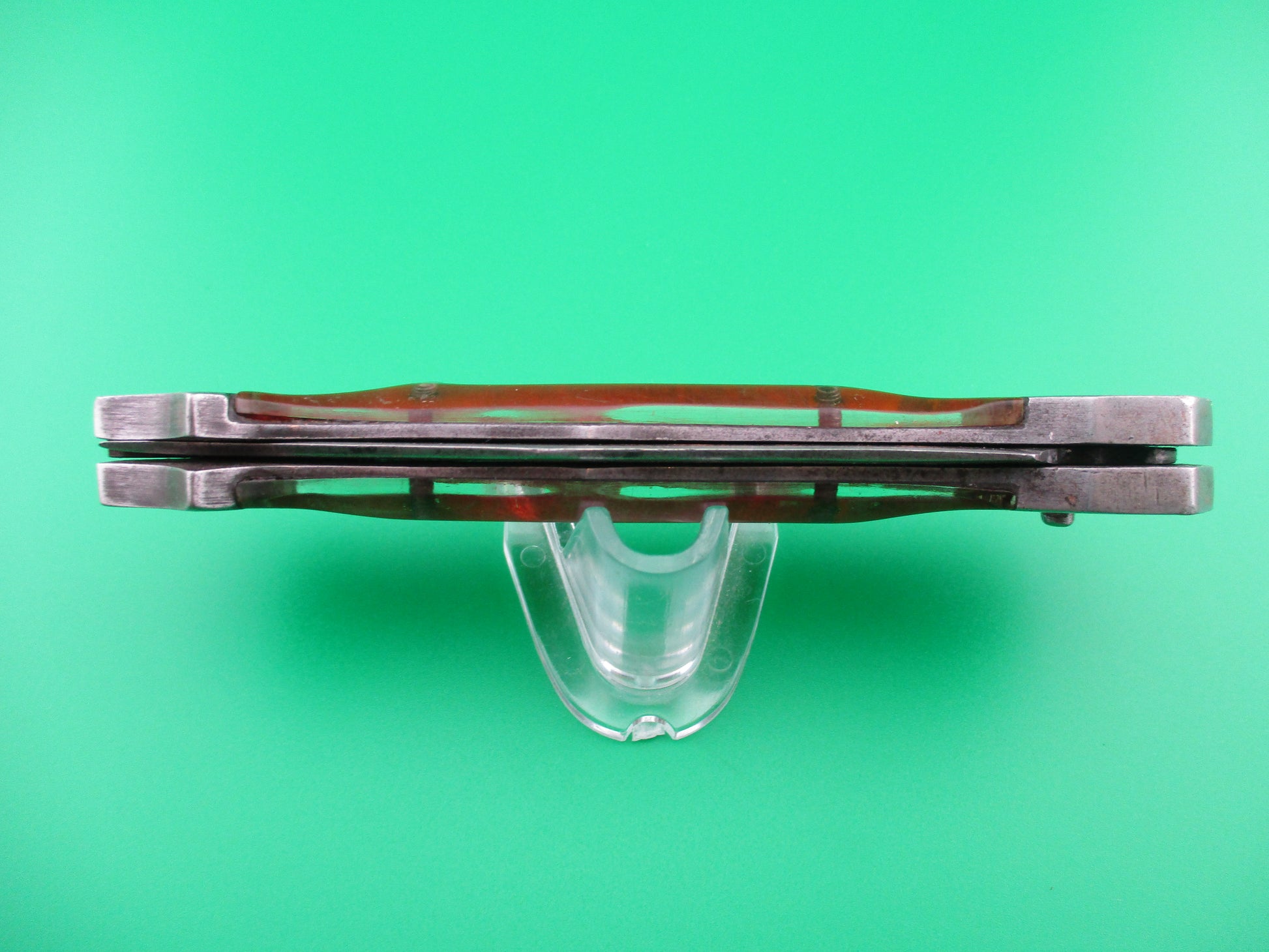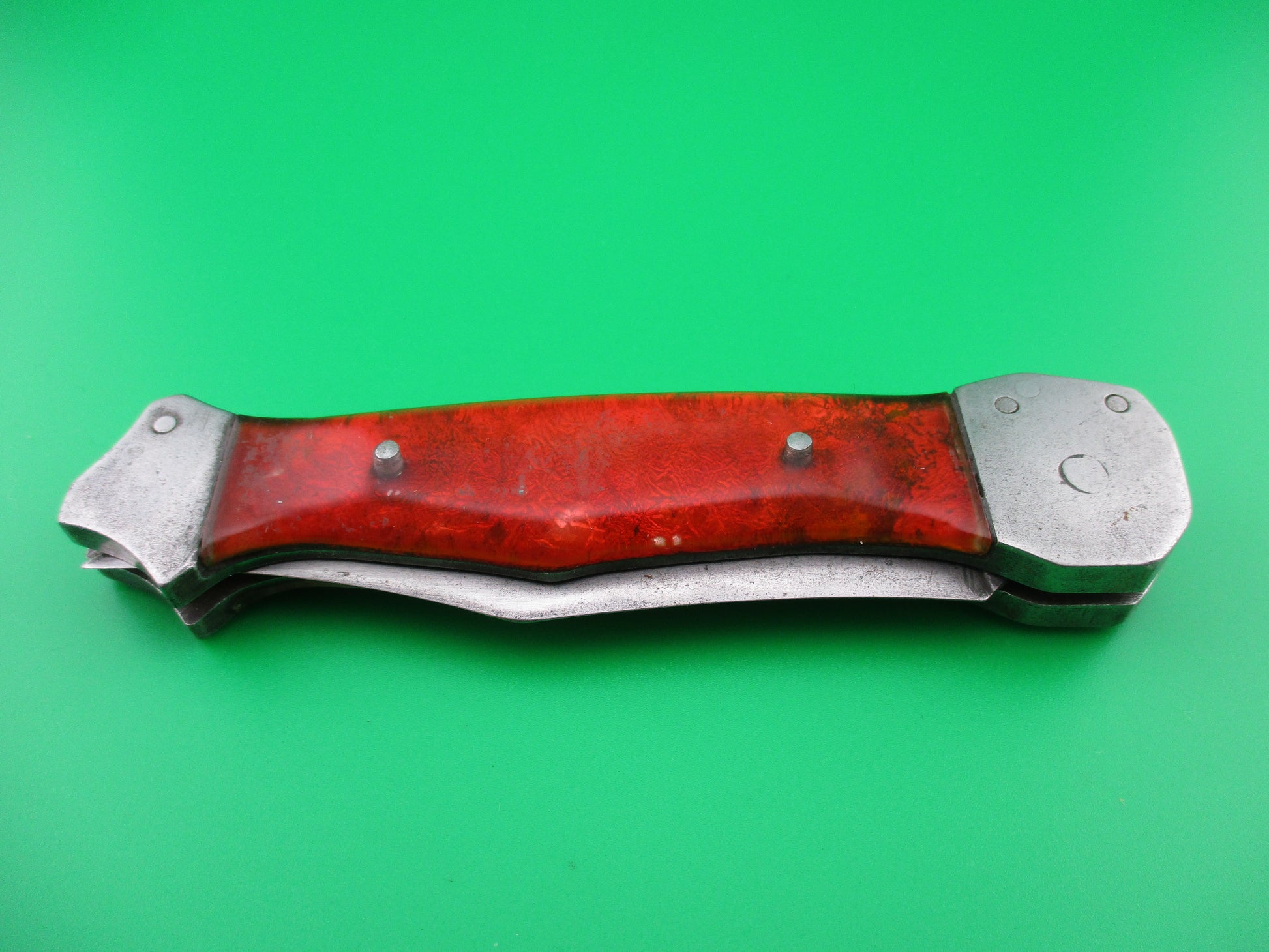 RPK Russian Prison Knife Vintage Red Sparkle switchblade knife. These knives were made by inmates of Russian prisons back in the 1960s and 70s to be sold to raise capital for the prisons. They are all hand made and very unique and beautiful pieces of Russian cutlery Folk Art. This knife measures 22.5cm (9 inches) open with a steel frame and bolster plates. The unusually shaped carbon steel blade appears to be full and has heavy patina and some peppering as do the bolsters. The sparkly Red scales are actually clear acrylic over some sort of red foil, I believe and are in nice condition. The knife works well with the blade tip seating deep in the well when closed, smooth strong snap and good lockup when open with some movement, but springs right back. It is button open, button close. Very cool vintage Russian RPK switchblade.