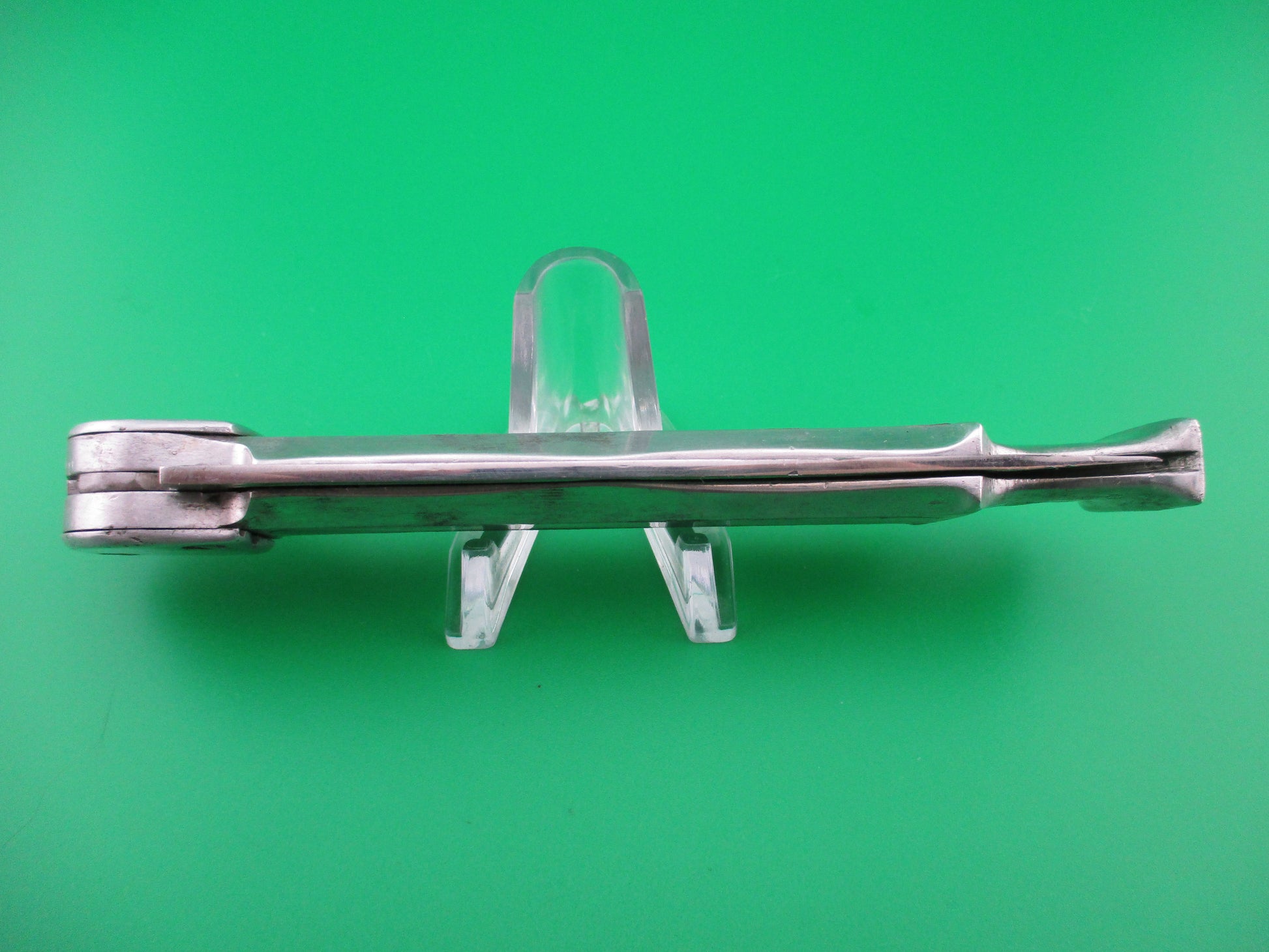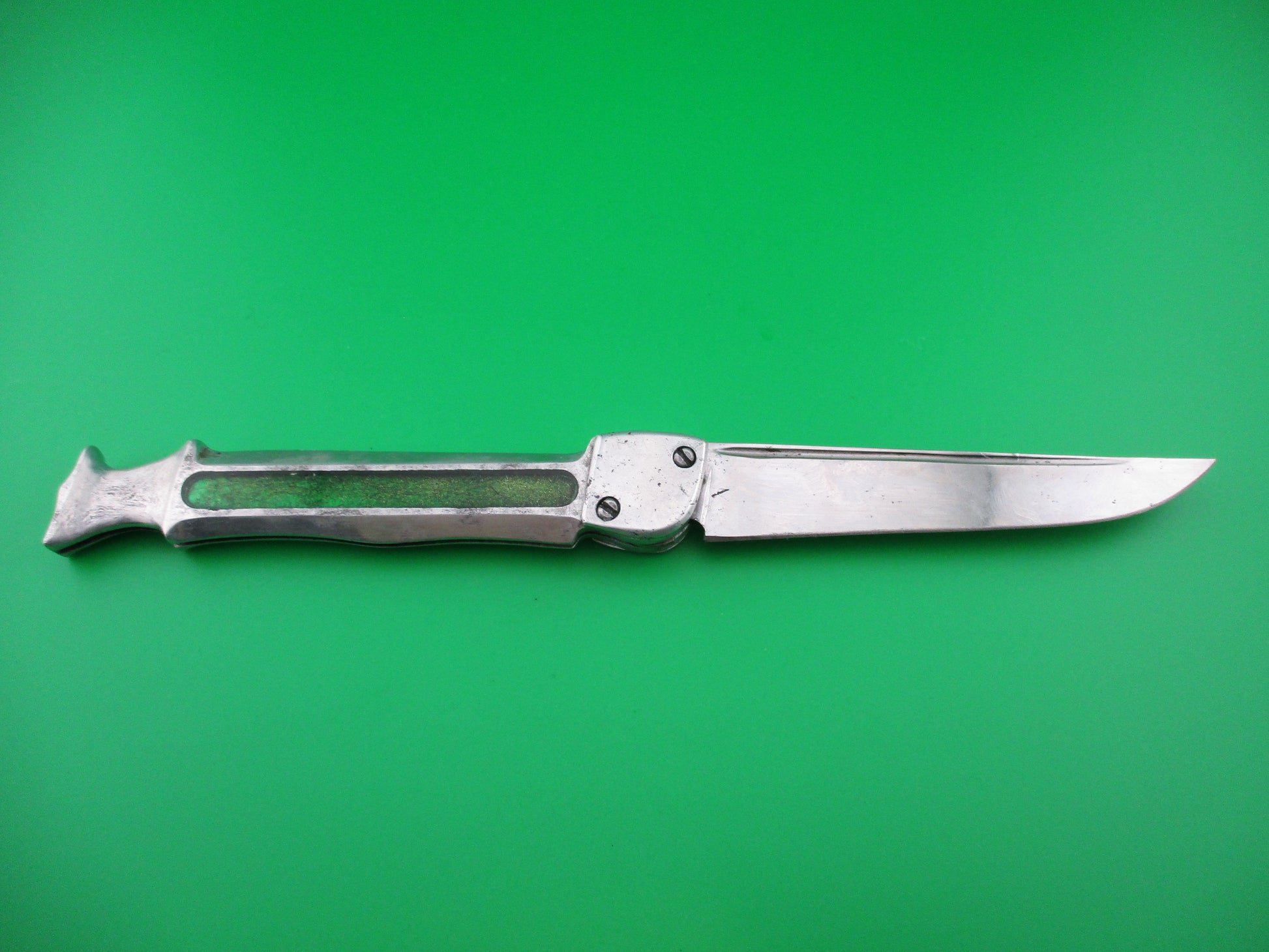 RPK 24cm Russian Prison Knife Aluminum Hollow ground Green switchblade. Made by inmates of USSR prisons between mid 1940s and 1970s to be sold, traded, gifted by guards and staff. This one measures 23.5cm (9 3/8 inches) open with aluminum frame. The straight back hollow ground blade is nearly full and shiny. The Aluminum frame has an unusual shape and green sparkly inserts covered by clear acrylic. Aluminum service plates held on by screws. Knife works great. Blade tip seats well, strong snap and Tight lockup! EX condition.