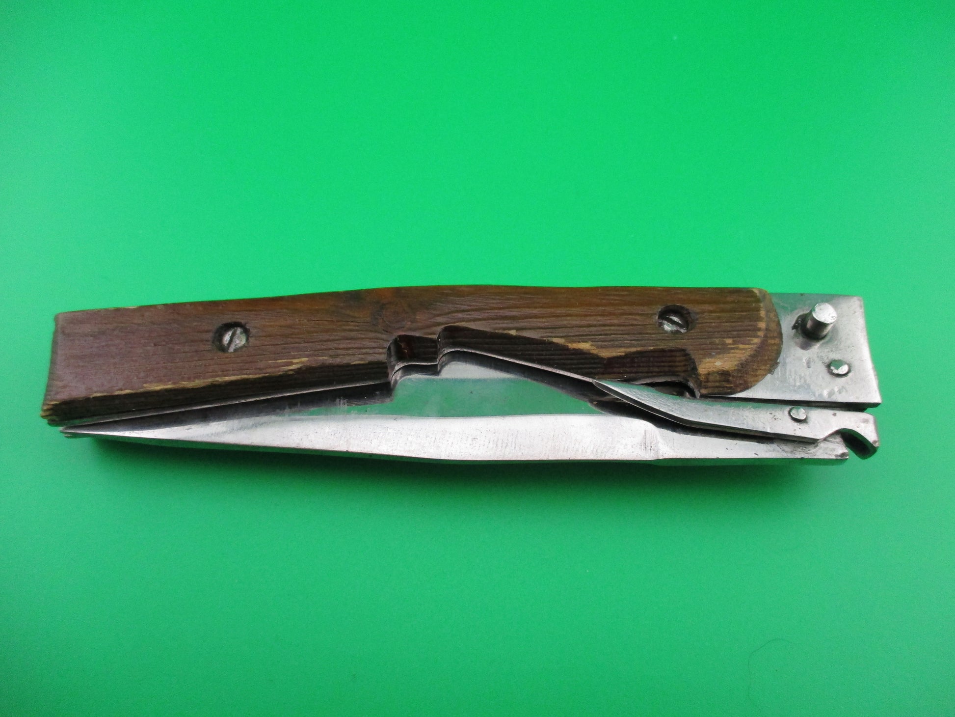 Vintage Russian RPK (Russian Prison Knife) switchblade. It is believed that these knives were made by inmates of Russian prisons back in the 1950s through the 1970s to be sold to raise capital for the prisons and given by prison personnel as bribes and gifts. They are all hand made and very unique and beautiful pieces of Russian cutlery Folk Art. This knife measures 24cm (9.5 inches) open with steel liners and guards. The saber grind straight back blade is nearly full and shiny with lots of scratches. Soft wood scales are in good condition with some finish loss. The knife works well with the blade tip seating deep in the well when closed, smooth strong snap and Tight lockup when open. Press button to open and press button to release blade to close. VG condition.