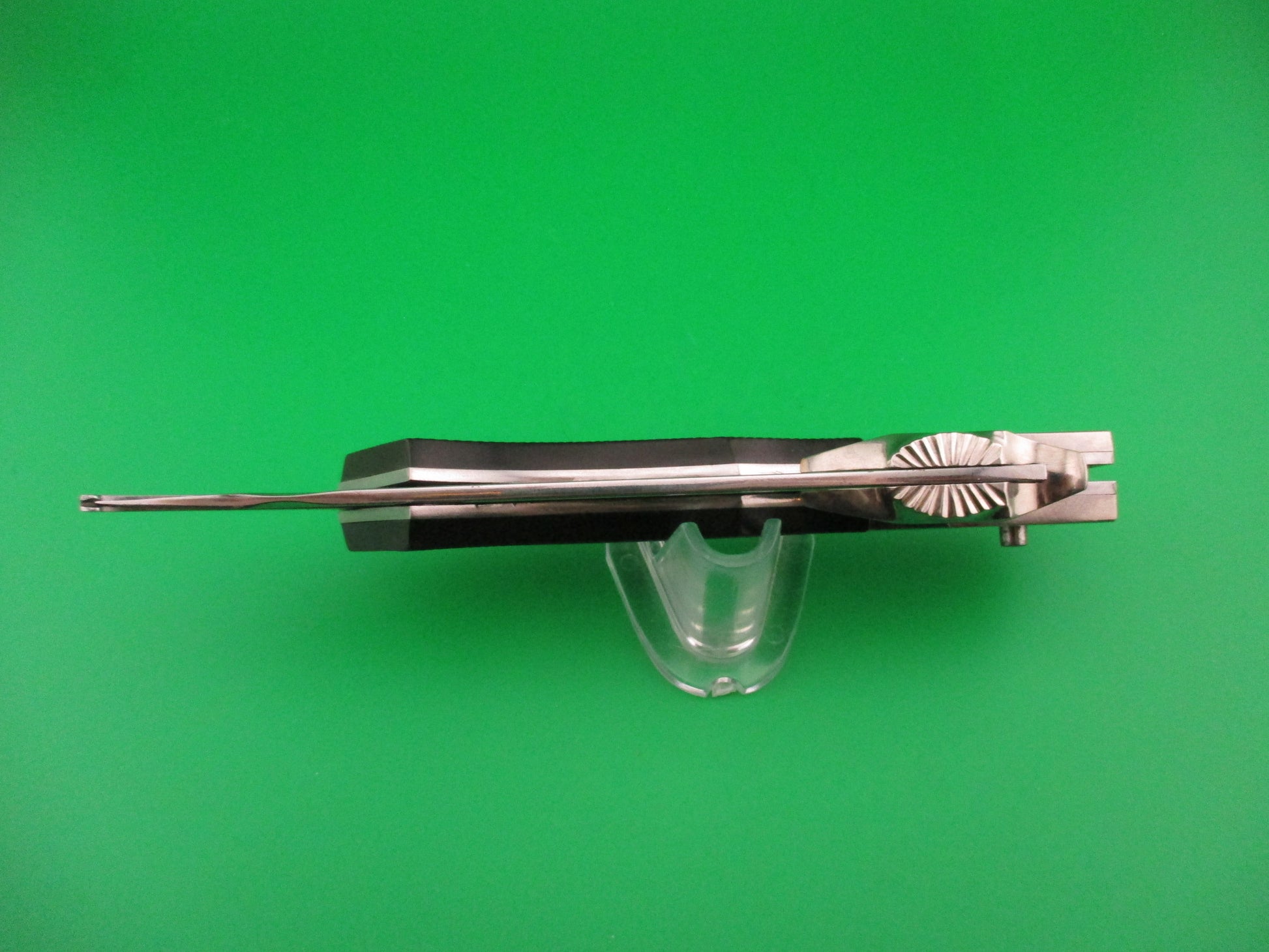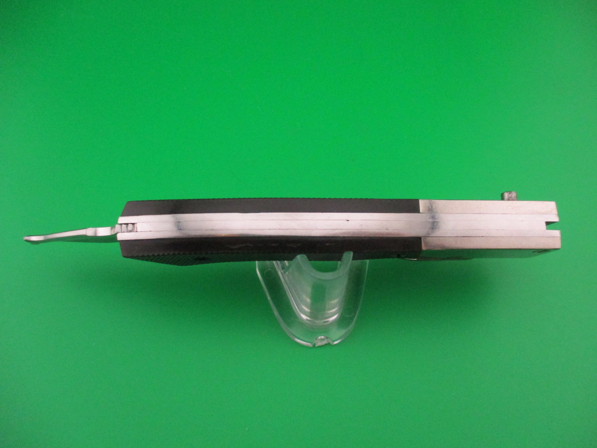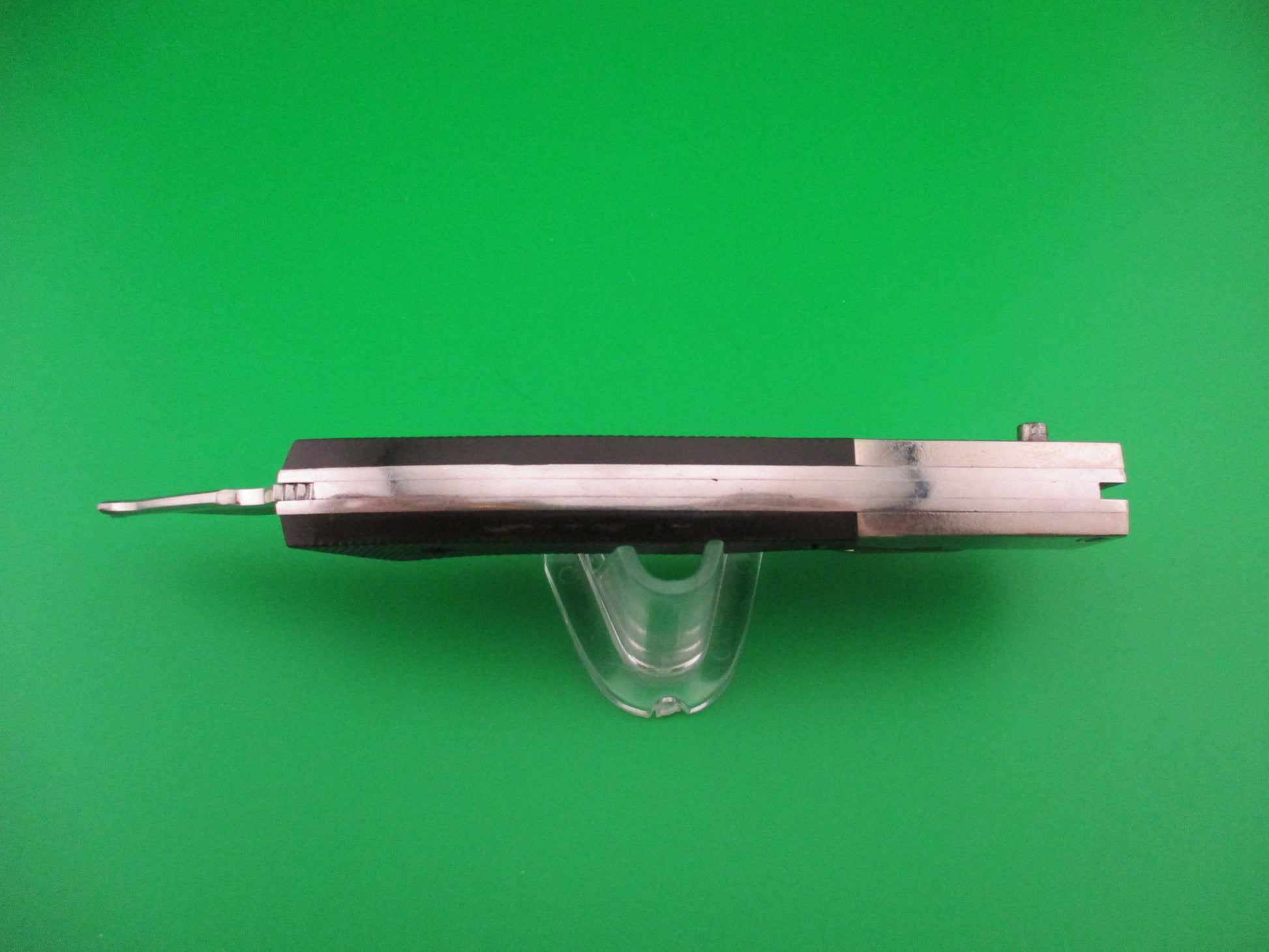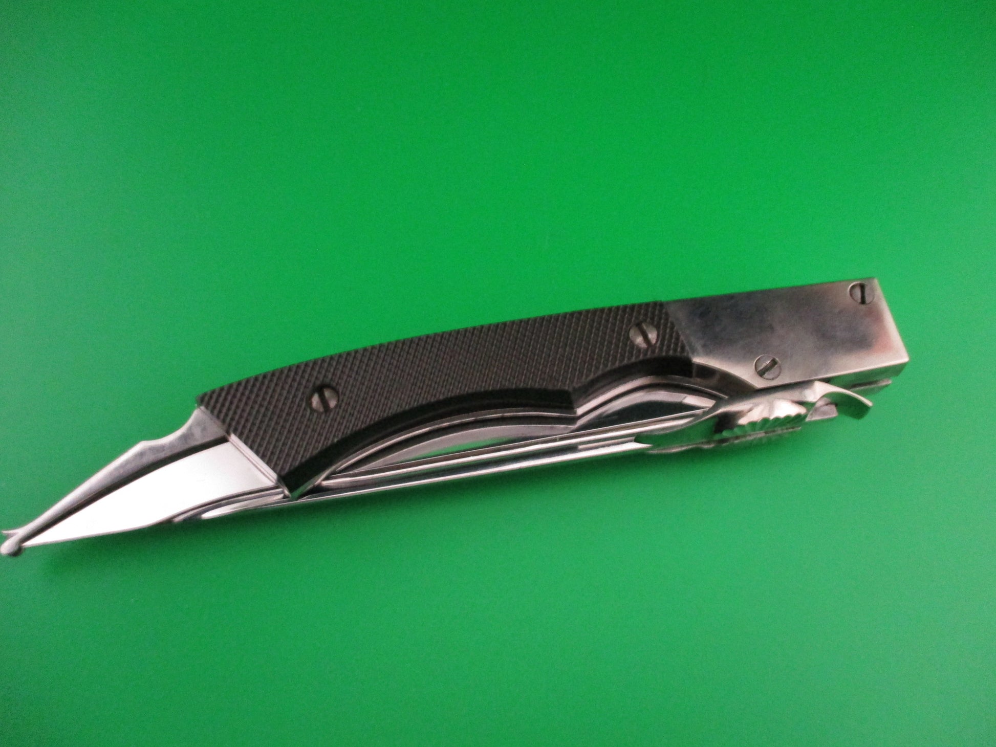 Vintage RPK Russian Prison Knife swing guard extended blade switchblade knife. It is believed that these knives were made by inmates of Russian prisons back in the 1960s and 70s to be sold to raise capital for the prisons. They are all hand made and very unique and beautiful pieces of Russian cutlery Folk Art. This knife measures just 26 cm (10 3/16 inches) open with steel liners & button and non magnetic bolster plates & guards. The oversize hollow ground long straight back blade appears to be full with no markings and the folding guards are one piece and engraved on the front. The scales are checkered black plastic and in excellent condition. There is a spring loaded blade tip guard that folds into the knife when it opens and you need to pull it out before closing the knife. The knife works well with the blade tip seating in the guard, smooth strong snap and tight lockup when open. It is button open, button to close. Very cool vintage Russian RPK pig sticker swing guard switchblade. It does take a little practice and both hands to close, but not too bad with a little practice.