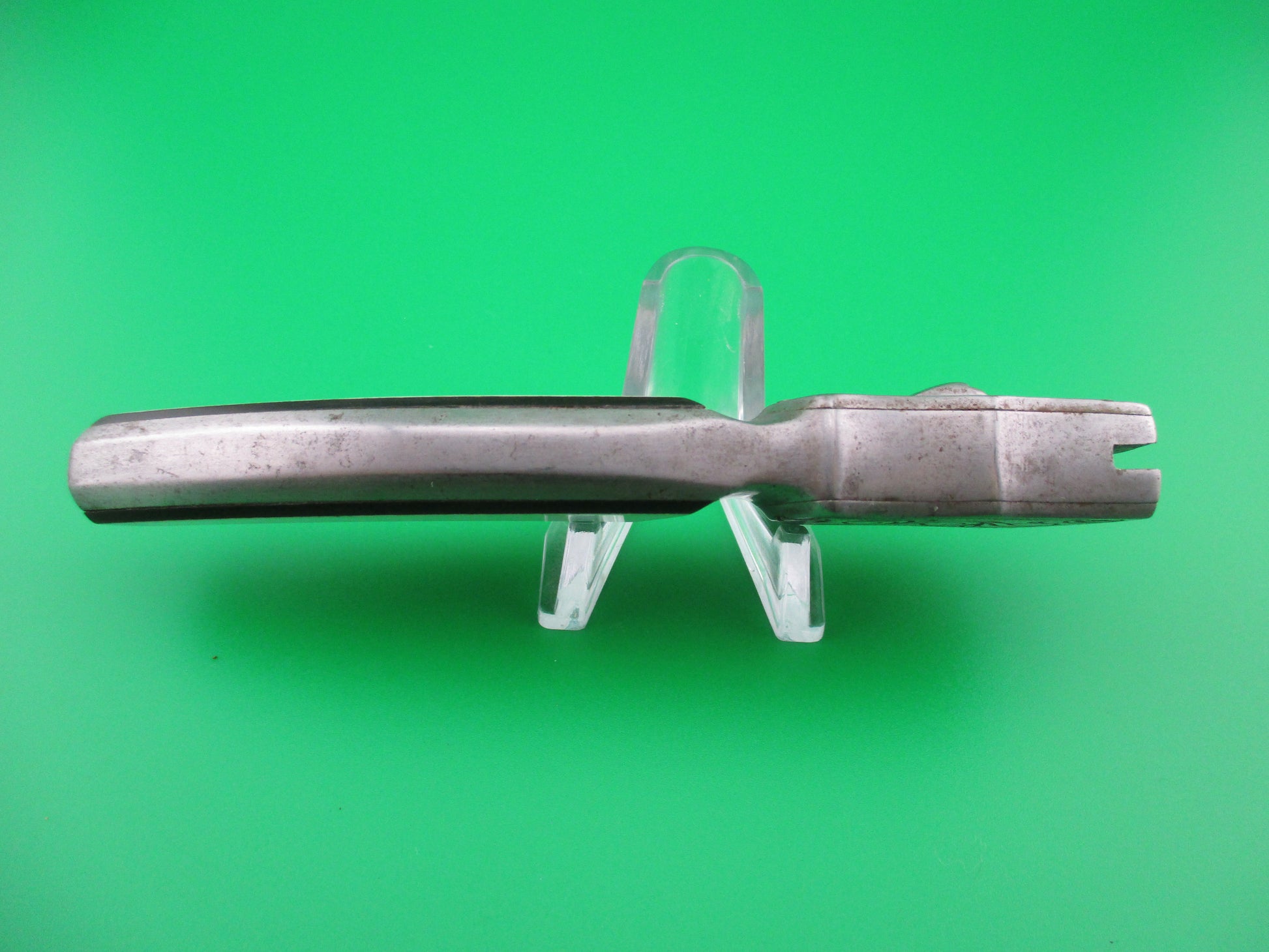 Vintage Russian RPK (Russian Prison Knife) switchblade. These knives were made by inmates of Russian prisons back in the 1960s and 70s to be sold to raise capital for the prisons. They are all hand made and very unique and beautiful pieces of Russian cutlery Folk Art. This knife measures 22cm (8.75 inches) open with a steel frame and carbon steel blade. I believe the blade to be nearly full and it has been lightly sharpened. The knife works well with the blade tip seating deep in the well when closed, smooth snap (not strong, but opens fully) and good lockup when open. The blade is activated by sliding the button down toward the bottom (back) of the knife. I'm not sure what the scale (handle) material is, but nice black & white (tuxedo) in very good condition. Very cool vintage Russian RPK switchblade.