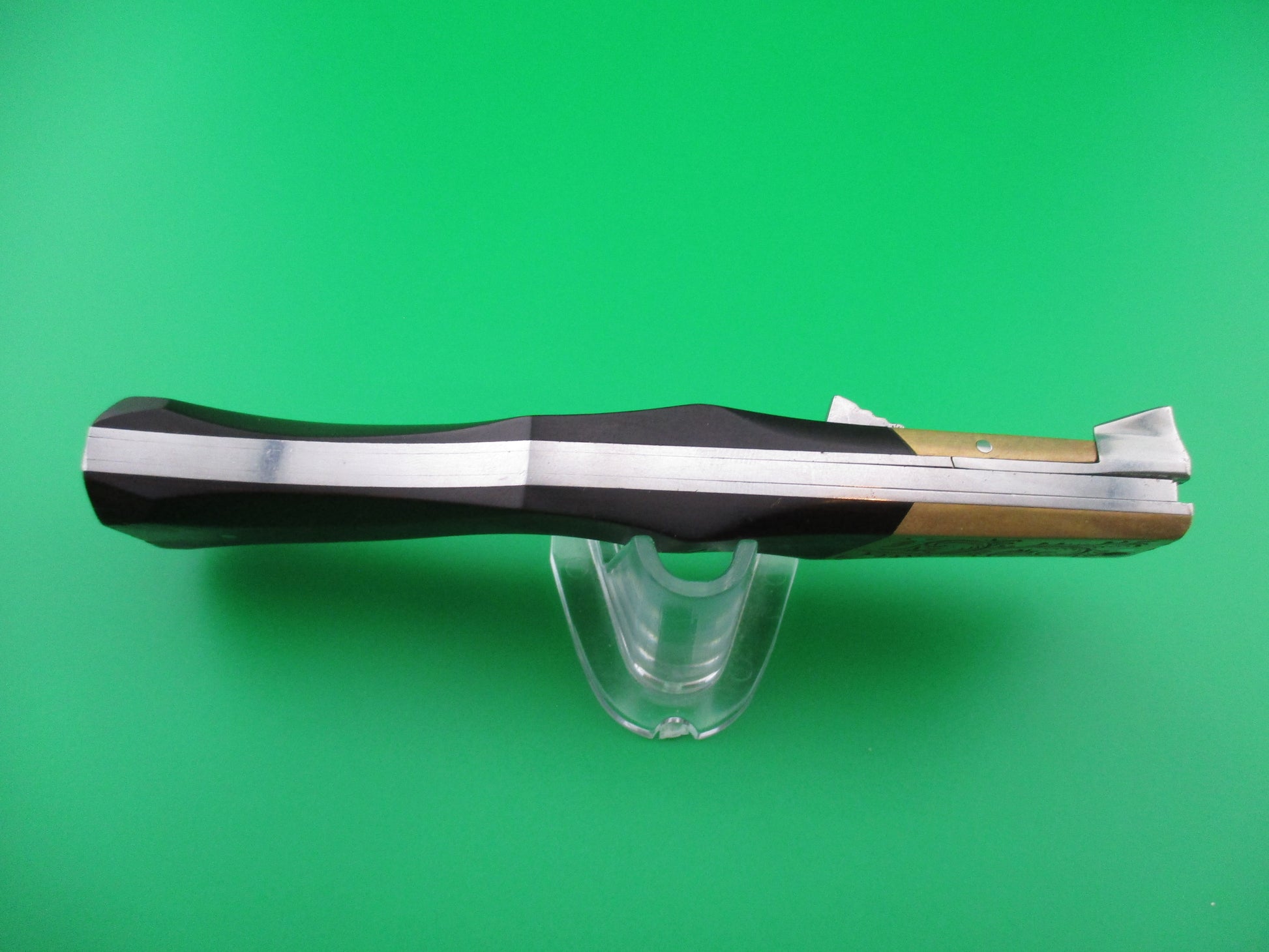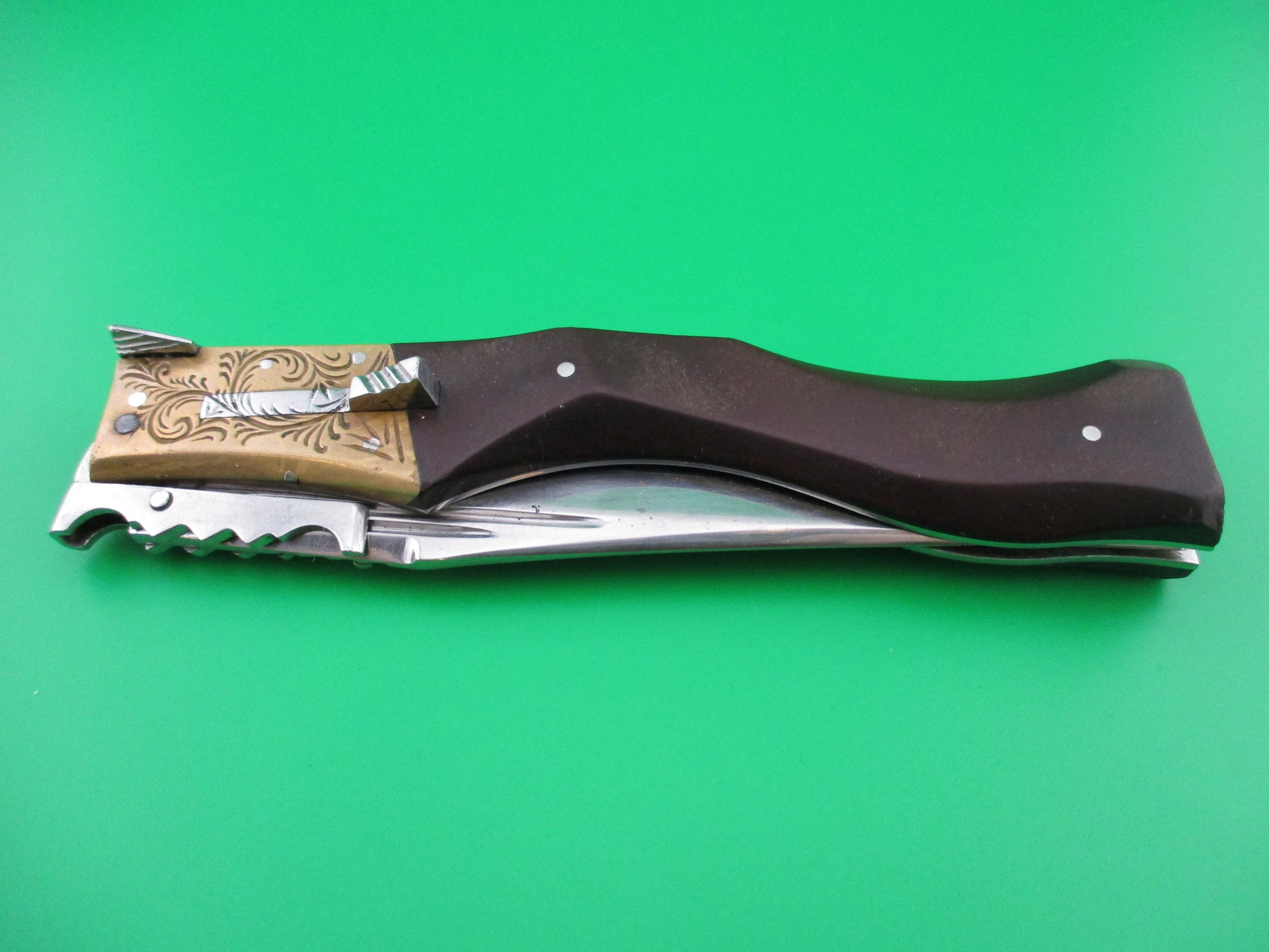 RPK Russian Prison Knife Vintage Gunstock Swing Guard switchblade knife. These knives were made by inmates of Russian prisons back in the 1960s and 70s to be sold to raise capital for the prisons. They are all hand made and very unique and beautiful pieces of Russian cutlery Folk Art. This knife measures 26cm (10.25 inches) open with a steel frame, button and swing guards and brass engraved bolsters. The hollow ground long clip blade is nearly full and has all of the original finish with some light scratches and no markings. The gunstock shaped scales are brown synthetic and are in nice condition. The knife works well with the blade tip seating deep in the well when closed, smooth strong snap and decent lockup when open with a little movement each way and rattles if shaken when open. The blade is activated by pressing the rectangular button and is closed with a picklock backspring release. Very cool vintage Russian RPK gunstock swing guard switchblade.