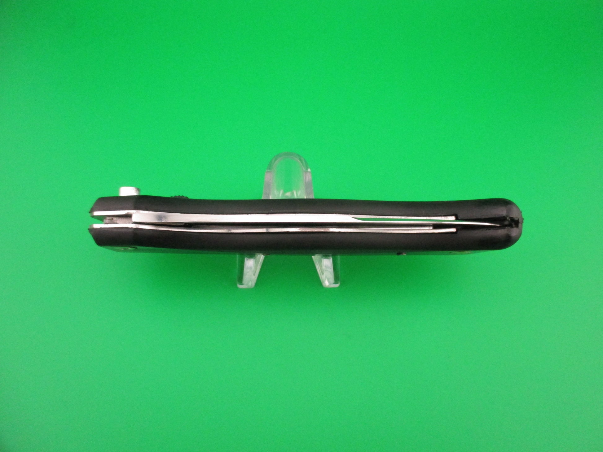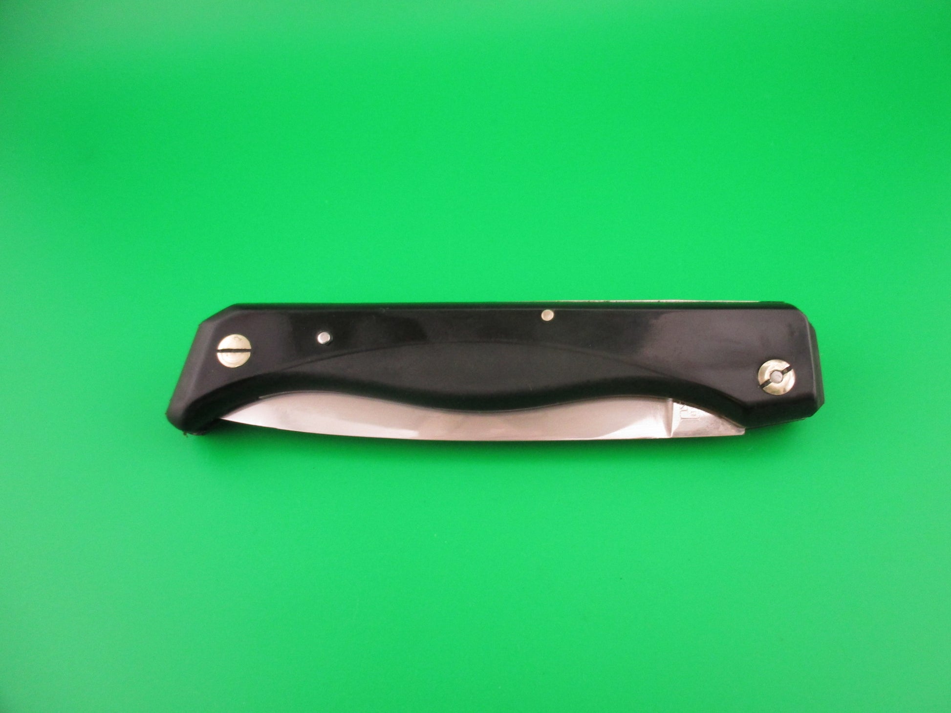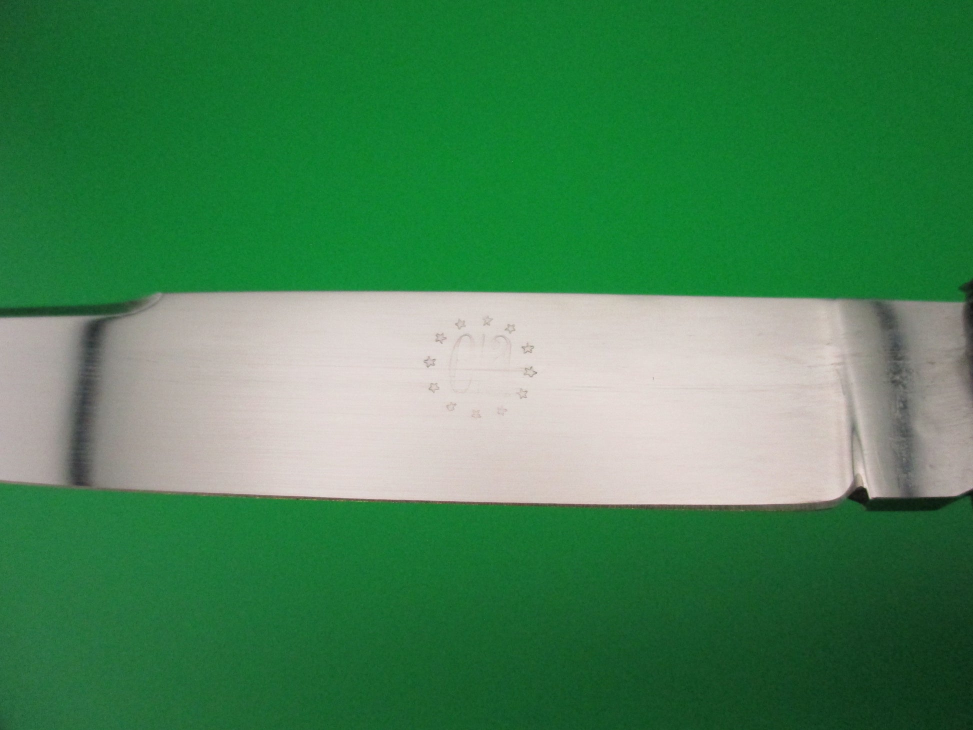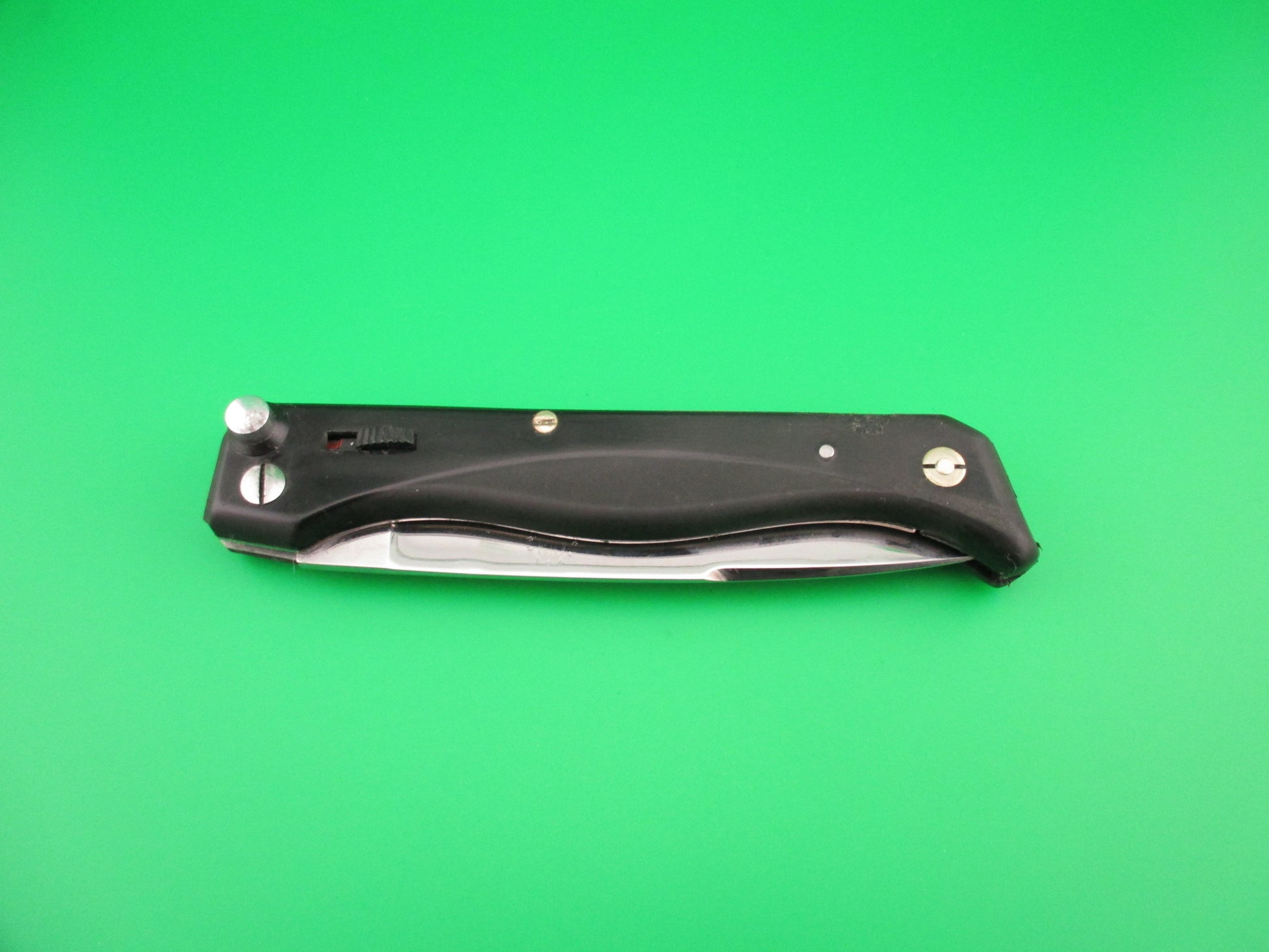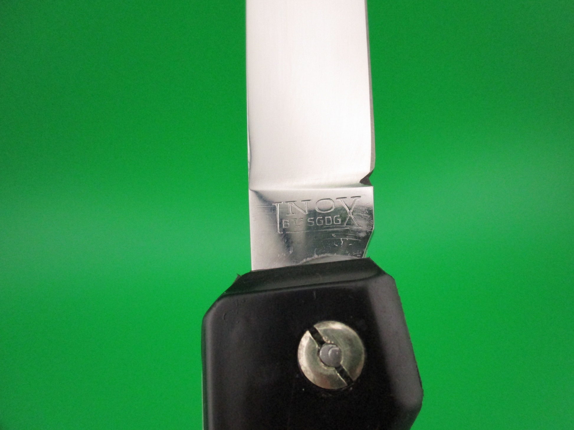 Nice old French Saut Ouvert switchblade knife measures 24cm (9.45 inches) open and 5.25 inches closed with steel liners & polished aluminum button. The flat grind swedge blade is 100% full with original blade finish and has an etch on the face that's a circle of stars with letters inside that look like "cIa" and the front of the ricasso is blank, but it is stamped INOX over BTE SGDG on the rear. The black synthetic scales are in good condition with minimal shrinkage & no cracks. but they do show light scratches and scuffs from handling see extra pic. The knife works well with the blade tip deep in the well, super Strong snap and Super Tight lockup open. The sliding safety works well. Nice old French switchblade in EX+ condition.