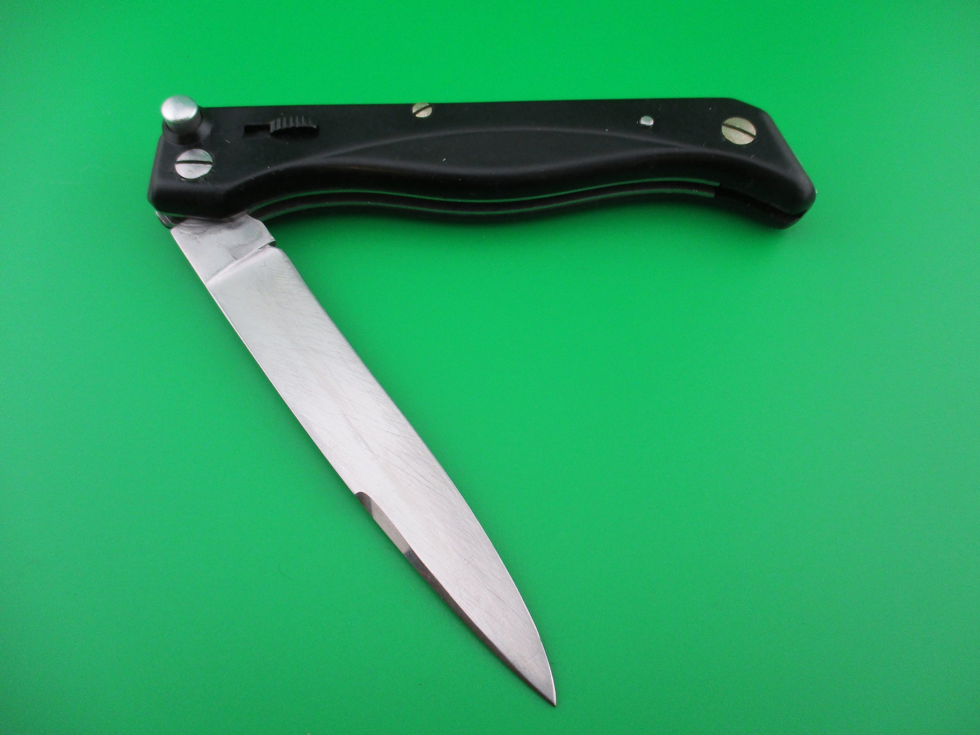 Nice old French Saut Ouvert switchblade knife. The knife measures 24cm open (9.5 inches) with steel liners. The flat grind swedge blade appears to be full and shiny with original blade finish and lots of light scratches from light use and is marked SAUT OUVERT along the spine. Front ricasso is not marked, but the rear is stamped INOX BTEG GDG. The black synthetic scales are in good condition with no shrinkage, or cracks. but they do show light scratches and scuffs from handling. The knife works well with the blade tip deep in the well, strong snap and nice lockup open. The sliding safety works well. Nice old French switchblade.