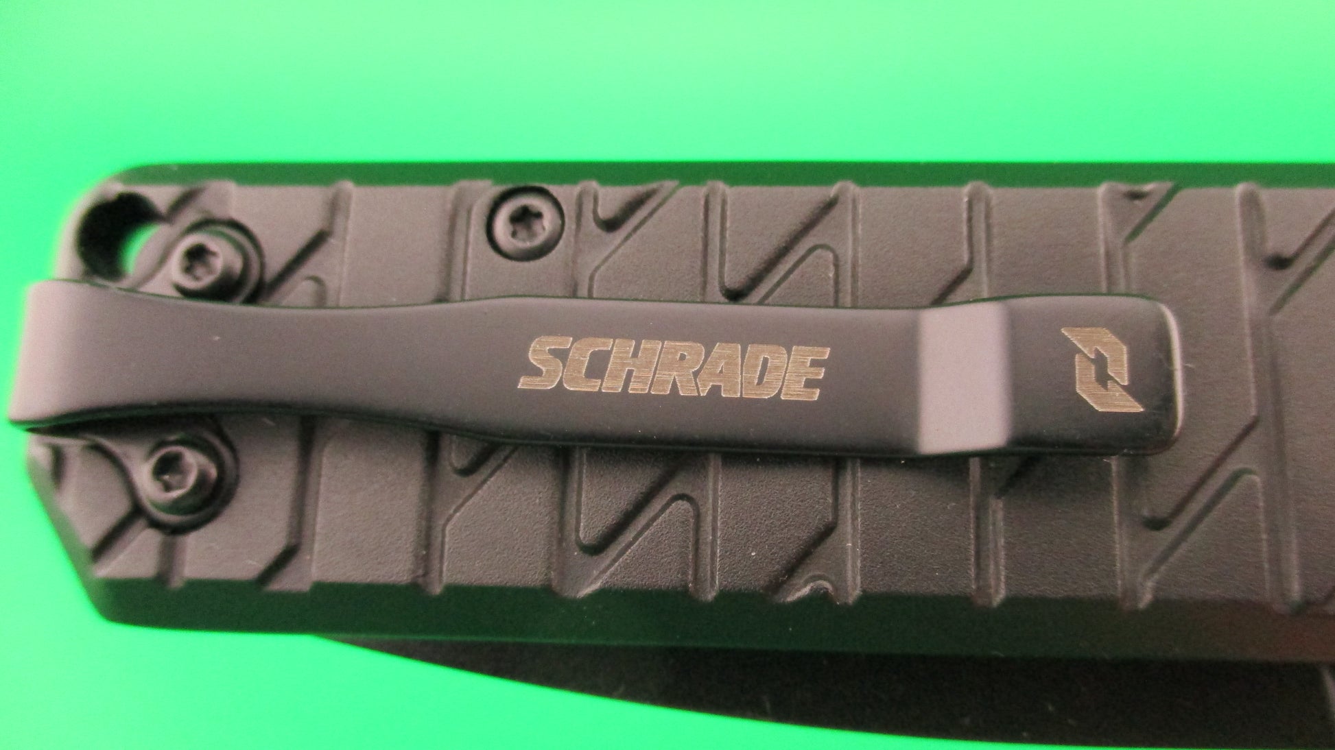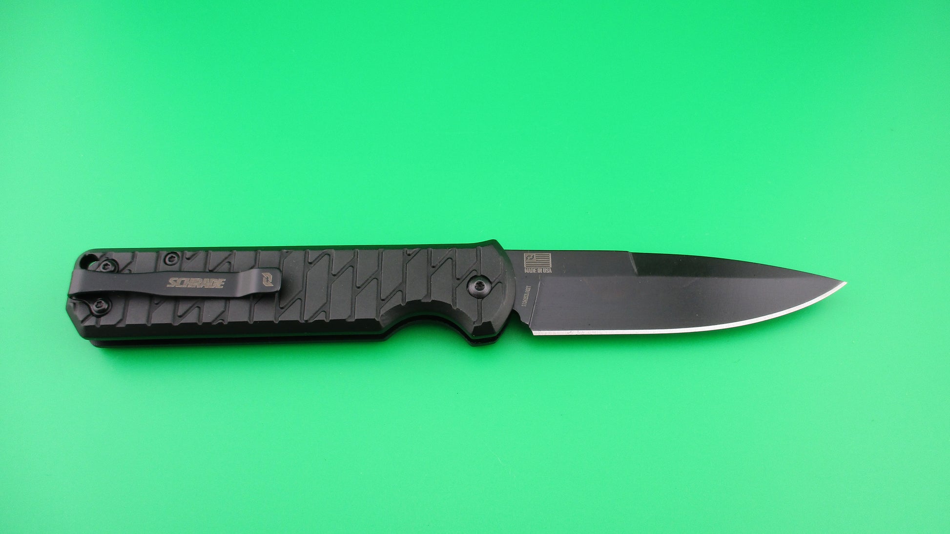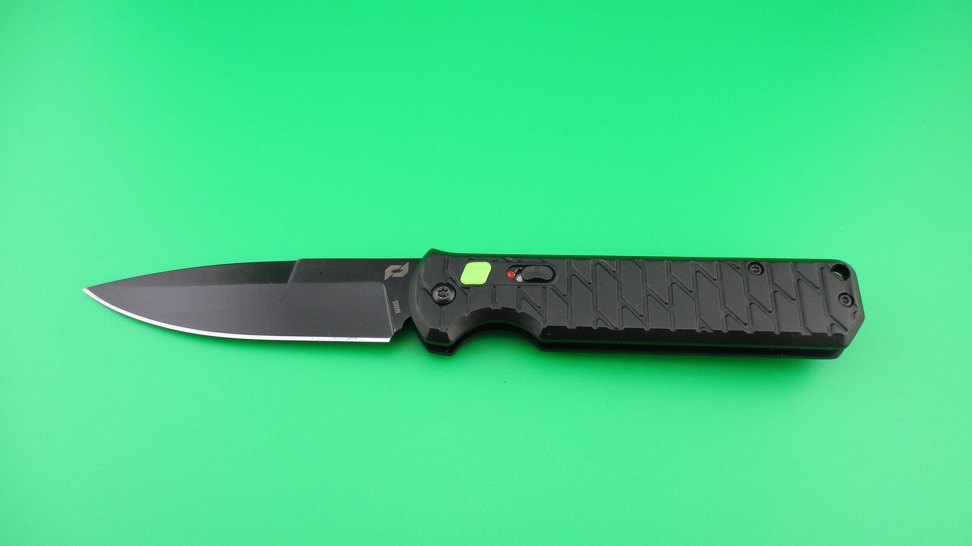 Prototype SCHRADE Alpha class ENTICE automatic folding knife with blade bayonet blade and Aluminum black frame and green button. I got this knife from the makers before these went into production a few years ago. They are now out of production and getting hard to find. Great quality knife! Strong snap and SOLID lockup! It measures 8 inches open and comes in the pouch that was provided by the makers. Safety works great. Like New!
