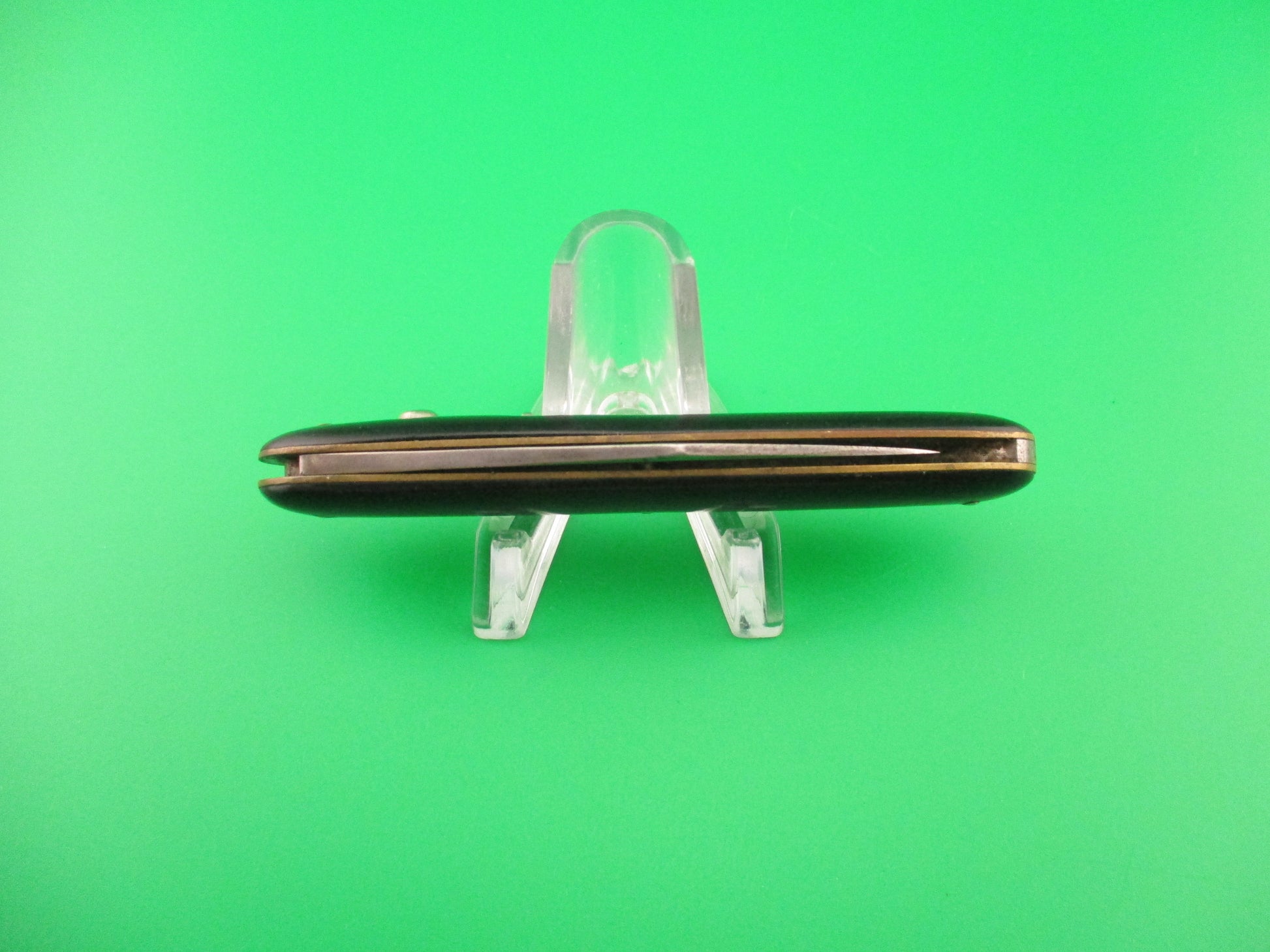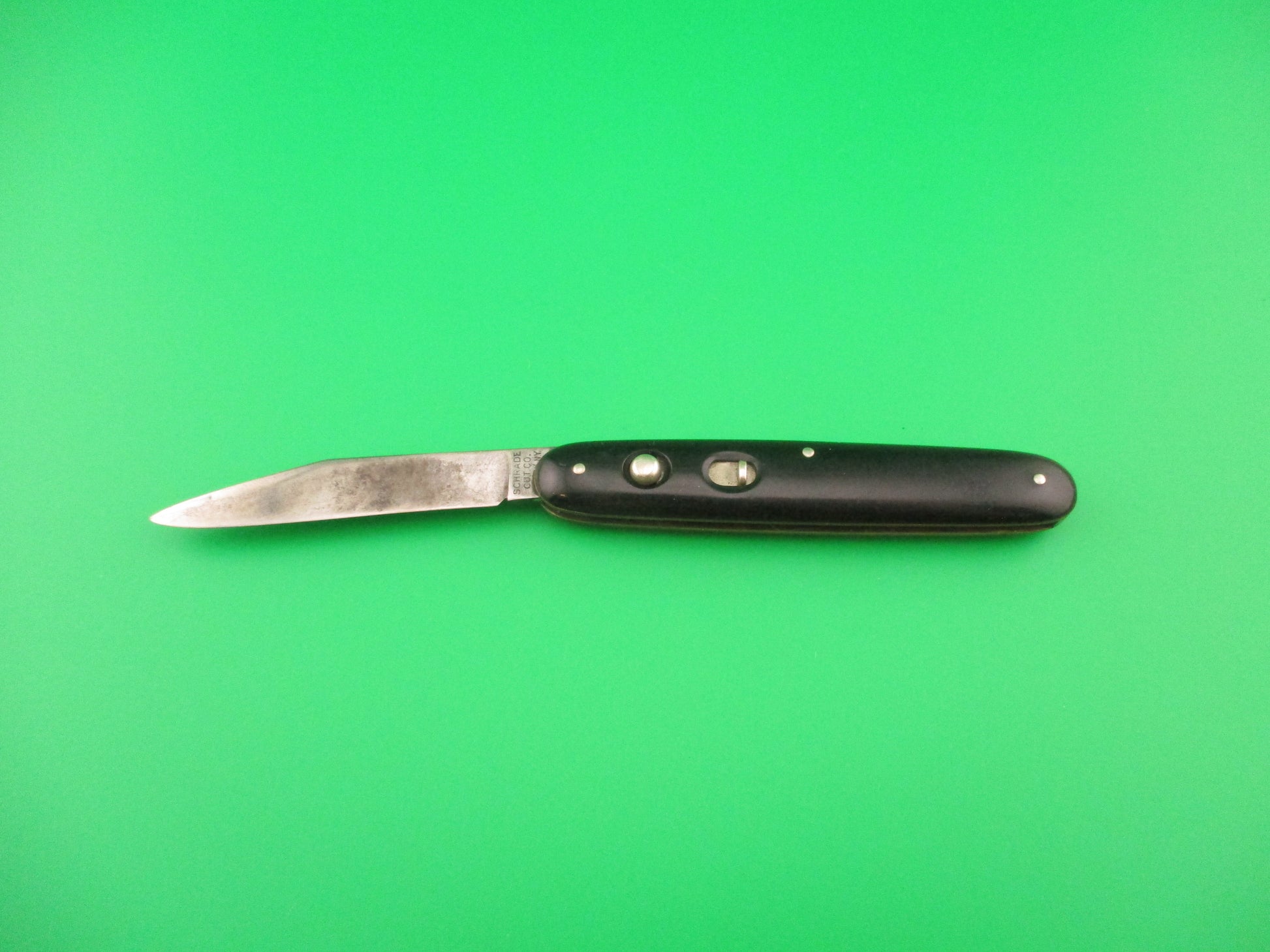 Schrade Cut Co 1404B Single Jack Black Celluloid switchblade knife made by the Schrade Cutlery Co of Walden, NY sometime between 1916 and 1946. This knife was designated the 1404B with black celluloid scales. It has one blade that is activated by pressing the button. The knife measures 3 3/8 inches closed and 5.75 inches open with brass liners and nickel plated button & safety. The blade is about 90% full with patina and some scratches and is stamped SCHRADE CUT CO WALDEN NY and three patent dates, 09,10 & 16 on the back of the tang. The scales are in very good condition with no cracks, just a few handling marks. The knife works well with tip below the liners closed, opens fully when button is pressed and locks open well with 1/8" up and down at the tip. Does rattle if shaken when open. These single blade Schrades are much less common than the doubles so a little more valuable. Safety works. VG condition.