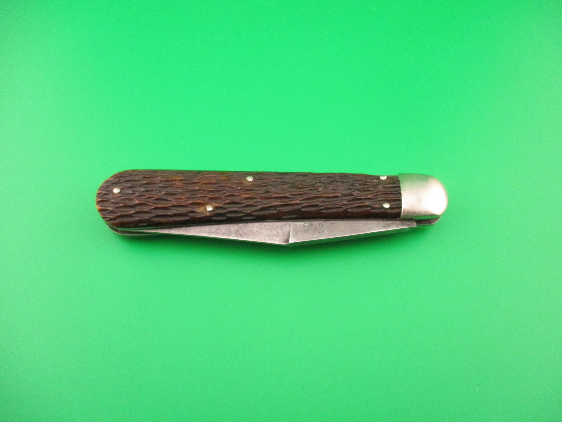 Schrade Cut Co #1613 3/4 large hunter switchblade with saber grind blade made in Walden, NY sometime between 1916 and 1946. This is the largest switchblade knife made by Schrade measuring 4 7/8" close and 8 3/4 inches open with steel liners and nickel silver bolsters, button, safety cap and spun pins. The Saber grind clip blade is 98% full with heavy patina and light spotting and the tang is stamped Schrade Cut Co Walden, NY. The backside has three patent dates DEC 21, 09, SEPT 13, 10 and JUNE 6, 16. The blade was likely originally etched "SCHRADE HUNTING KNIFE", but the etches were fragile and easily rubbed off. The dyed peach seed jigged bone scales are in excellent condition with no cracks and one small piece missing on the back scale near the bolster. The knife works well with the blade tip centered and below the liners closed, strong snap and good lockup with about 1/16" up and down at the tip. Rattles if shaken with blade open as most of these do that have been used over the years. Safety works. VG+ condition.