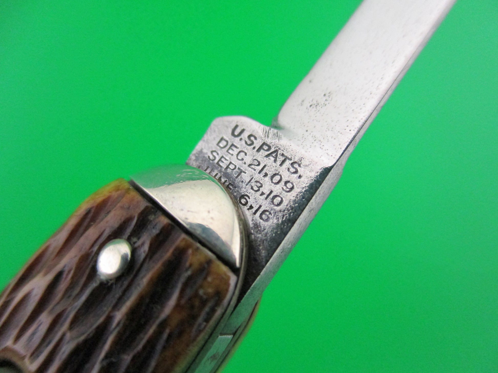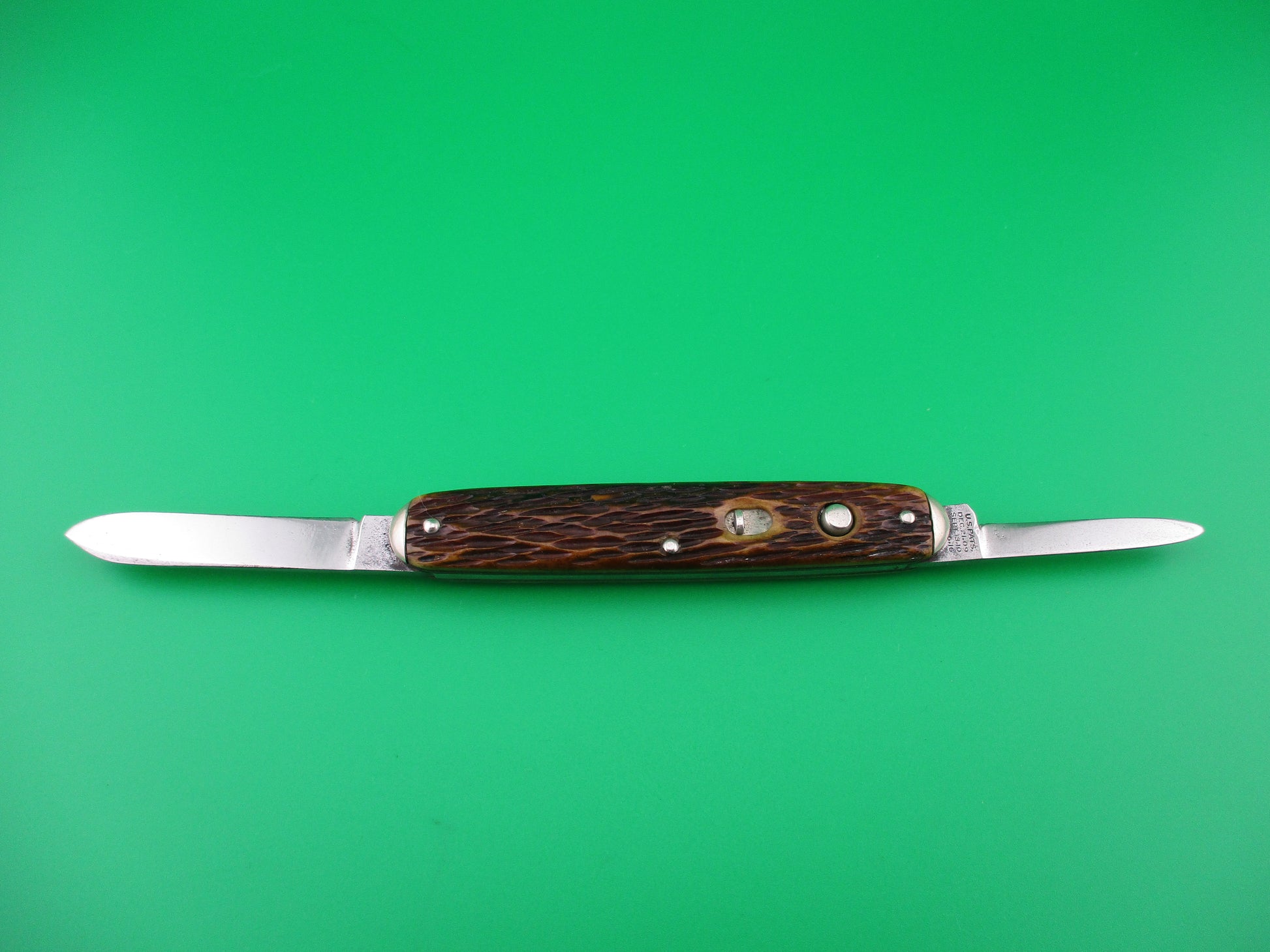 Vintage Schrade Cut Co medium double, pattern number 7403T that measures 3 3/8" closed and 7 inches open with brass liners. It was made by the Schrade Cutlery Co of Walden, NY some between 1916 and 1946. Main blade stamped Schrade Cut Co Walden, NY and the small pen blade is marked with three patent dates, 1909, 10 & 16. Both blades mostly full and shiny with light scratches and some light peppering. Jigged bone scales (handles) are in excellent condition. Works well with pen blade tip just above the liners closed, both blades open fully and good lockup with a little wiggle on the large blade. Tiny kickback on small blade so just have to nudge it fully open sometimes. Really nice old knife! Both safeties work. EX+ condition.