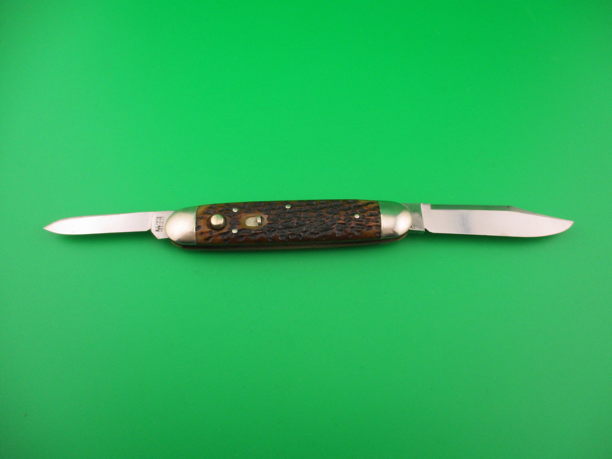 Gorgeous Schrade Cut Co large double with picked bone scales and full bolsters made in Walden, NY sometime before 1916 and was designated the model 7503 3/4B. This is the largest double that Schrade made measuring 3 3/4" closed and 8 3/16 inches with both blades open and has brass liners and nickel silver bolsters, button, safety & pins. The main clip swedge blade is 100% full with all of the original factory crocus finish the tang is marked SCHRADE CUT CO WALDEN NY on the front tang. The small pen blade is stamped US PATS FEB 13, 06 & FEB 26, 07 so likely made before 1910. The pen blade is also about 100% with all of the original factory finish! The dyed pick bone scales are in excellent condition with no cracks and the bolsters are nice. The knife works well with both blade tips well below liners closed, both open fully with some kickback on the small blade and both have excellent lockup open with only a hint of movement at the tips and no rattle if shaken with blades open. Both safeties work. Near mint condition. Wonderful example of a 100+ year old large Schrade double switchblade.
