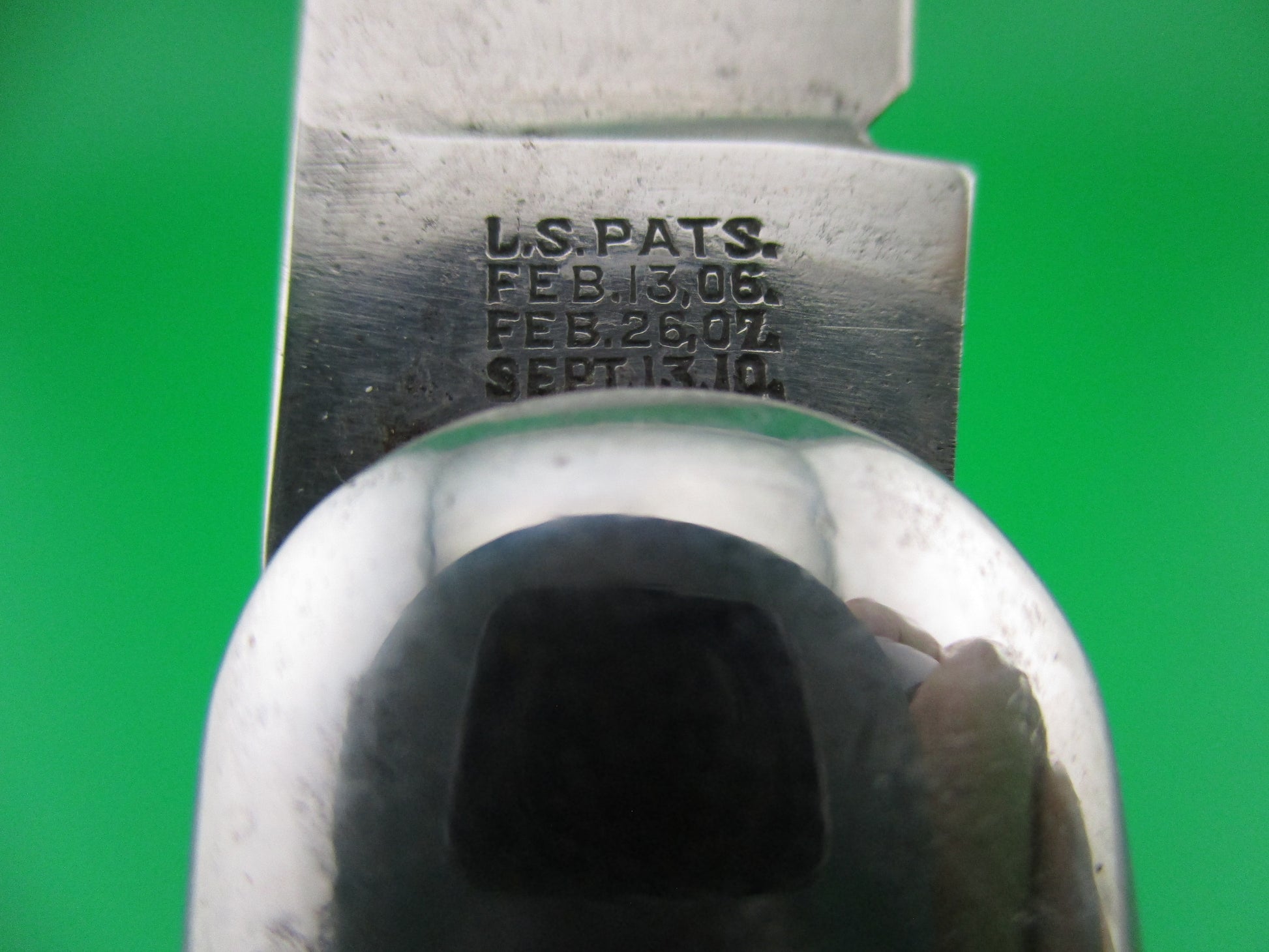 Schrade Cut Co large Hunter switchblade with picked bone scales (handles). This is the largest switchblade knife made by Schrade measuring 4 7/8" closed and 8 3/4" open with steel liners & bolsters and nickel silver button & safety cap. It was designated the model 1543 3/4 and this early version was made in Walden, NY sometime between 1910 and 1916. The blade is stamped SCHRADE CUT CO WALDEN, NY on the front and three patents on the rear of 06, 07 & 10. The blade is 99% full with patina lots of light scratches and some spots. Really nice blade. The picked bone scales are held on with brass pins and are gorgeous and in near perfect condition with one tiny hairline crack by a pin on rear scale. The knife works great with the blade tip seating deep in the well when closed, strong snap and locks open TIGHT. Safety works. EX+ condition.