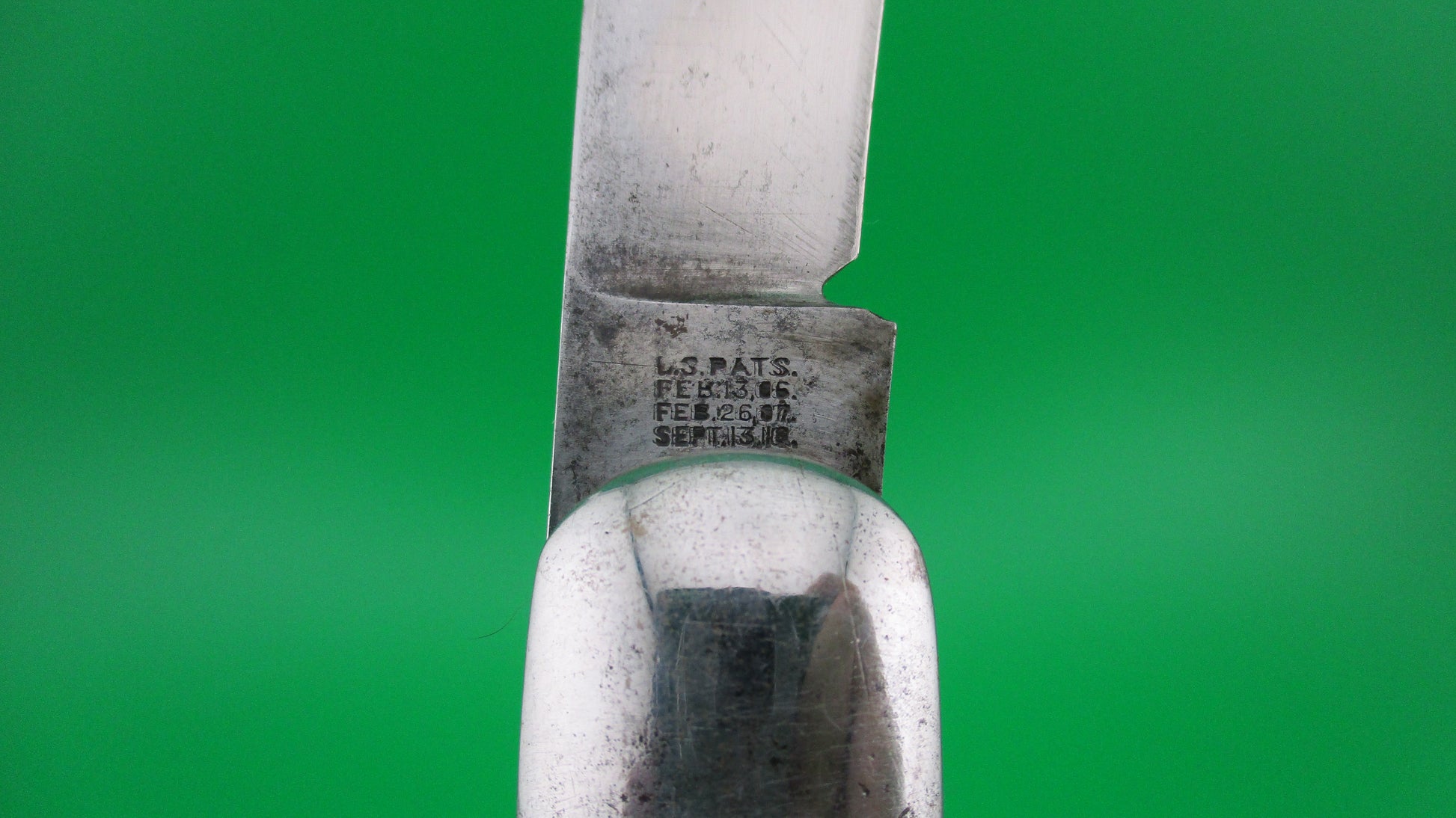 Schrade Cut Co large Hunter switchblade with zig zag jigged bone scales (handles). This is the largest switchblade knife made by Schrade and was designated the model 1543 3/4. This early version was made in Walden, NY sometime between 1910 and 1916. It measures 4 7/8" closed and over 8.5 inches open with steel liners and bolsters and nickel silver button and safety. The clip blade is stamped SCHRADE CUT CO WALDEN, NY on the front and US PATS Feb 13, 06, Feb 26, 07 & SEPT 13, 10. The blade is 94% full with patina lots of light scratches and some spots. The Zig Zag jigged bone scales are held on with brass pins and are gorgeous and in nice condition with one little piece of bone missing on the back scale by the bolster. The knife works great with the blade tip seating deep in the well when closed, strong snap and locks open well with 1/8 inch up and down at the tip. Safety works. VG+ condition.