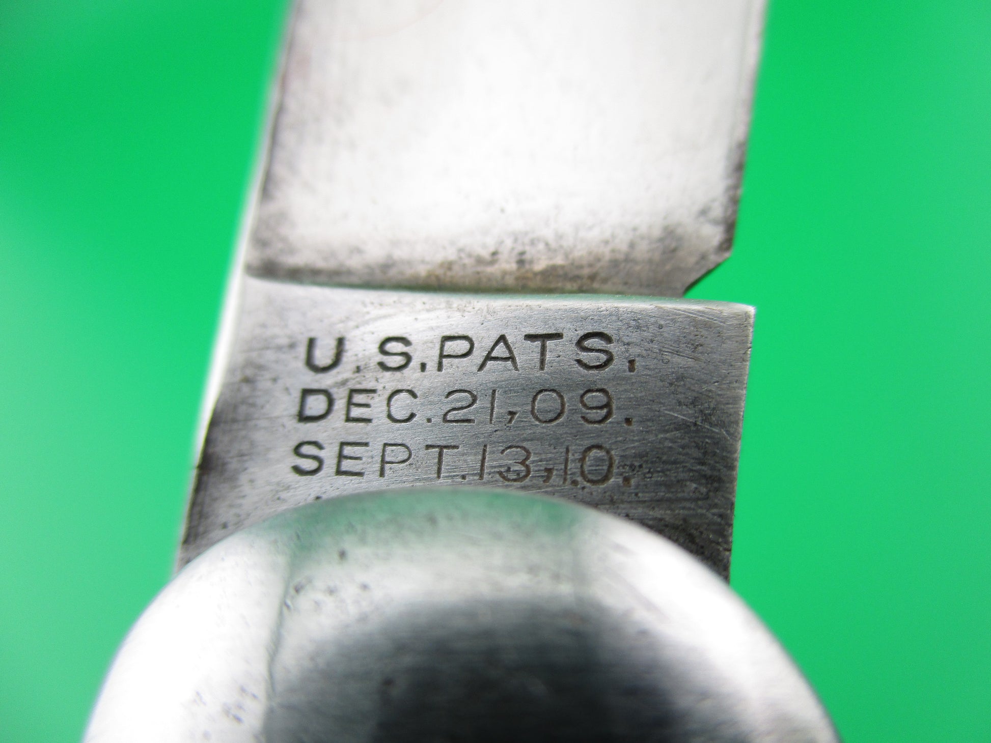 SCHRADE CUT CO M2 Bone WWII Paratrooper Military issue switchblade knife. This knife was made in Walden NY in the 1940s by the Schrade Cutlery Co under contract with the US Government and issued to soldiers during the war. It measures 4.25 inches closed and 7 3/8" open with steel liners, bolsters and lanyard ring (staple). The blade is 99% full and shiny with light scratches and is stamped SCHRADE CUT CO WALDEN NY on the front tang and US PATS DEC 21, 09, SEPT 13, 10 & JUNE 6, 16. The jigged bone scales are perfect. The knife works great with the blade tip seating deep, strong snap and good lockup open. EX+ condition.