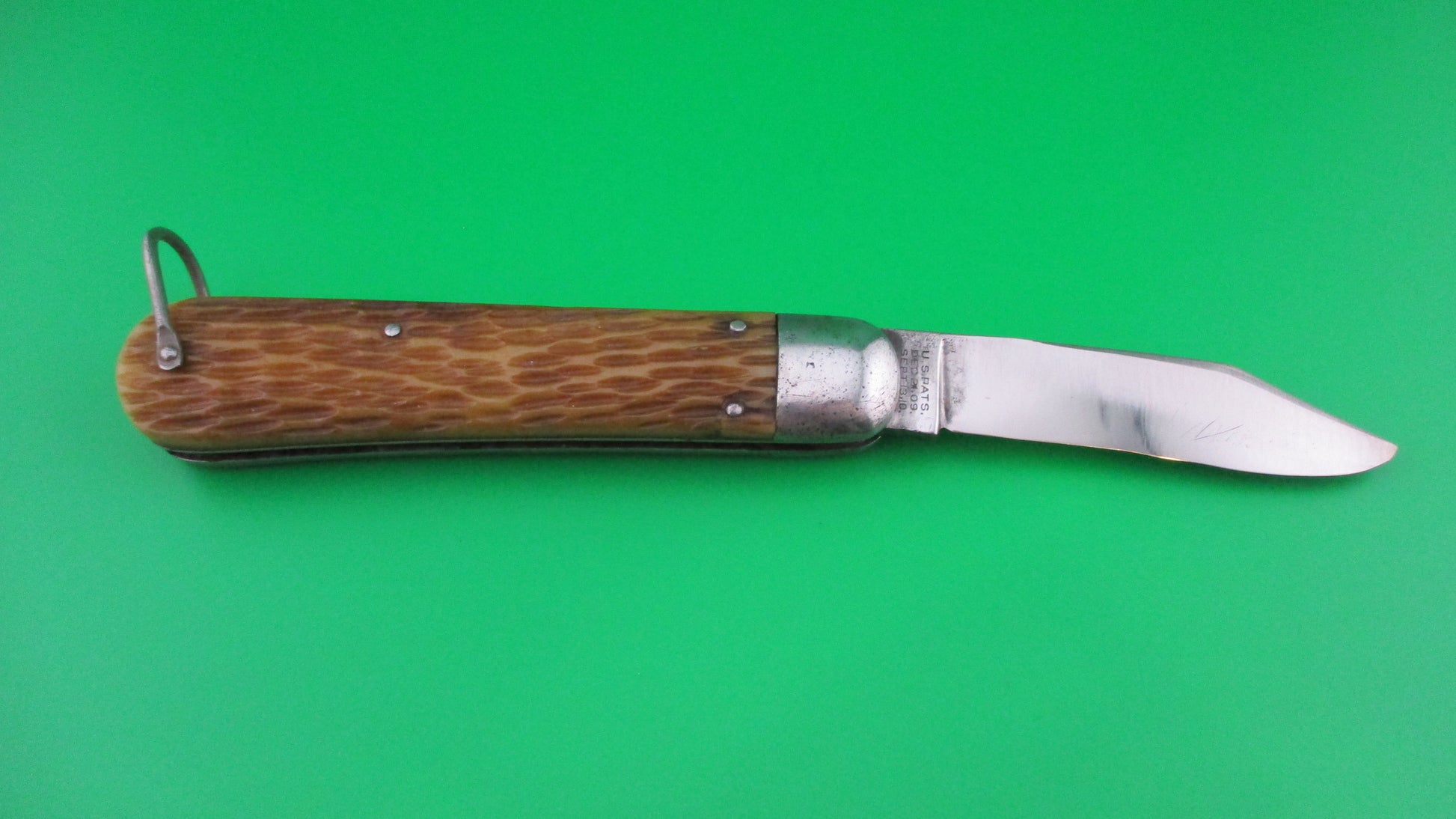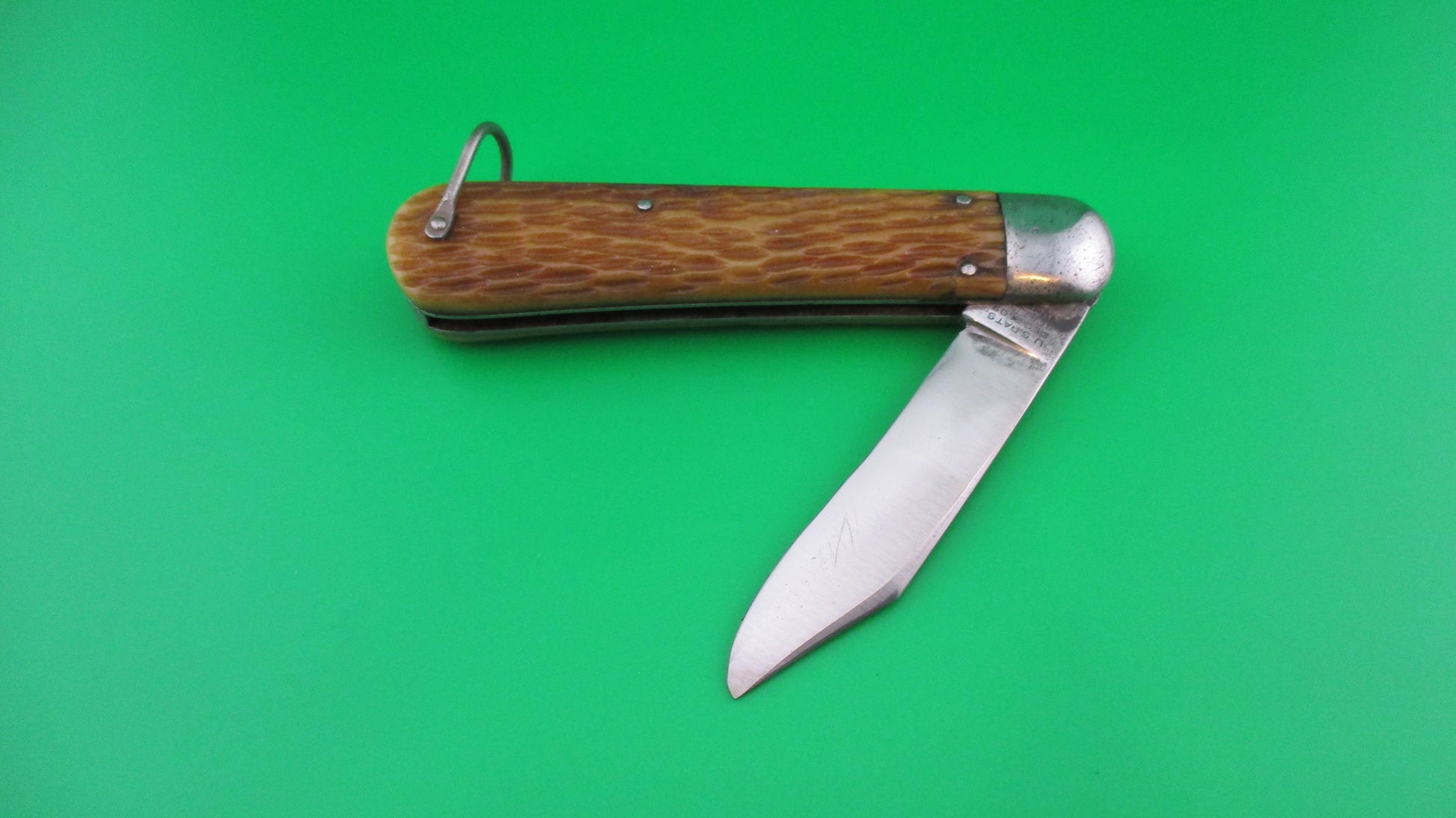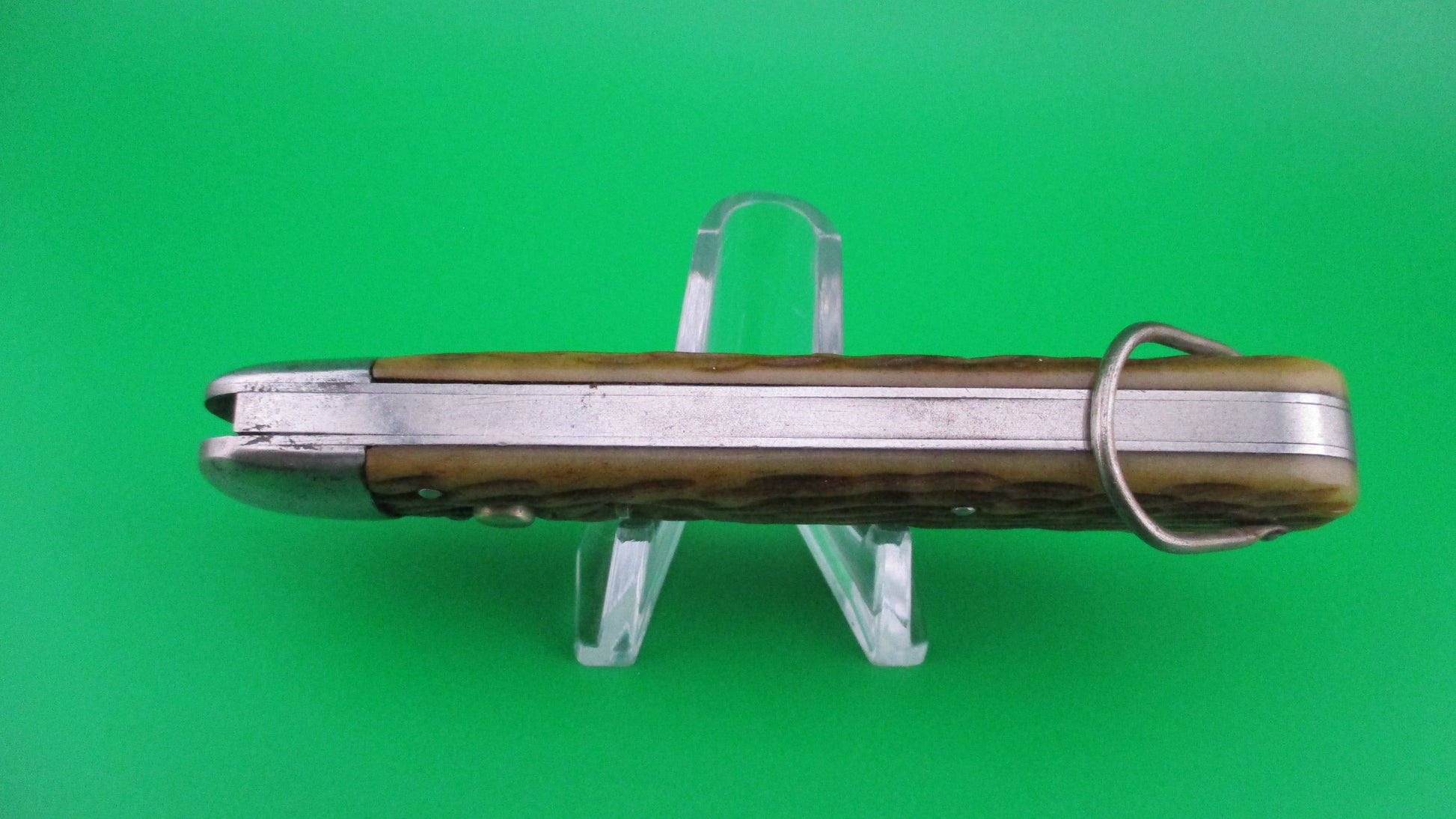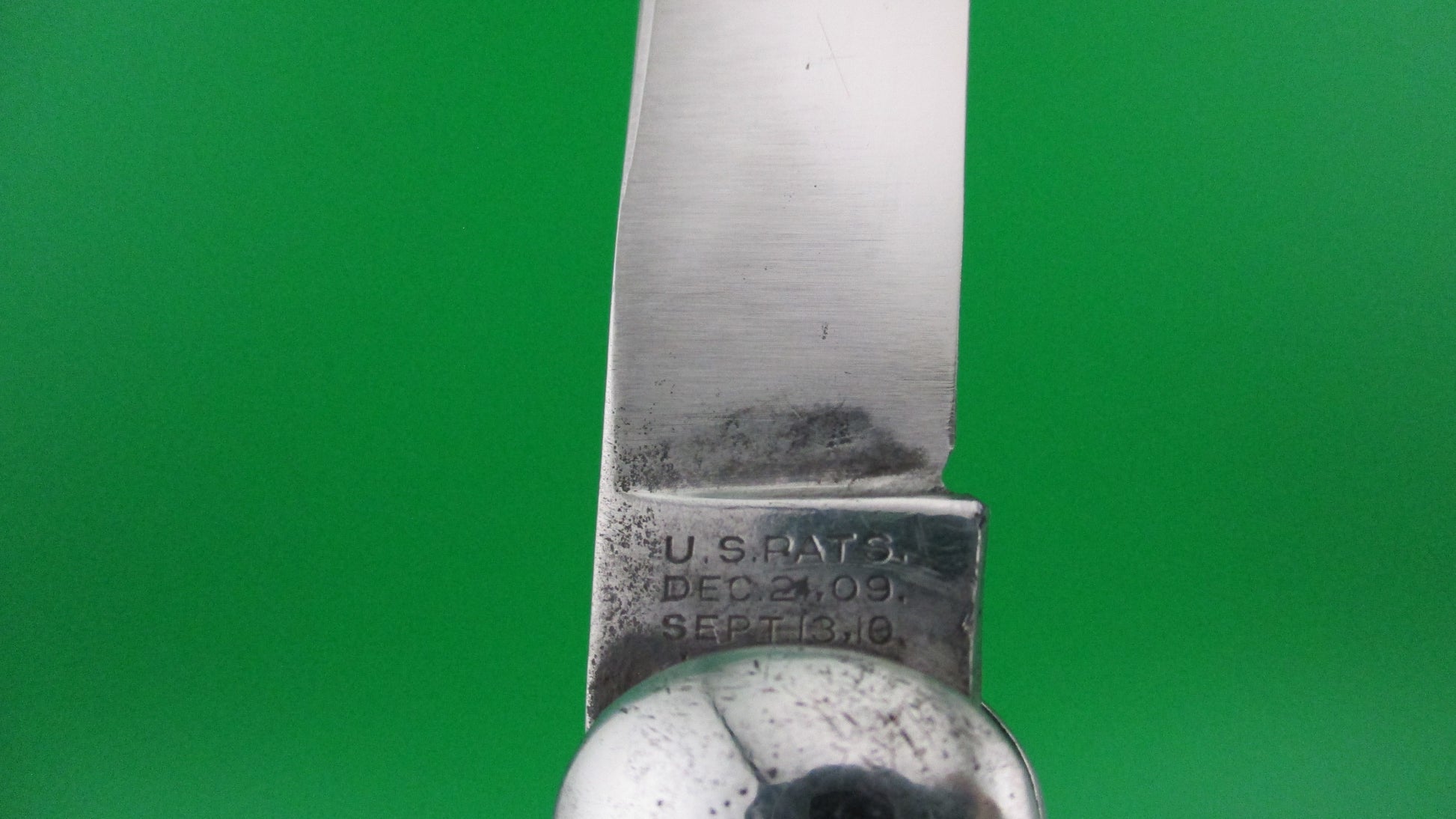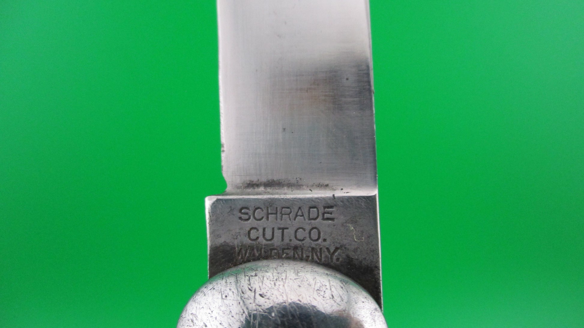 Vintage SCHRADE CUT CO M2 Bone handled WWII Paratrooper Military issue switchblade knife. This knife was made in Walden NY in the 1940s by the Schrade Cutlery Co under contract with the US Government and issued to soldiers during the war. It measures 4.25 inches closed and 7 1/8" open with steel liners, bolsters and lanyard ring (staple) and nickel silver button and safety. The blade is 92% full about 3/8" short and shiny with light scratches and is stamped SCHRADE CUT CO WALDEN NY on the front tang and US PATS DEC 21, 09, SEPT 13, 10 & JUNE 6, 16. The light colored jigged bone scales are in excellent condition. The knife works great with the blade tip seating below liners, strong snap and good lockup open with a little movement each way. Safety does not work properly. VG+ condition.