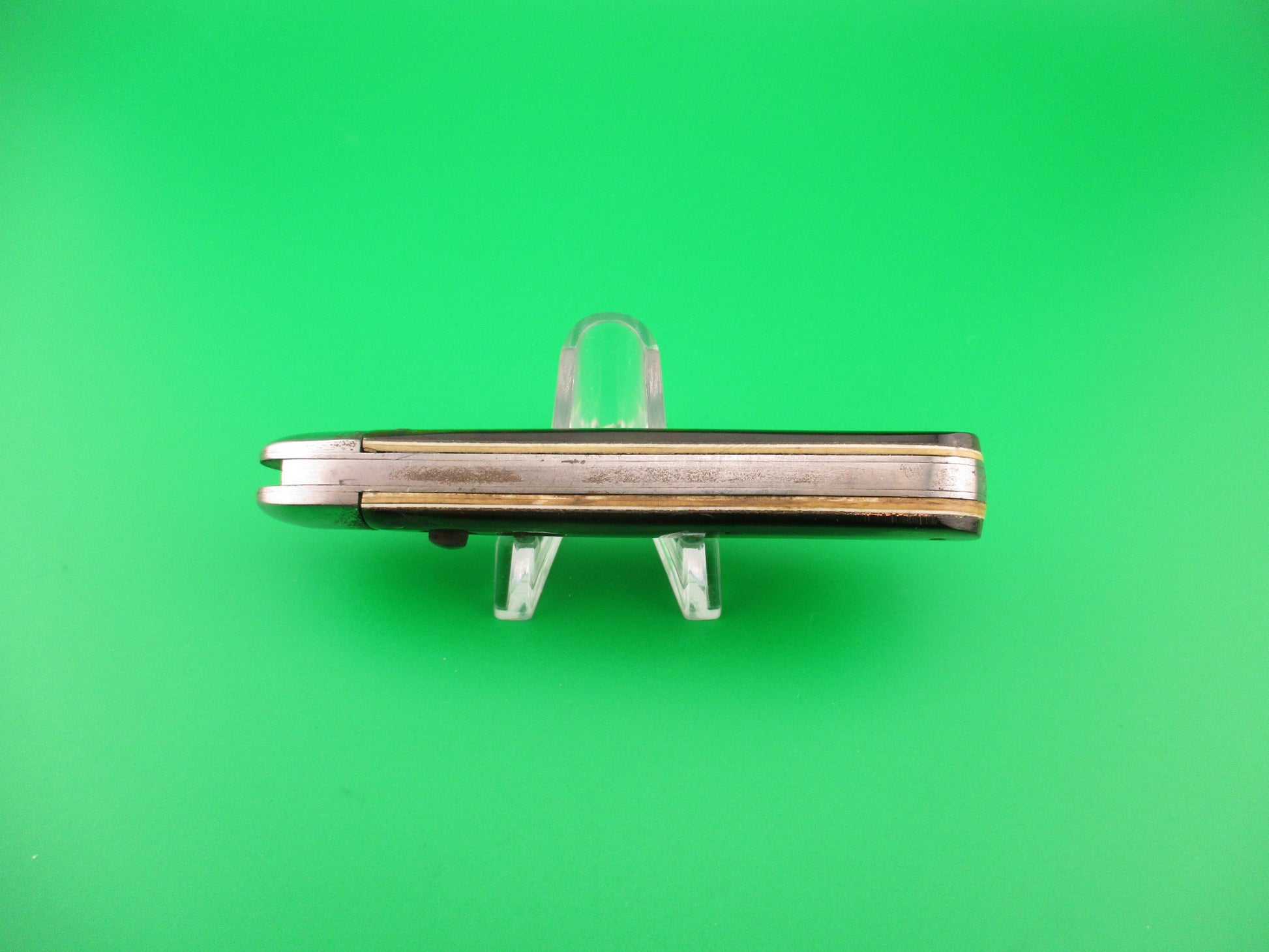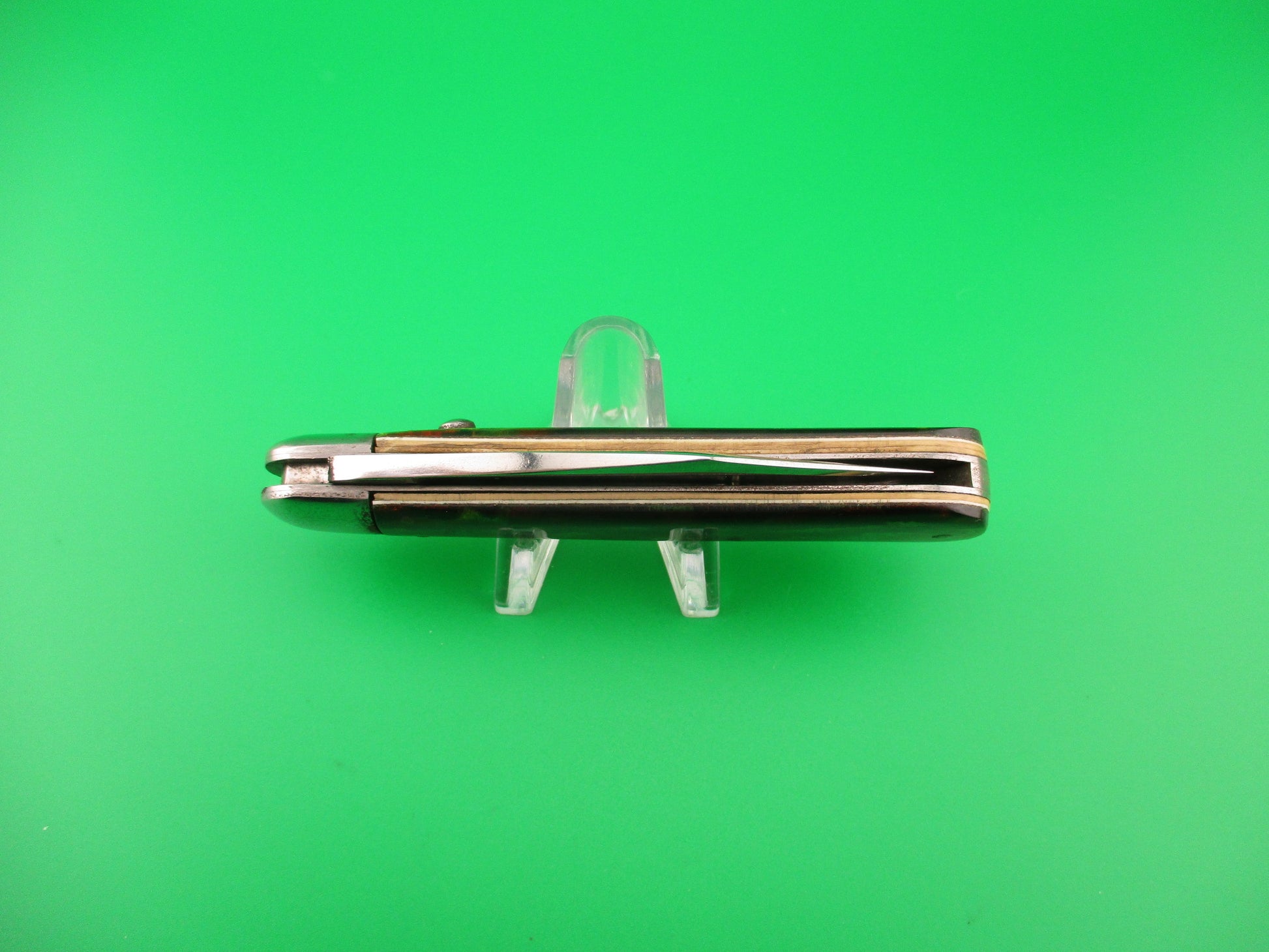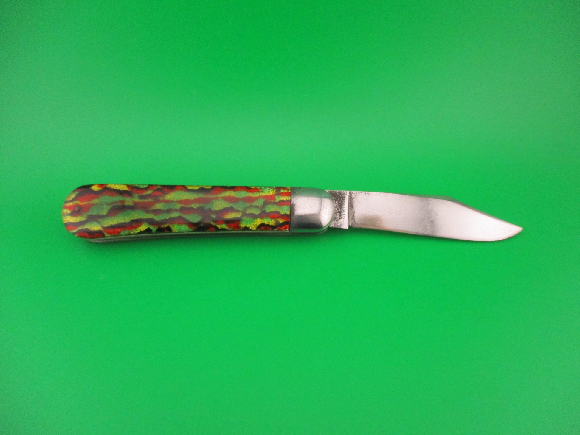 SCHRADE CUT CO Scout Christmas Tree Celluloid vintage automatic knife made in Walden, NY between 1916 and 1946. The knife measures 4.25 inches closed and 7.25 inches open with brass liners and steel bolsters & button with nickel silver safety. The clip point blade is 97% full or better and shiny with lots of light scratches and the tang is stamped SCHRADE CUT CO WALDEN NY and the reverse is US PATS DEC 21, 09, SEPT 13, 10 and JUNE 6, 16. The handles (scales) are not original to the knife. They have been nicely replaced with Christmas tree celluloid at some point and are Very attractive and in excellent condition. The knife works great with blade tip below liners and centered closed, good snap and good lockup with less than 1/8 inch up and down at the tip. Safety works. EX- condition.